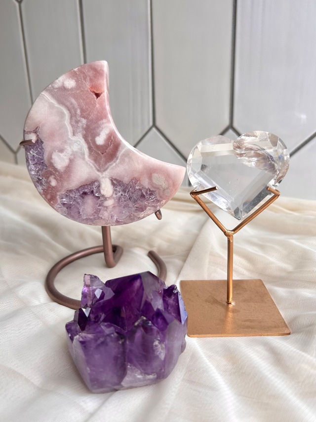 ご好評頂いております当店の看板商品・手のひらの宝物セット♪ コツコツ集めたピンクアメジスト大放出につき、手のひらの宝物セットにもピンクアメジストが登場です^_^ 希少なバイカラー(ピンク×パープル)ピンクアメジストのロマンティックなムーンカービング!!にブラジル産のレムリアンクォーツのフェイステッドハート、母石やバサルトの無い珍しいアメジストクラスターの3点セット、もうドリーミーを極めたような 可愛いすぎるセット内容なんです♪ ブラジル産ピンクアメジストムーンは全体がキラキラと煌めき、ピンクとパープルのバイカラーピンクアメジストのロマンティックな色合いは幾つあってもコレクションしたくなる沼カラーです 笑 ブラジル産アメジストは母石やバサルト部分を削りとり、アメジストクラスター部分のみを残した珍しいピース、側面をポリッシュしており光に透かしてみるとアメジストの深く美しいパープルカラーにうっとり。チューリップのようなフォルムも可愛いらしいピースです♪ (セミポリッシュですが、ラフな仕上がりでカケた部分など側面は鋭利な部分がありますのでお取り扱いにはご注意下さいませ) ブラジル産のレムリアンクォーツはバイーア州 セントセ産。透明度抜群の水晶に施された美しいカットによって、天使の翼のような模様が浮かび上がる胸きゅんピース!お写真の角度を参考に見つけてみて下さいね♪ 動画は当店Instagramハイライトよりご覧いただけます https://www.instagram.com/s/aGlnaGxpZ2h0OjE4NTE3NDcxNjkzMDQxNjg0?igsh=MWxzdGZ5ZjV6NWdxdw== Size ピンクアメジストムーン スタンド付 (スタンドは海外の業者さんのもと手作り品ですので塗装のラフさ剥がれ、小傷あり品です) 長さ約11㎝ 厚み約2.6㎝ 重さ約442g ・レムリアンクォーツ フェイステッドハート スタンド付(スタンドは海外の業者さんのもと手作り品ですので塗装のラフさ剥がれ、小傷あり品です) 縦約5.2㎝ 横約5.7㎝ 厚み約2.2㎝ 重さ約85g ・アメジスト セミポリッシュ 高さ約5.3㎝ 横幅約6.2㎝ 奥行き約4.2㎝ 重さ約196㎝ ※ ご購入の前に必ずお読み下さいませ※ お手数ですが合わせてショップ規約もお読み下さいませ。(未読の場合に起きたトラブルに対しては対応できませんのでご留意下さいませ) 商品に欠陥がある場合を除き、サイズ感や色がイメージと違うなどのお客様都合による返品交換、ご注文後のキャンセルは対応致しかねます。 商品お写真は全ての箇所を掲載しきれない場合もございます。鉱物は内包物の色や表面のカラー、クラック、小さな穴や欠け等かが写りきらない場合もございます。海外研磨の石にはバラつきがございます。ポイントも先端が鋭利に尖りきっていないもの、研磨されたものであっても欠けがあるものもございます。パイライトなど硫化鉱物全般に言えることですが、水分と反応して徐々に酸化されていき硫酸を生成するため湿度を嫌います。皮膚の弱い人は直接肌に長時間触れないようご注意下さい。ケースに入れての保管、触れて鑑賞を楽しんだ後は手洗いをするなどしてお楽しみ頂ければと思います。天然石はぶつけたり落とした衝撃でも割れたり欠けてしまいます。お取り扱いには充分ご注意下さいませ。そういった天然石の特性をご理解ご了承頂けます方のみご購入をお願い致します。気になる箇所がございます場合はご購入前に必ずお問い合わせ下さいませ。天然石は直射日光や湿気などで退色、劣化しますので置き場所にはご注意下さい。お届け後の使用や保管による劣化や割れ、欠けなどは各自自己責任となります。一緒に撮影に使用している他の鉱物やアクセサリー、インテリアなどは付属致しません。 お使いのPCモニターや携帯によっては色の写りが違ってみえる事もございます。カラーが違ってみえたなどのお客様都合による返品は受け付けておりませんのでご了承下さいませ。 ********************* 「Trésor de la paume 」mineral ・手のひらの宝物 目で楽しむ鉱物の世界。特に色や形など美しい鉱物にこだわって集めました。 どの鉱物も手のひらサイズでキラキラと輝く石、透き通った氷のような石、お菓子のような石と色々な表情をしています。 空間の浄化や鉱物の美しさをお楽しみ下さい。