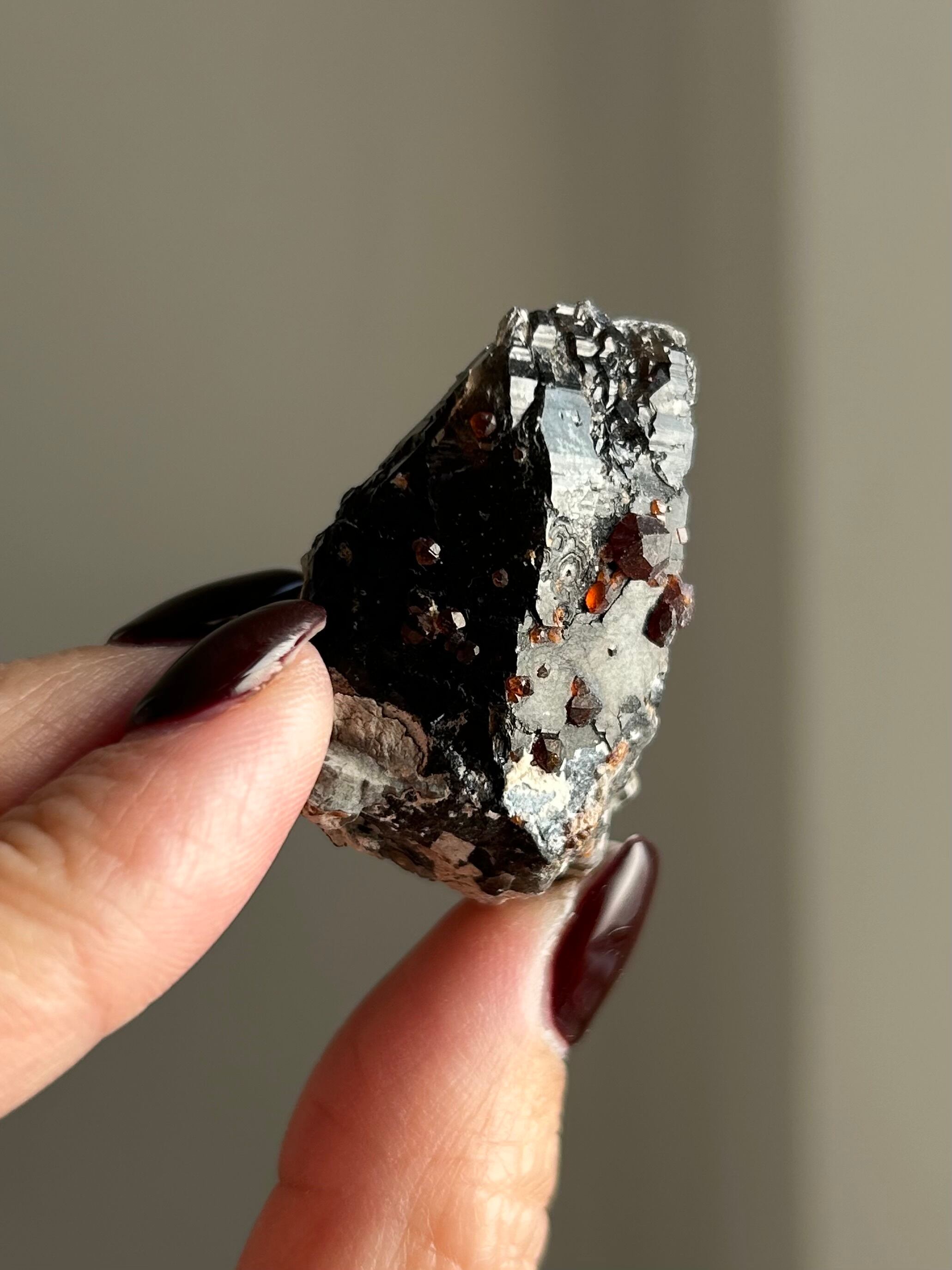 (共生しているスペサルティンガーネットは少しの衝撃で結晶が剥がれてしまう為、お取り扱いにはご注意下さい)