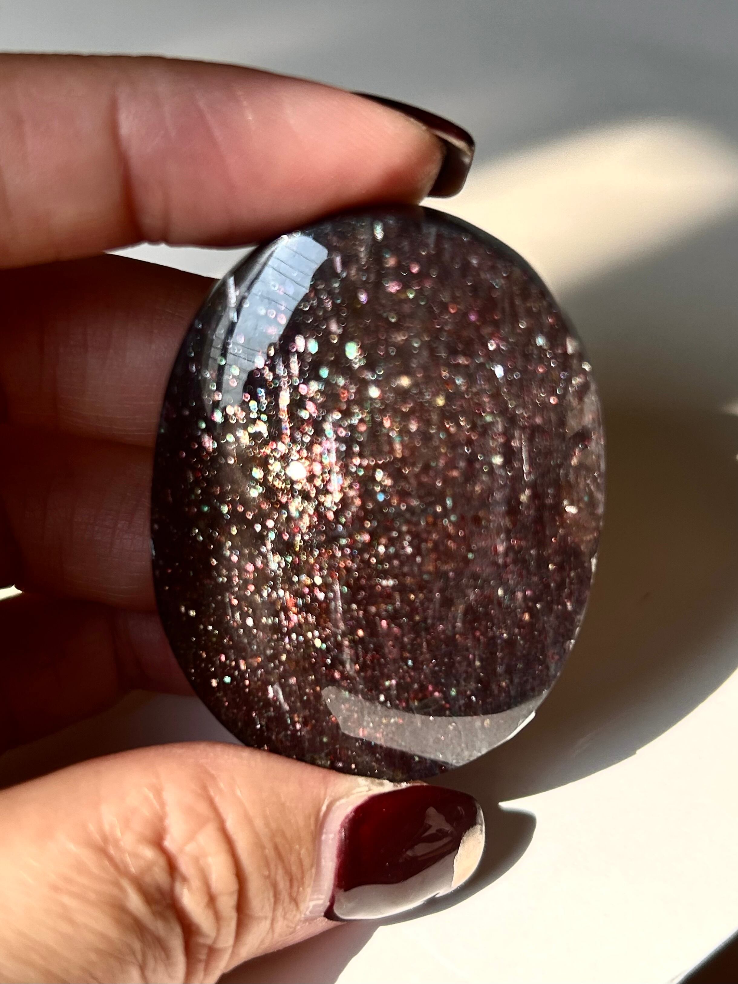 Bのパームストーンはヒュン!と流れるレッセンスの煌めきが流れ星のような美しいピース。暗い場所では石の色ムラが少ない全体的に深い澄んだネイビーカラー、多色性をもつストーンですので、角度を変えながら明るい場所や光にかざすと、その透明度から澄んだ青紫色、違った角度によってはオレンジっぽくも見えます。なんといってもこの透け感!透明感があり、濃いカラー、ラメの輝きが強いもの(多いもの)ほど品質が良くなる訳ですが、その条件を兼ね備えたスペシャルなピースなんです♪ 直接ライトを当てたお写真ではその透明度がご覧頂けます^_^ (ライトでなくとも日中の太陽光にかざすだけで無数のレピドクロサイトの赤が浮かんでいるのが目視できます♪)