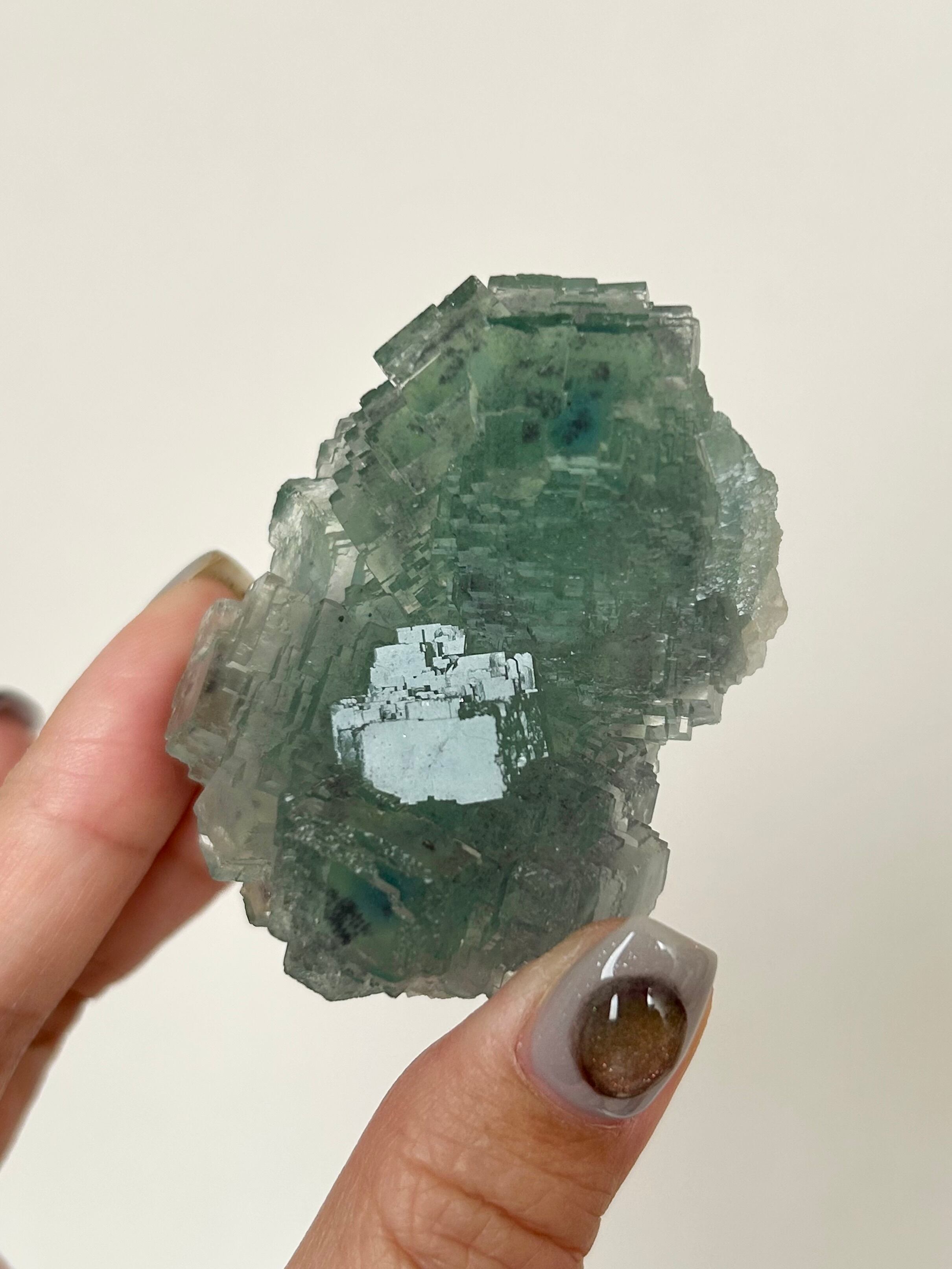 福建省産 美しいグリーンカラーのステップフローライトのご紹介です。石段のような細かな階段状のフォルムも瑞々しいフレッシュならグリーンカラー、艶やかな表面、コアの部分のインクを落としたように浮かんでいるブルーカラー、美しい!!とにかく美しいフローライト原石です。キューブの中に1粒だけですがきらりと光るパイライトの粒もチャームポイントなピース♪ライトに透かしても、手のひらの上で眺めてもどちらの表情もたまらなく美しい!