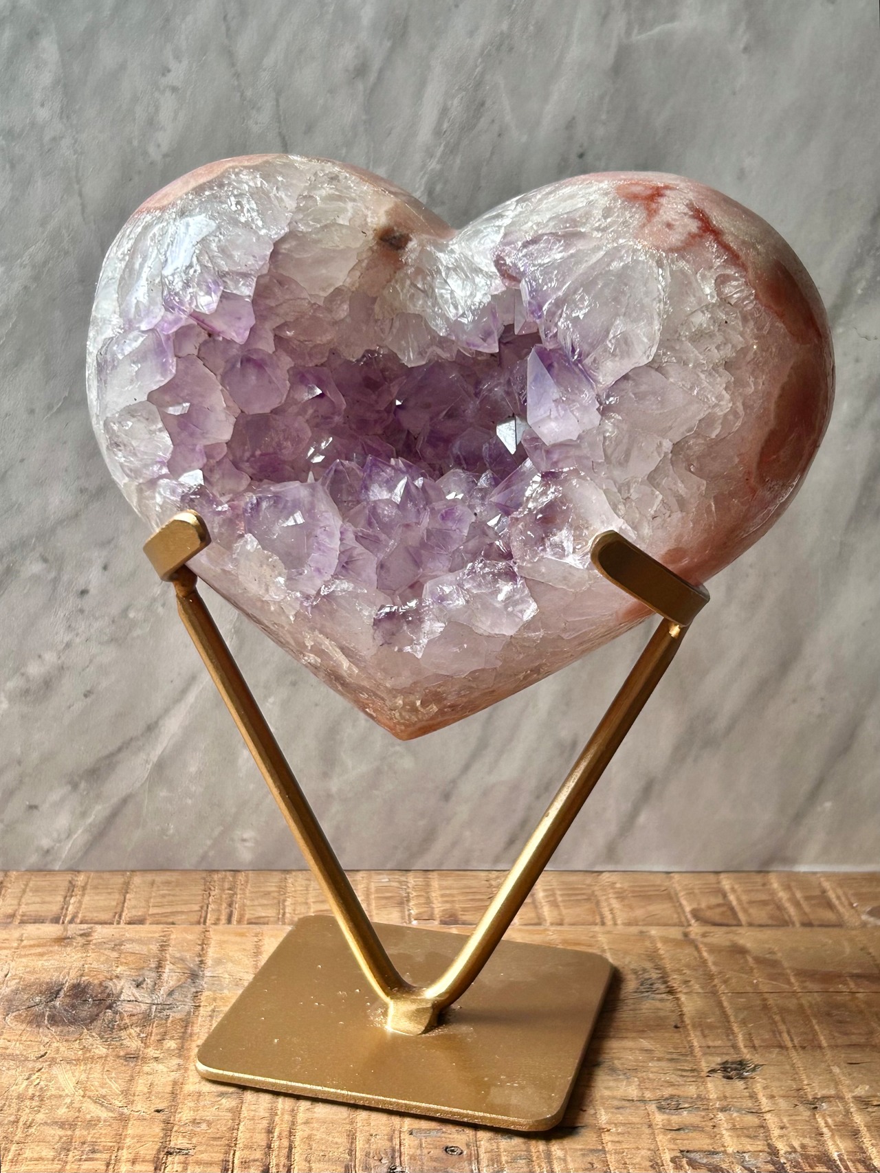 こちらのピースはまぁるいコロンとしたフォルムのハート型にカービングされたバイカラーピンクアメジスト♪ずっしり2キロオーバーのボリューム満点のBIGピース。アメジストを包み込むようなフォルムと淡いパープルとサーモンピンクカラーの組み合わせは優しさと安らぎに満ちた空間作りにぴったりな