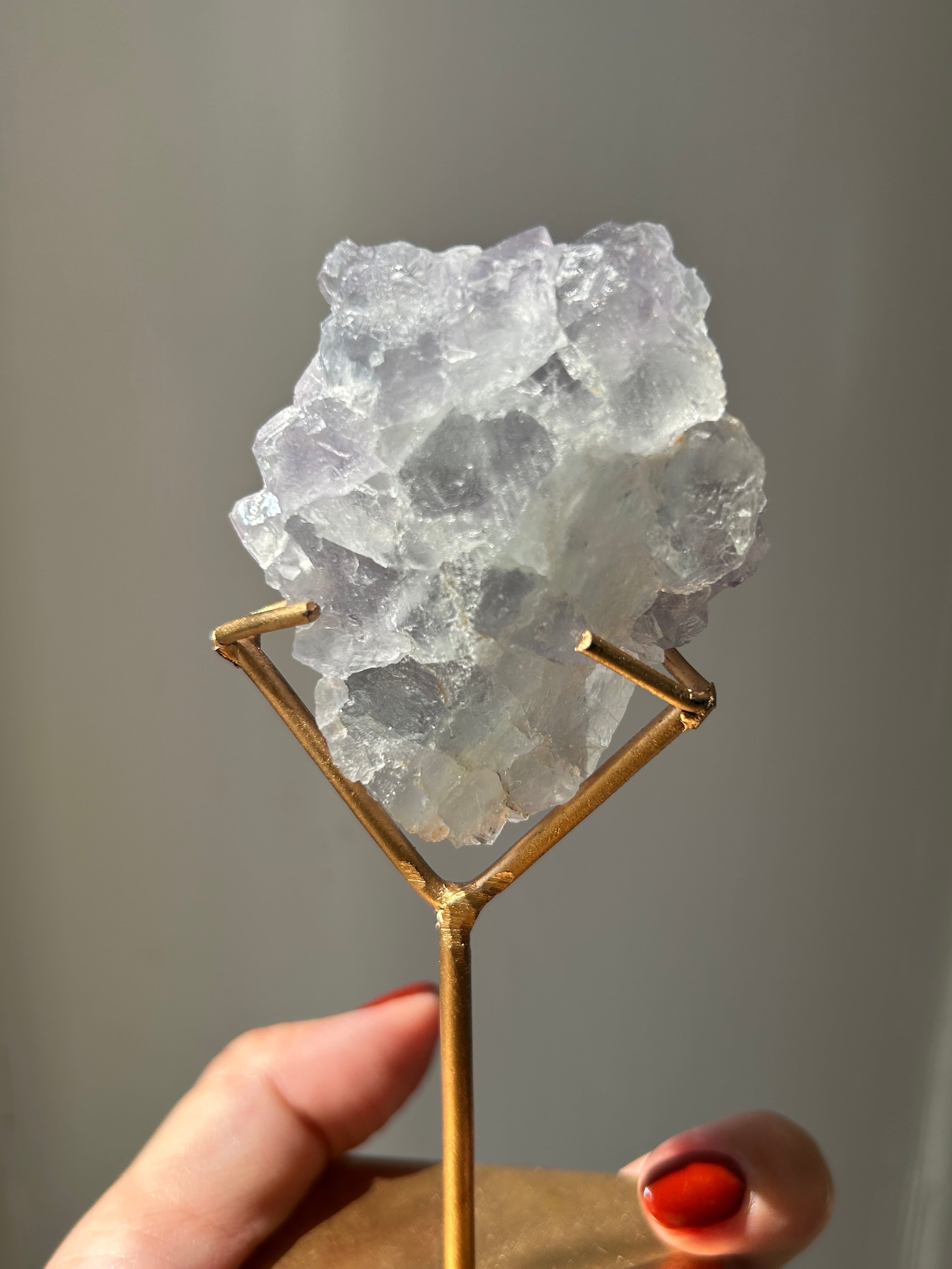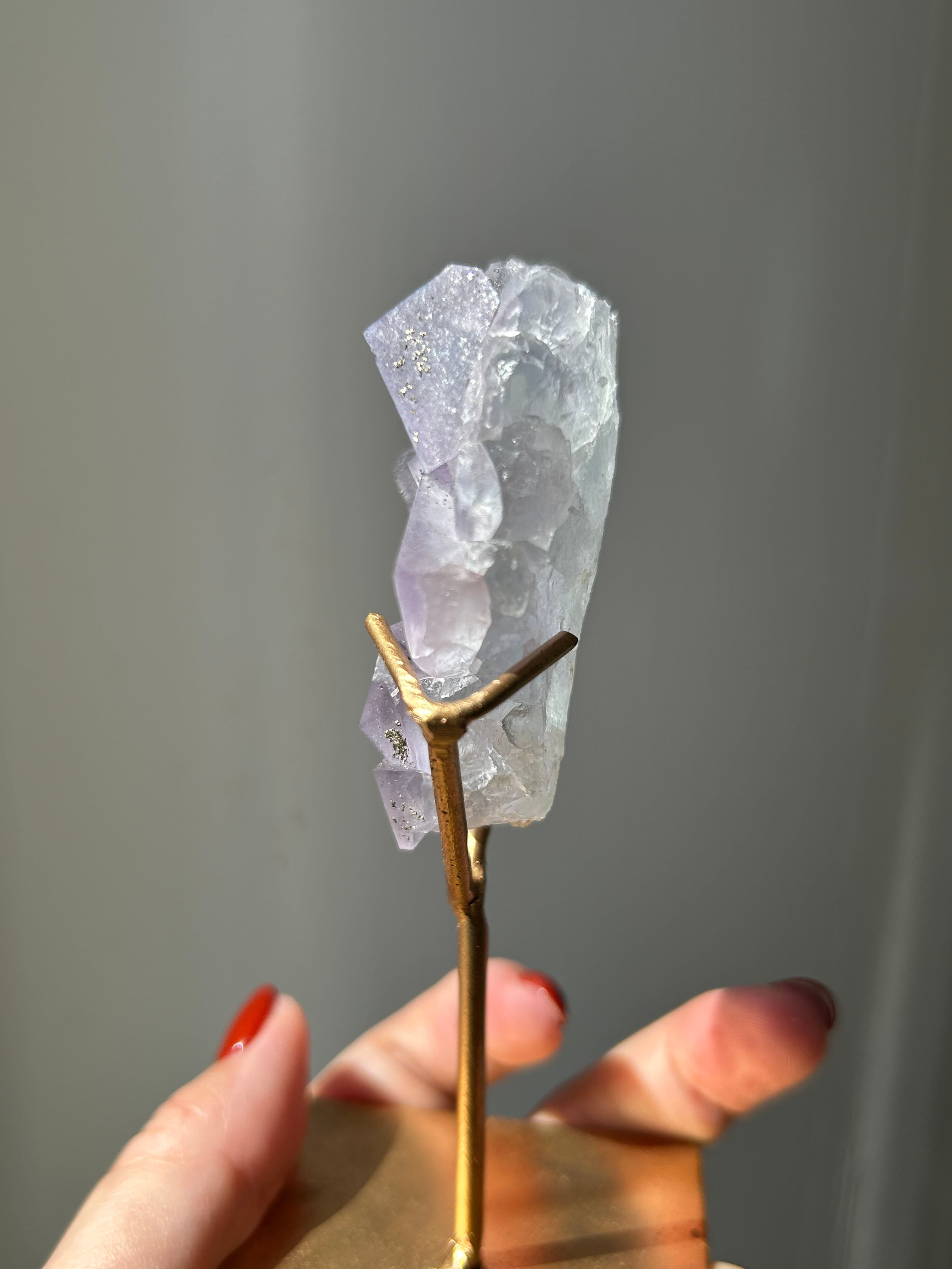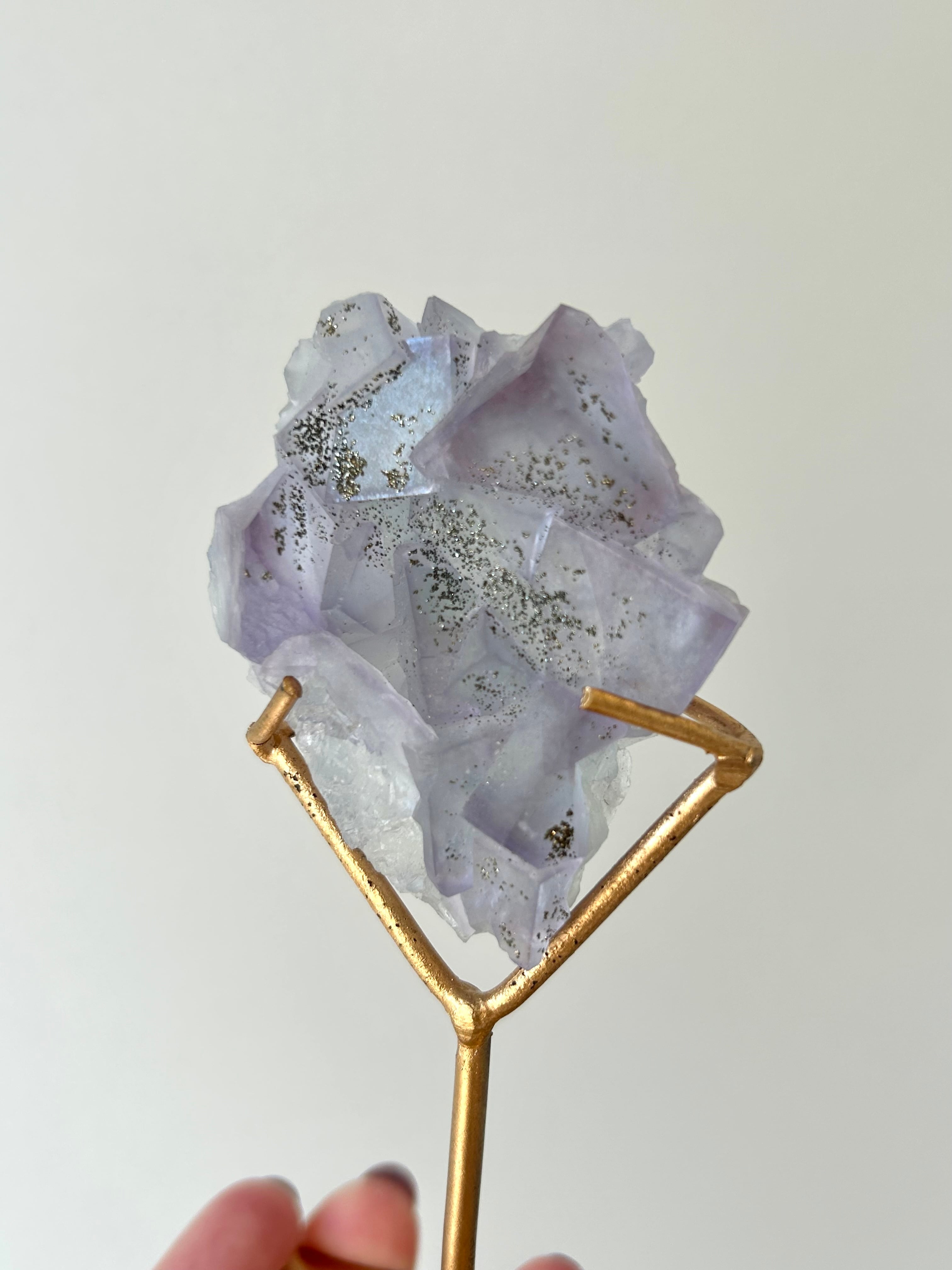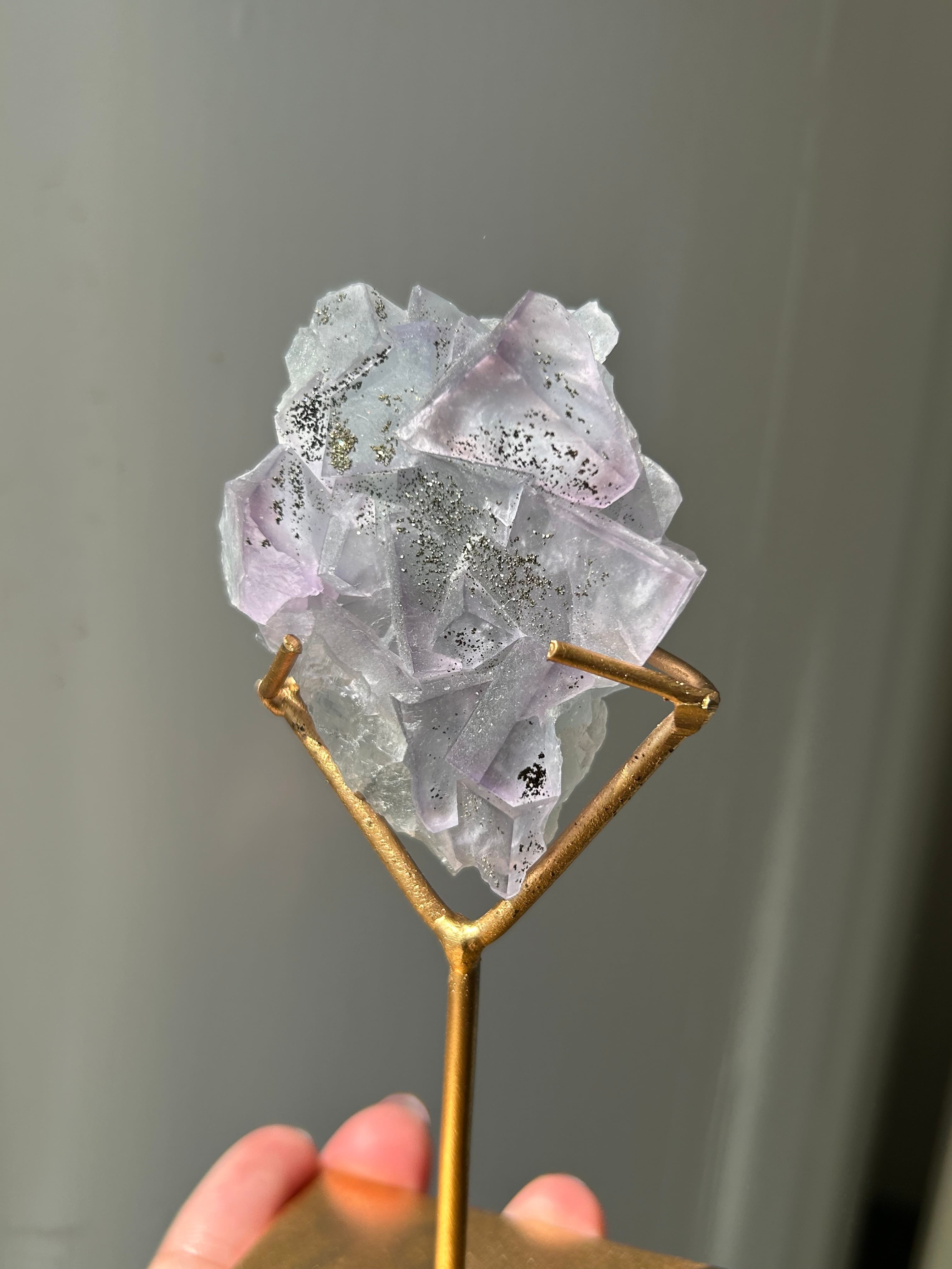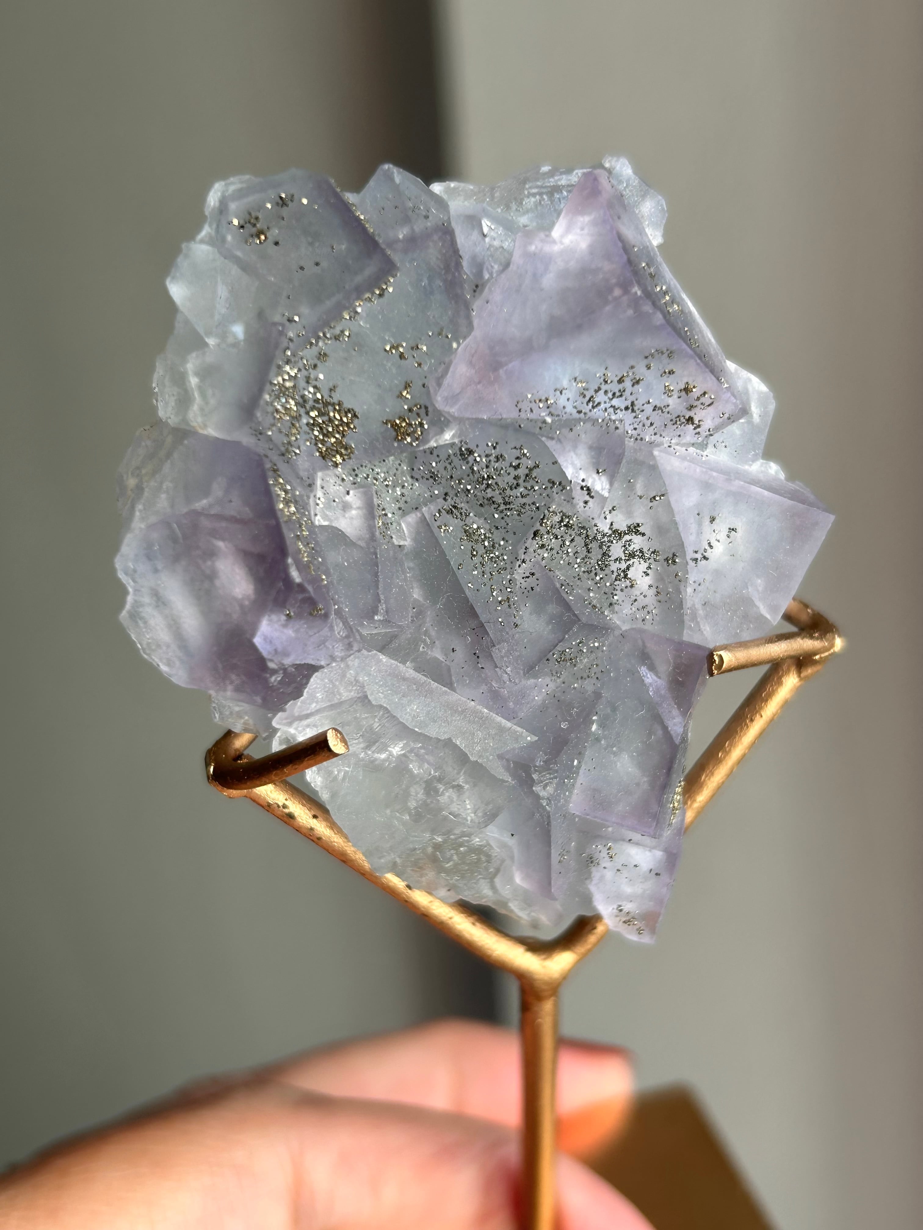 淡いブルーとミントグリーンが混ざり合い、先端部分はパープルカラーに色づいた美しいドリーミーなフローライト原石のご紹介です。細かなゴールドカラーのパイライトが散らばり、まるで夜明け間近の星空のような胸キュンなフローライト。母石が無いので、光を当てた時の透け感やまた違った表情にうっとり(母石が無い分、衝撃に弱いのでお取り扱いは優しくお願い致します)