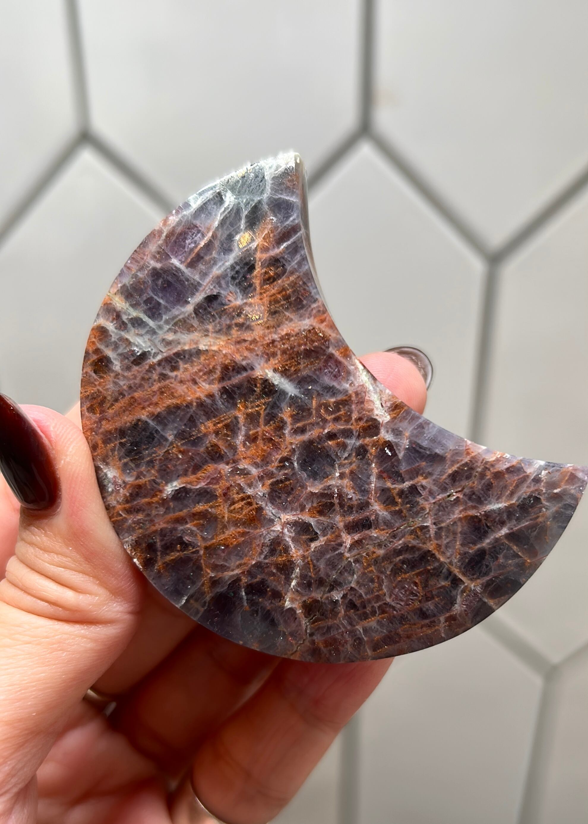 アイオライトの紫と温かな銅色の対比が織りなす美は、夜空に抱かれた月そのもの。