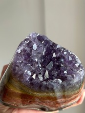 トップ部分はアメジストクラスター、母石はマスタードやオレンジカラーのジャスパー層とオシャレな配色に鉱物ファンでなくても心奪われるのではないでしょうか。洋書やアート本の上に置くだけで美しく洗練されたインテリアにもなりますし、希少なアメジストコレクションとしても申し分ない素晴らしいピースです。