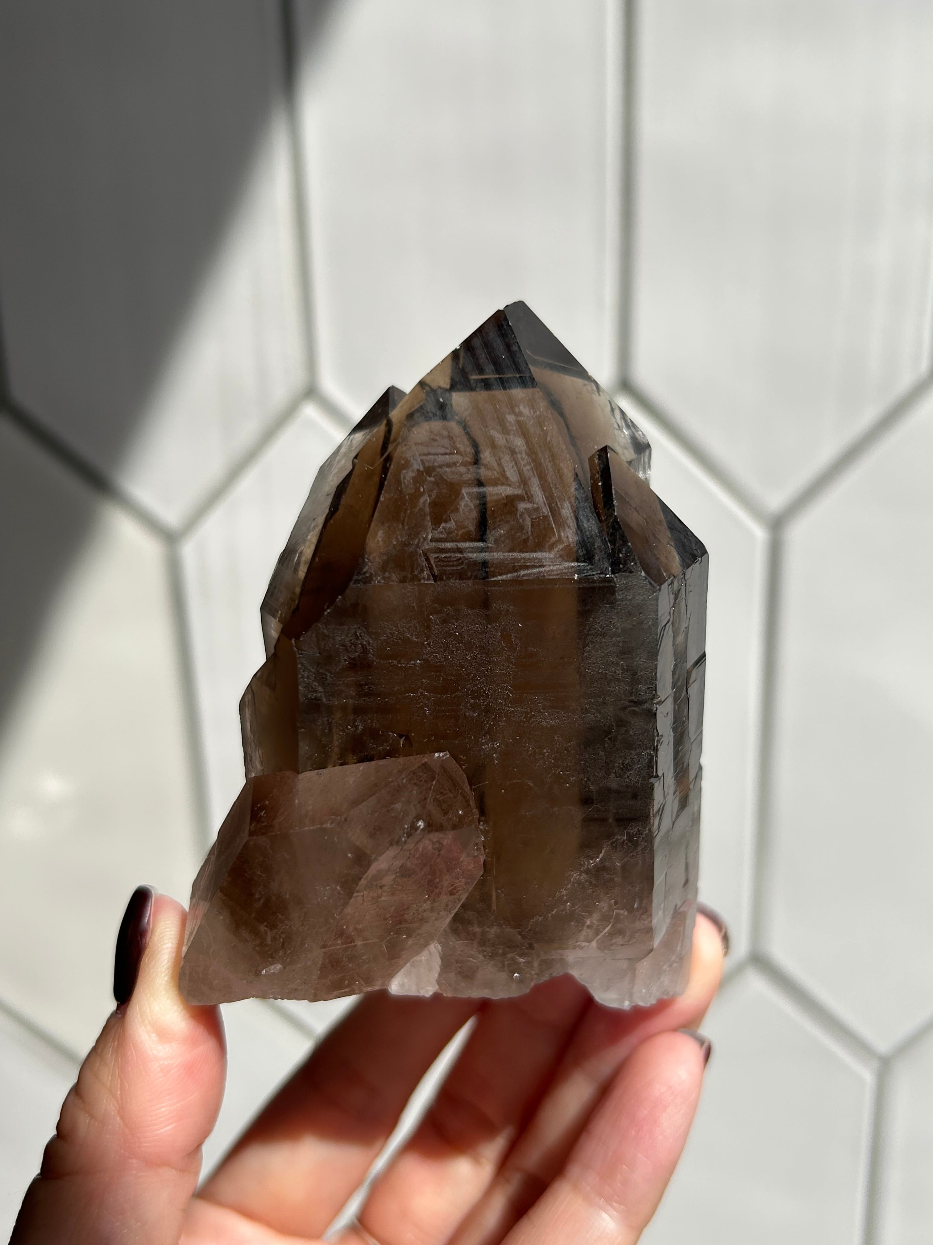 錐面にはバーコードのような多重層ラインが三角状に浮かび上がっている面もありタカラス産らしいとても神秘的なカテドラルスモーキークォーツです。
