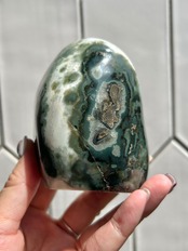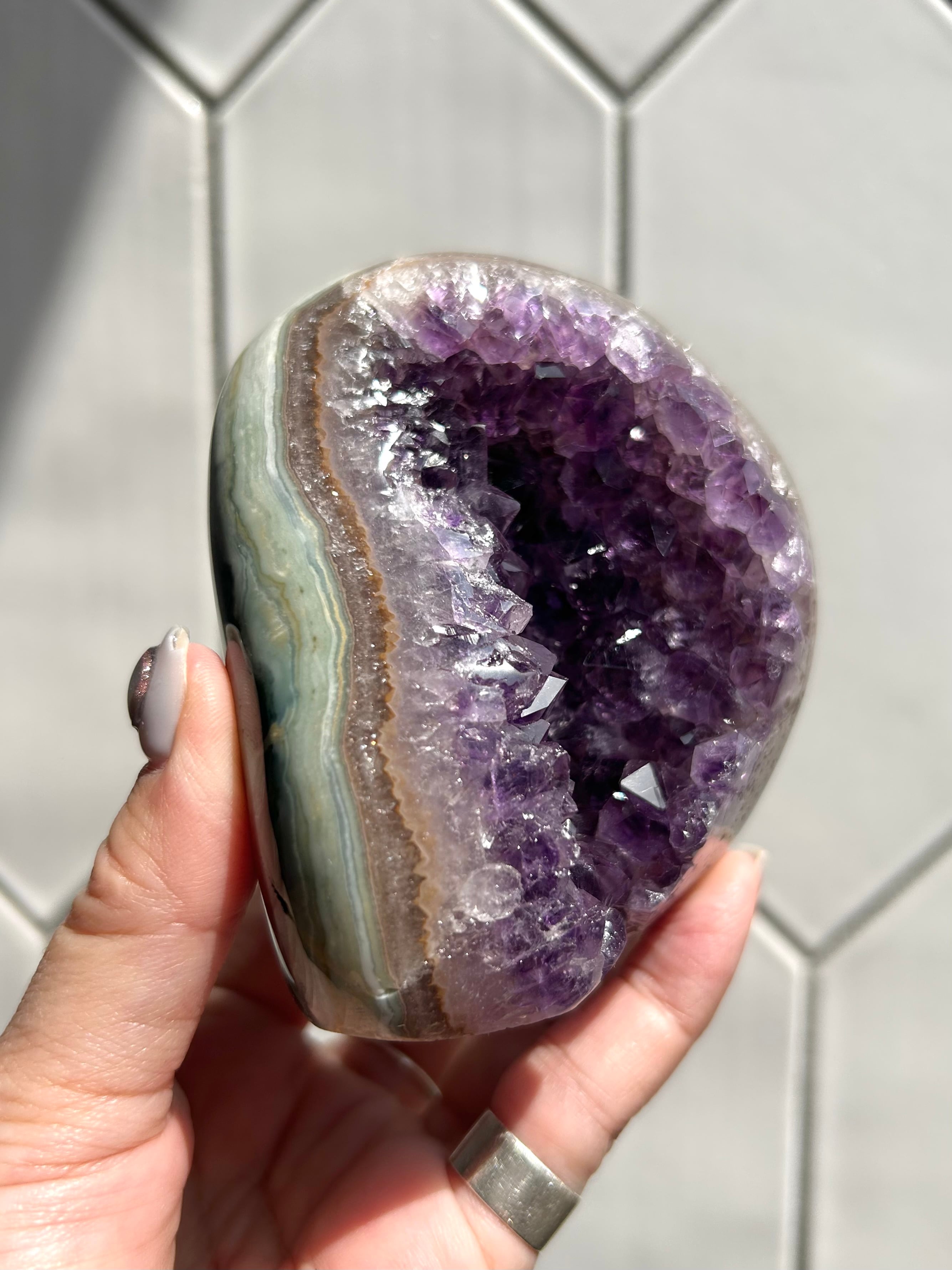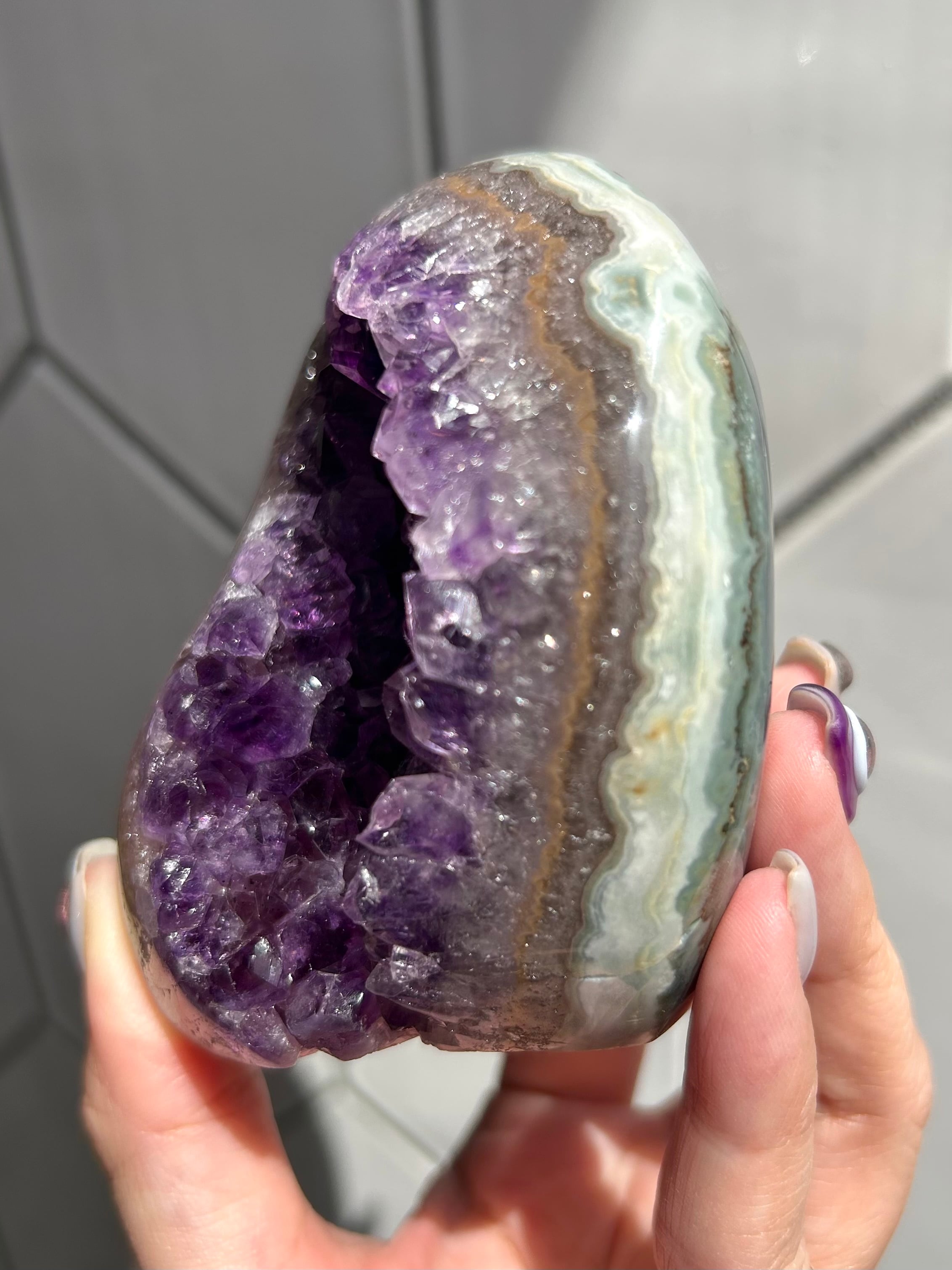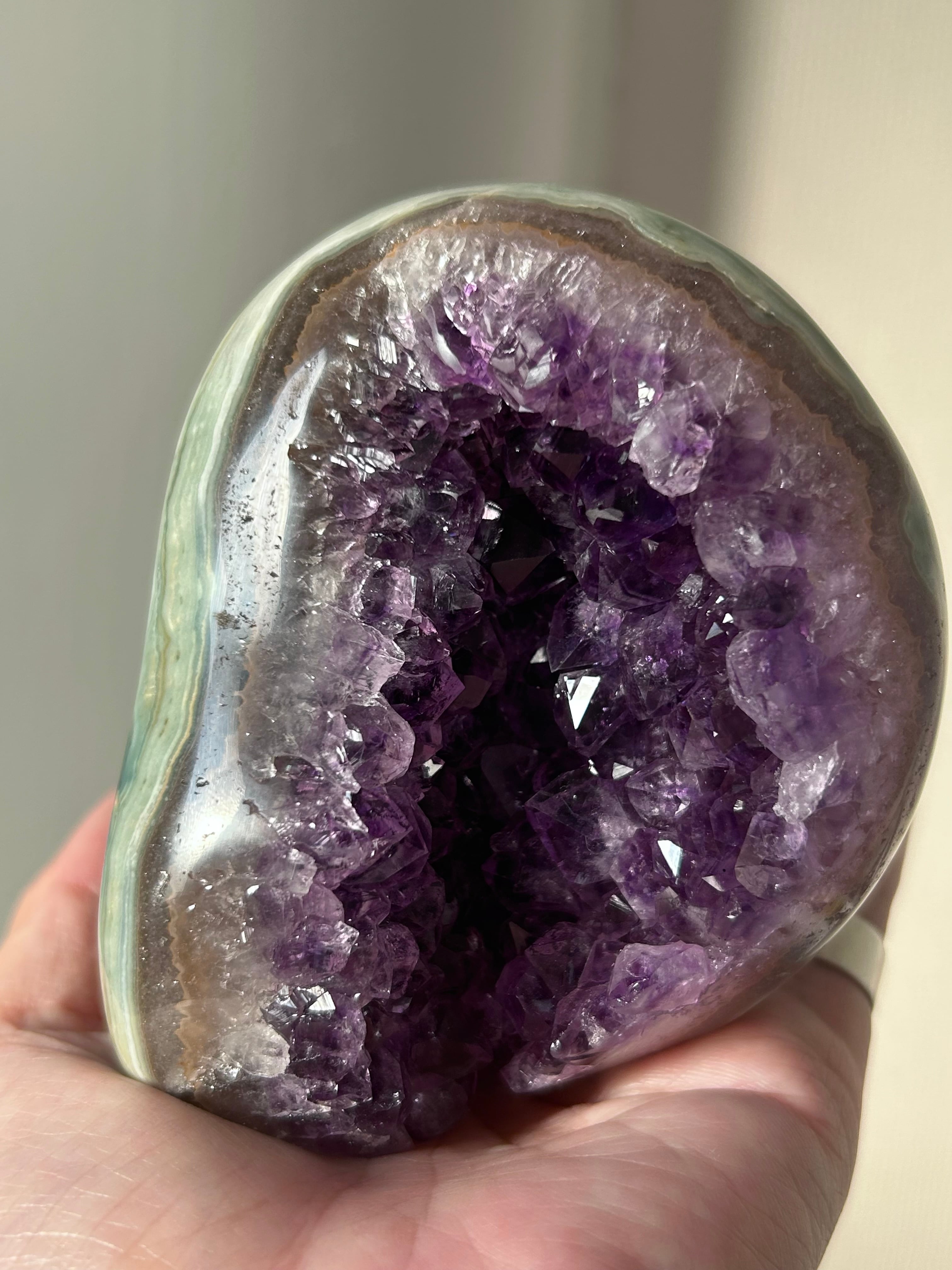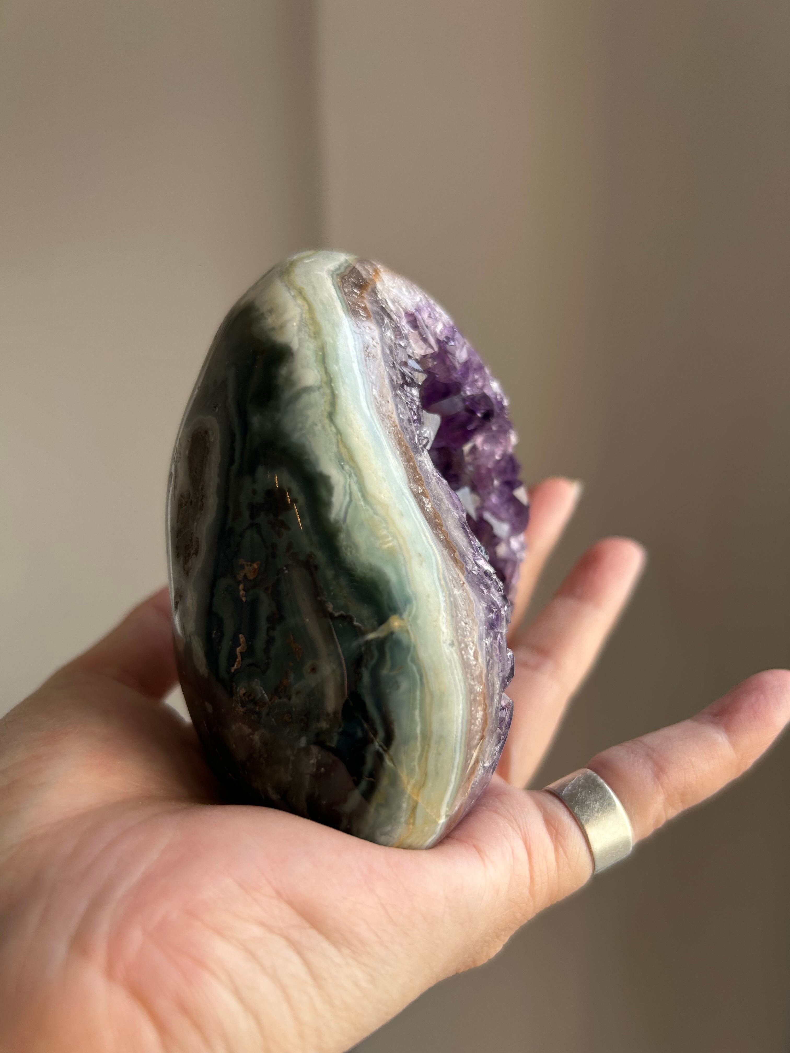 アメジストの母石部分が美しいグリーンカラーのアゲートの共生ピースのご紹介です!
