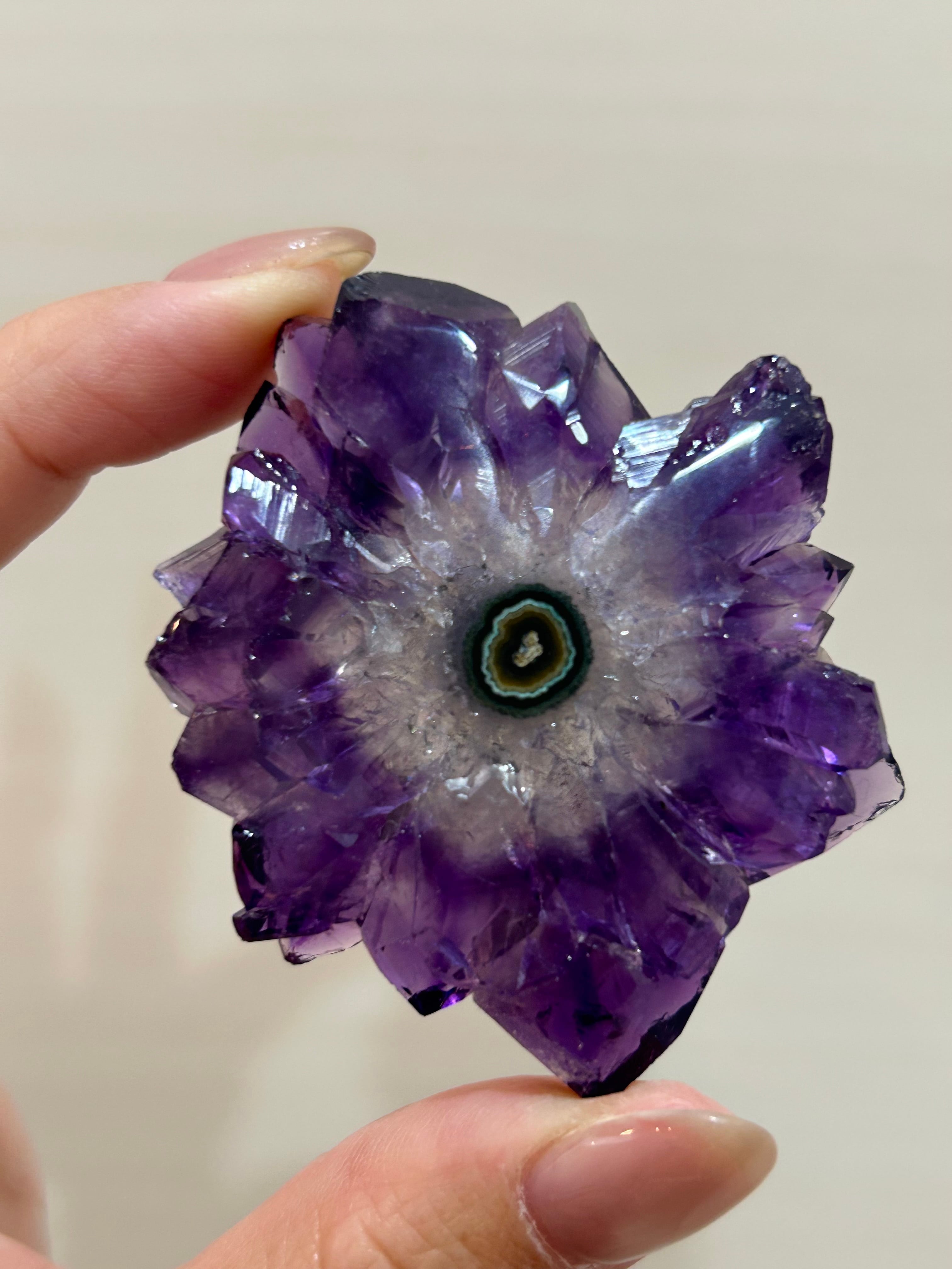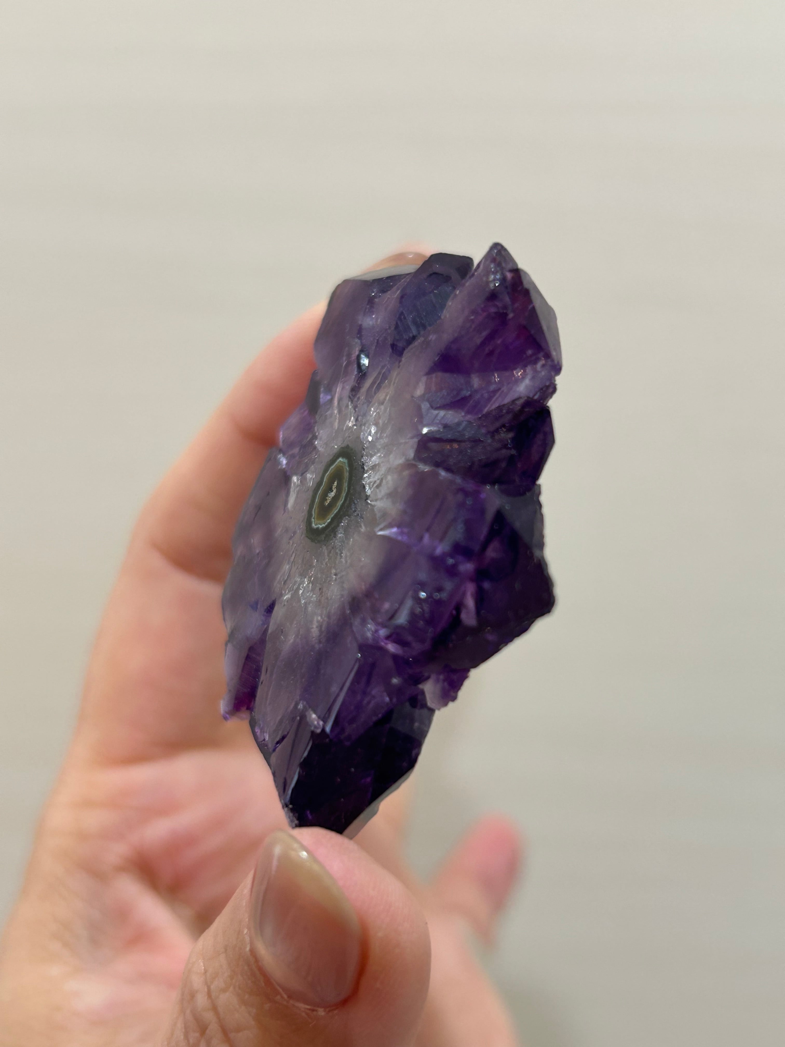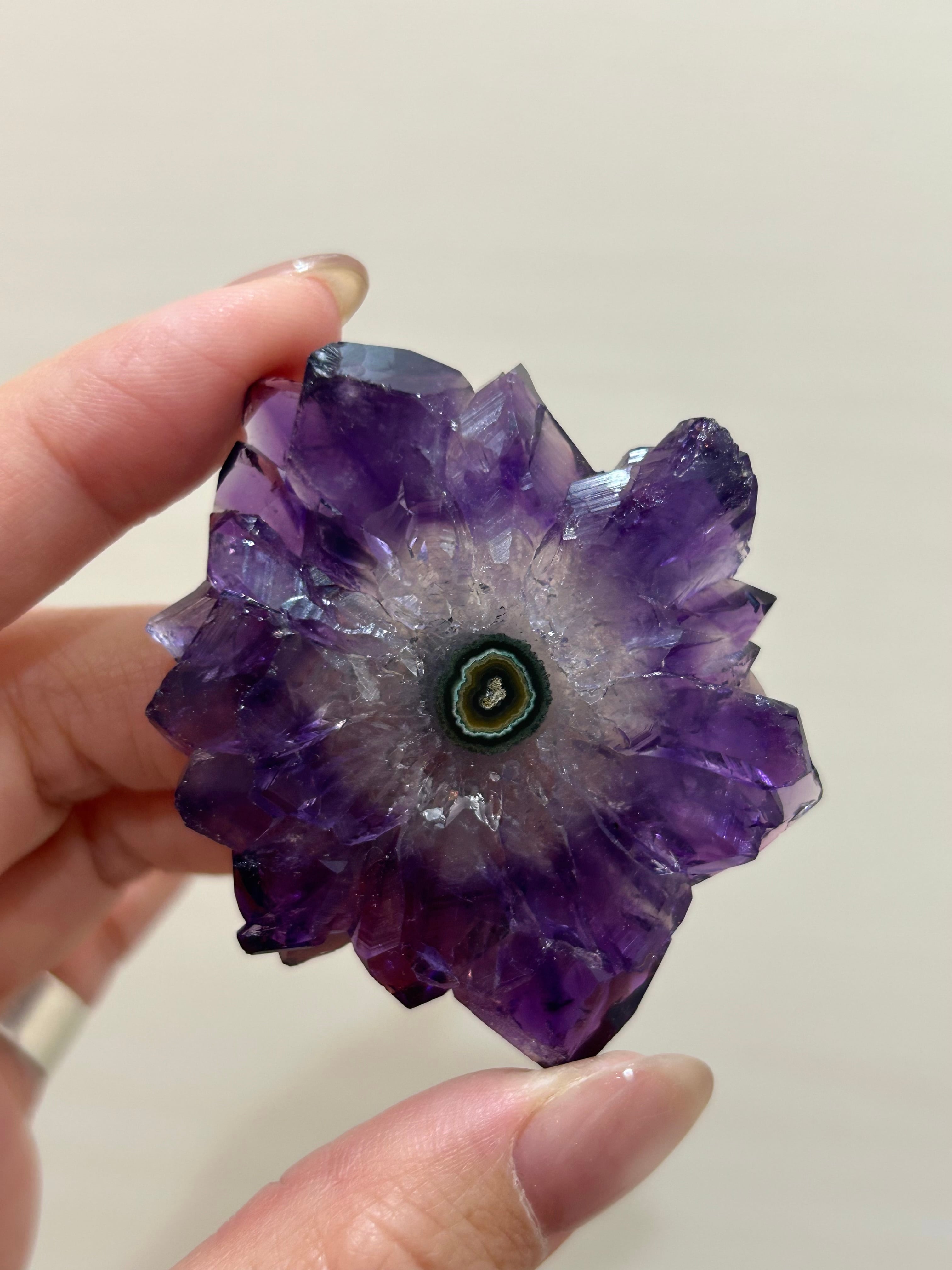 中心部には花芯のように現れたグリーンカラーのアゲート層が確認でき、紫の結晶とのコントラストがこのピースならではの魅力となっています。