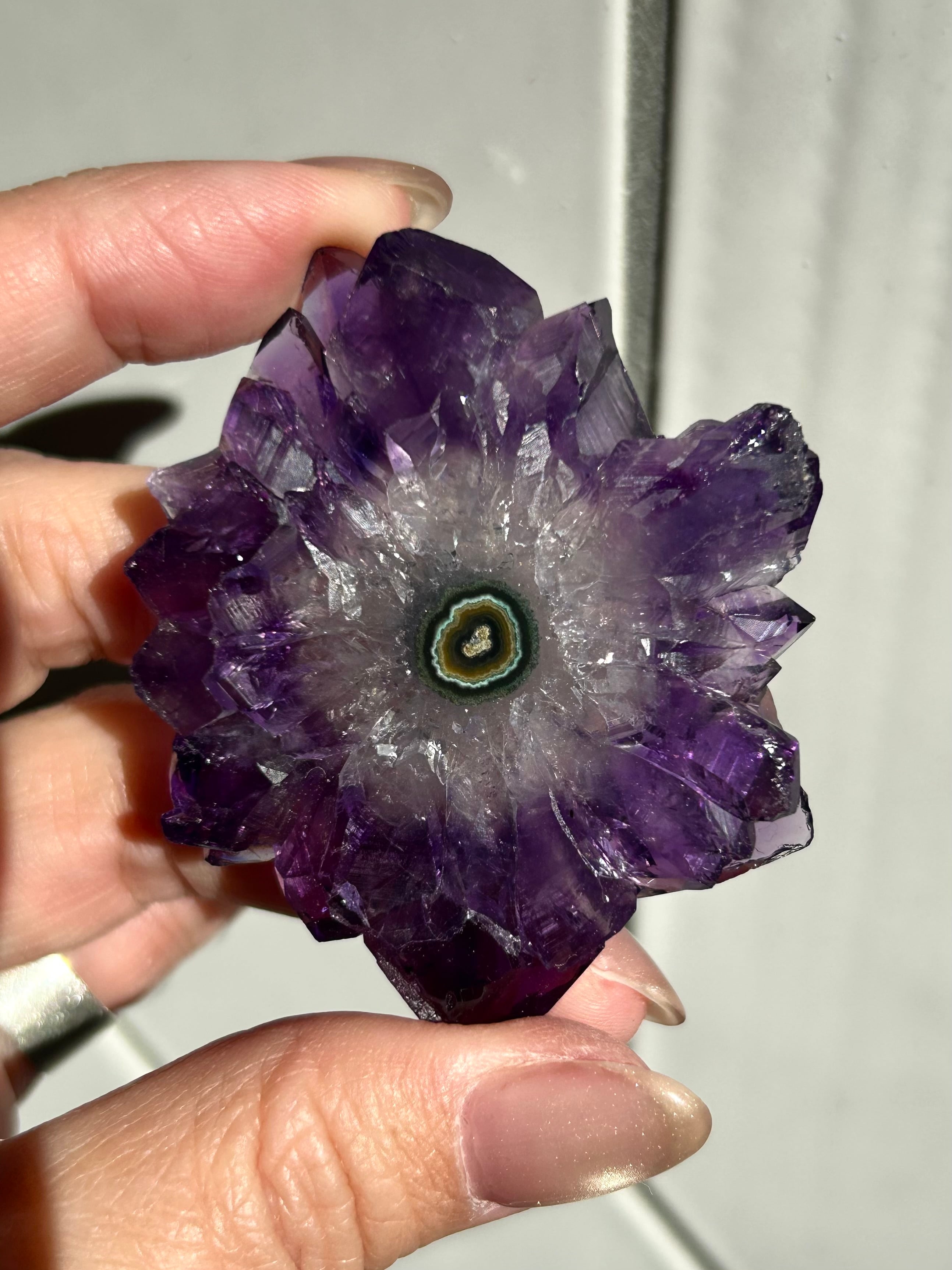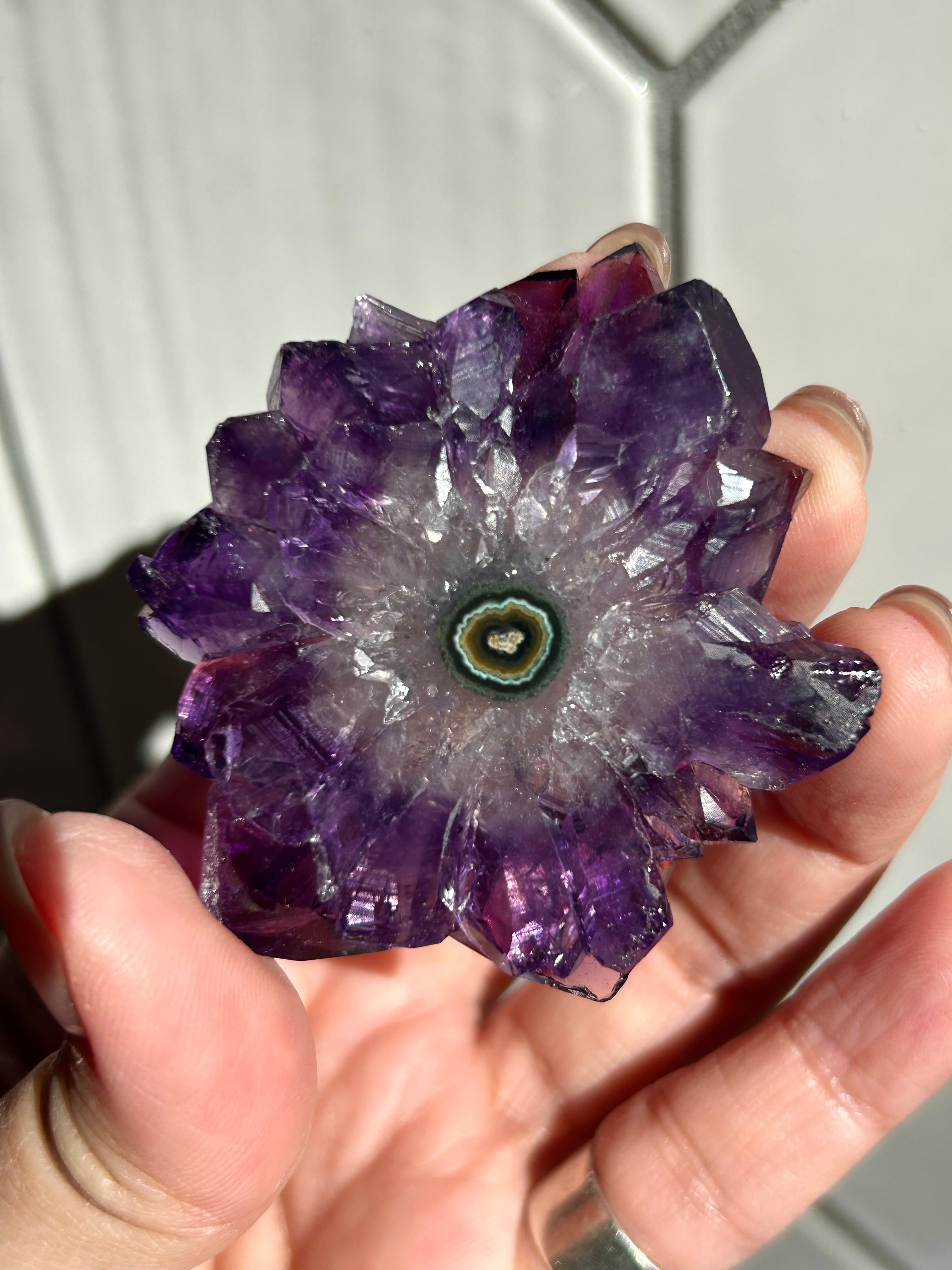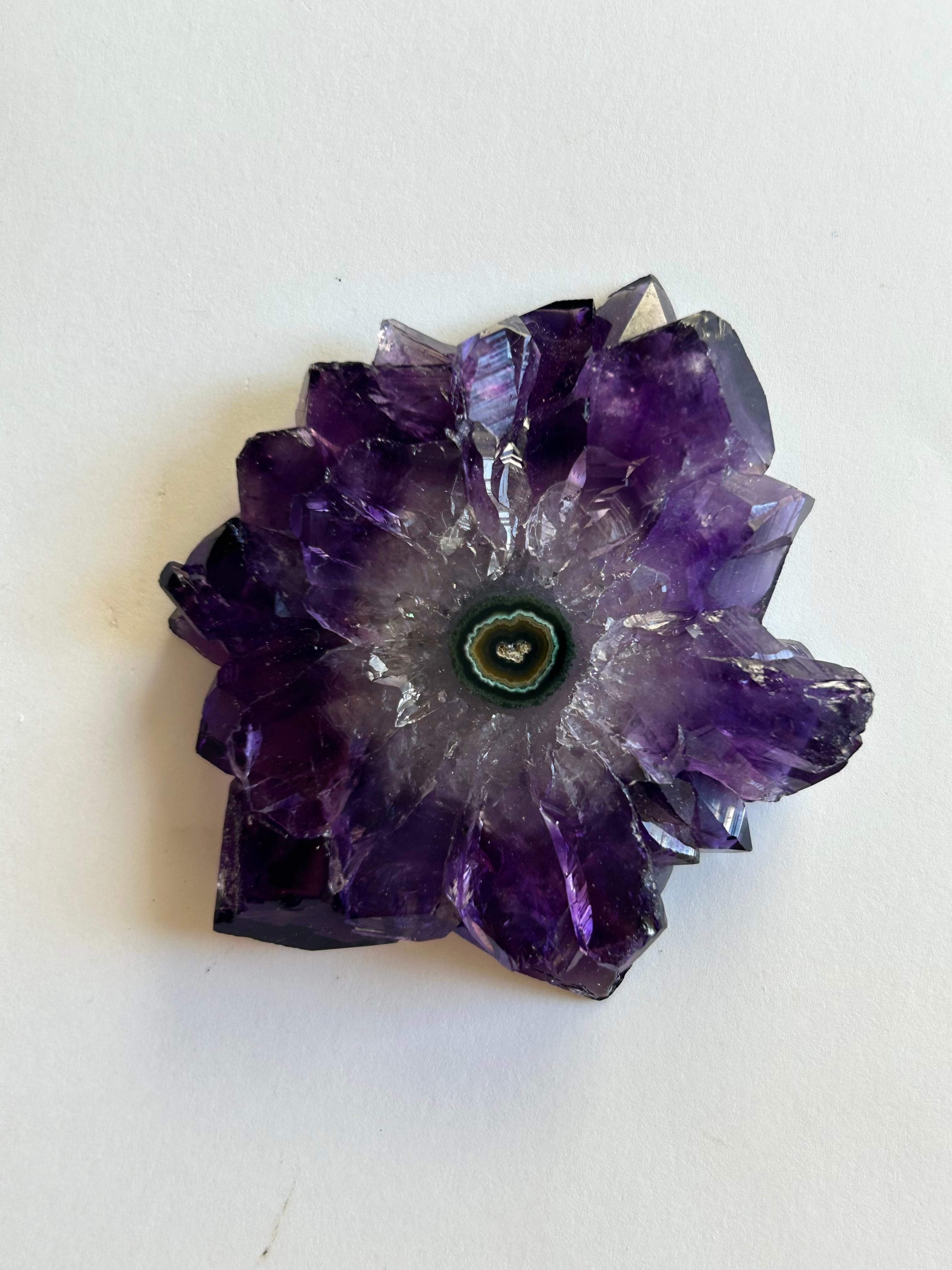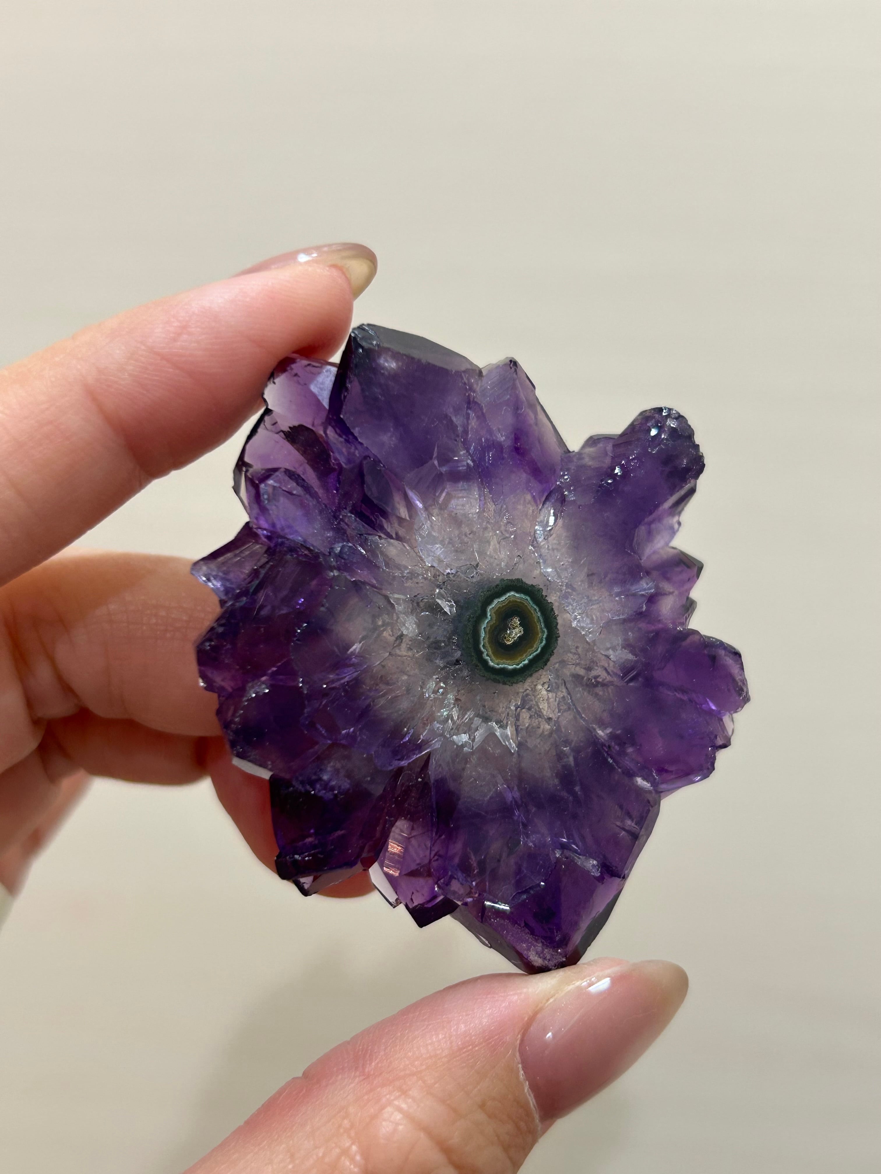 中心部には花芯のように現れたグリーンカラーのアゲート層が確認でき、紫の結晶とのコントラストがこのピースならではの魅力となっています。