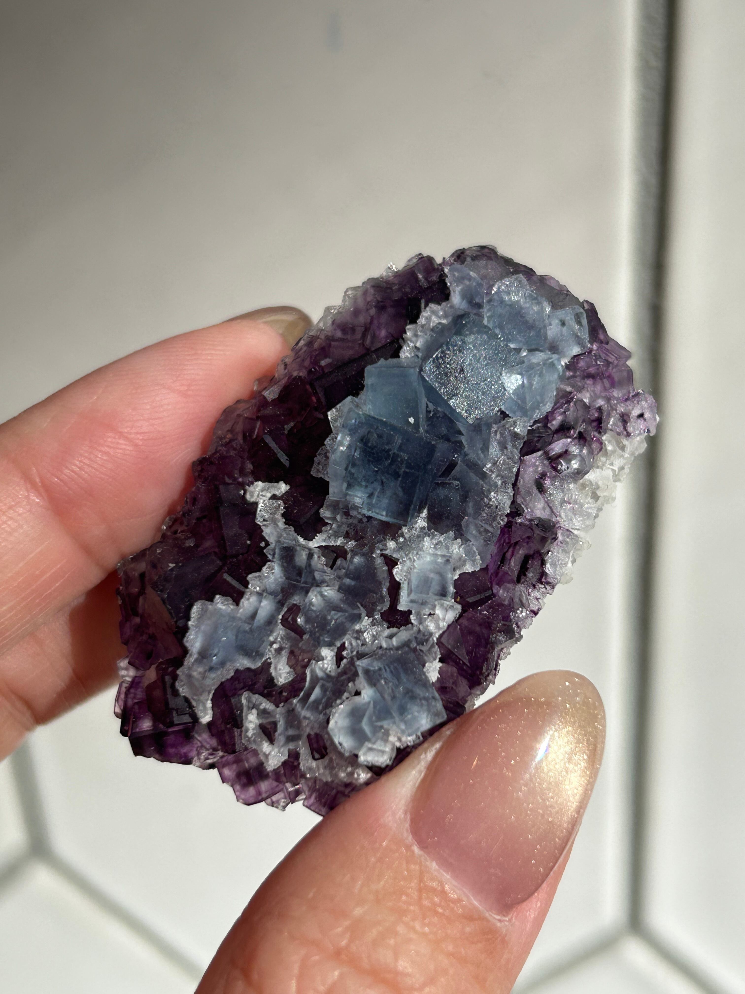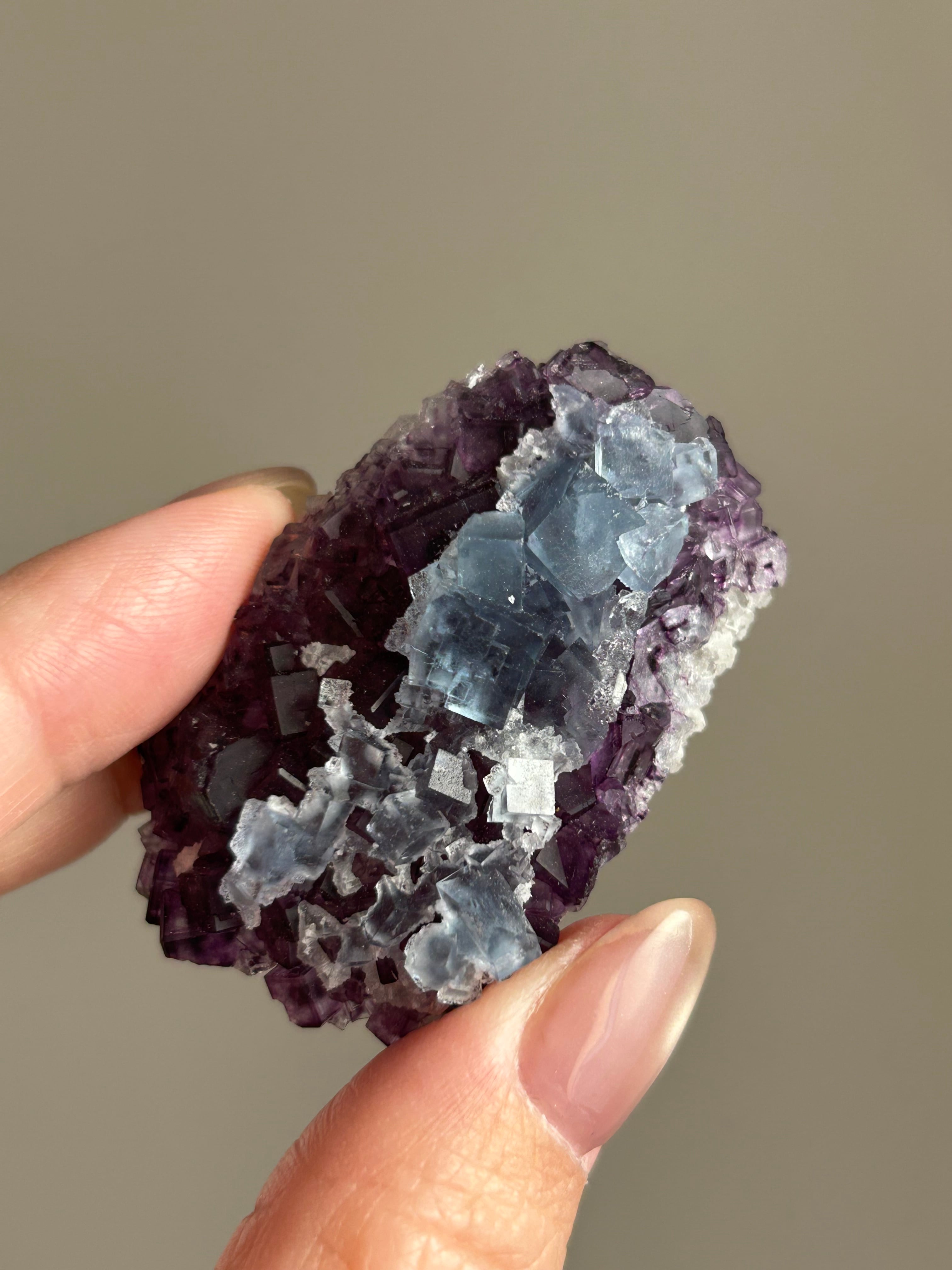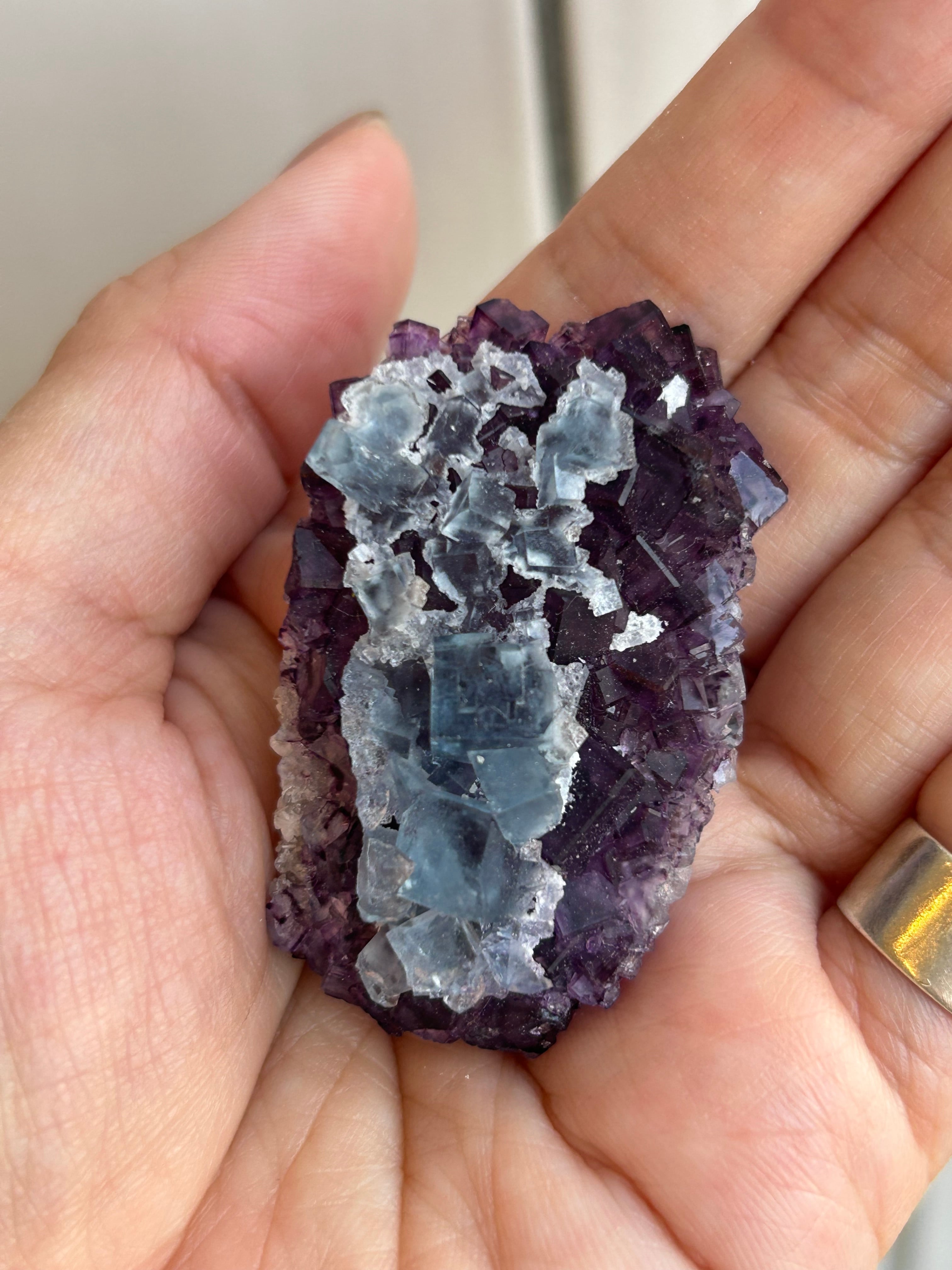 パープルフローライトと共生する細かなブルーのフローライトのバイカラーがとっても珍しいピース。一期一会の貴重な出会い、大切な希少鉱物コレクションの1つとしてぜひ^_^