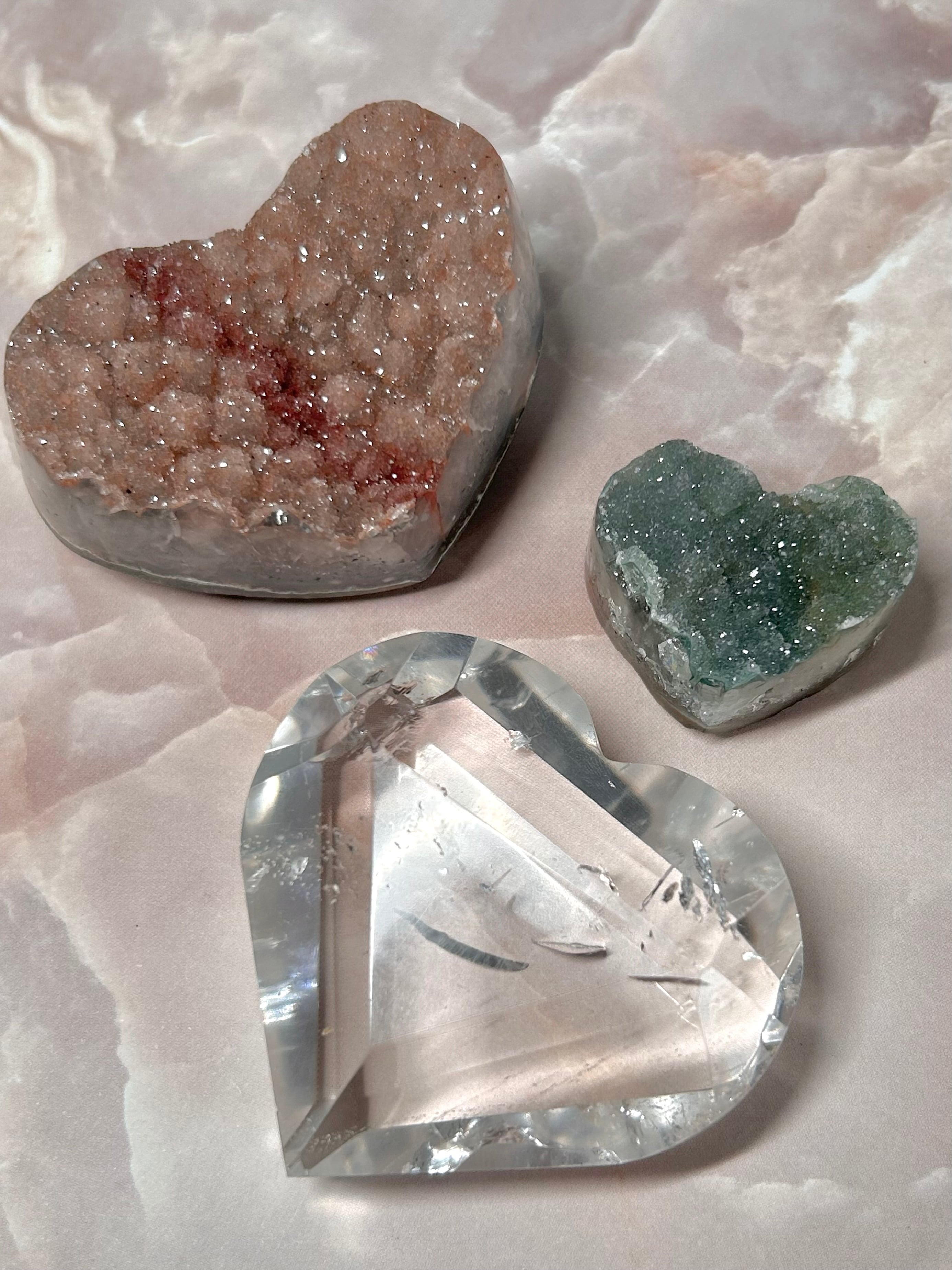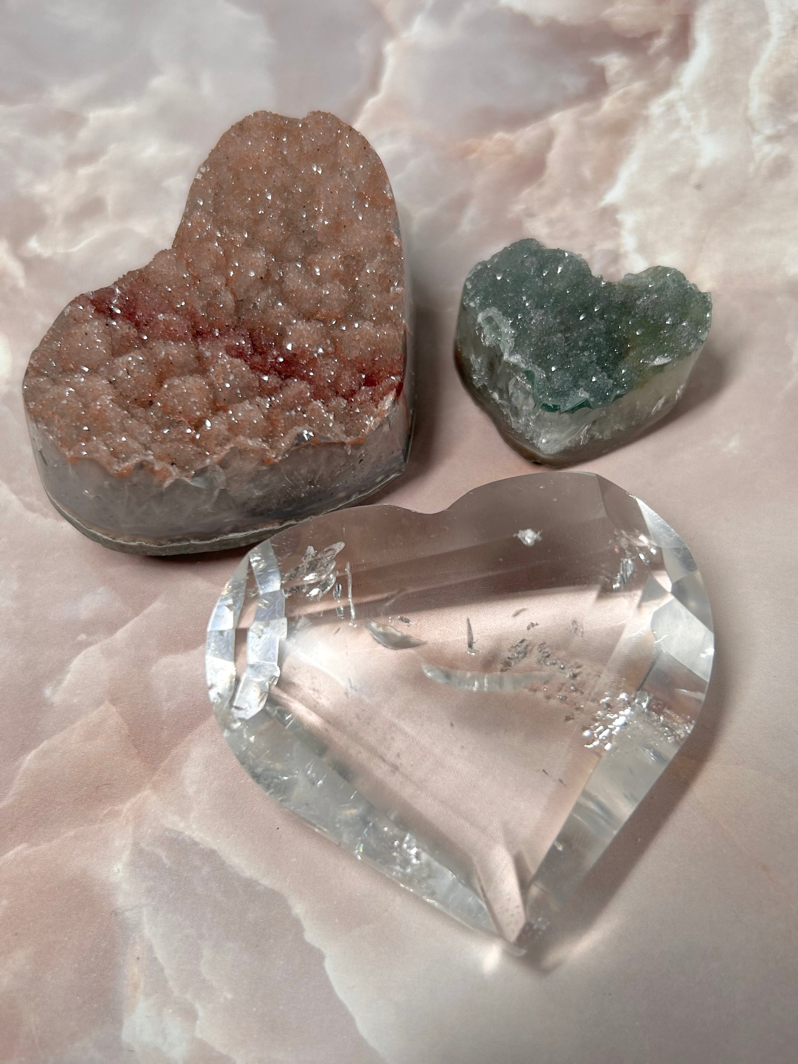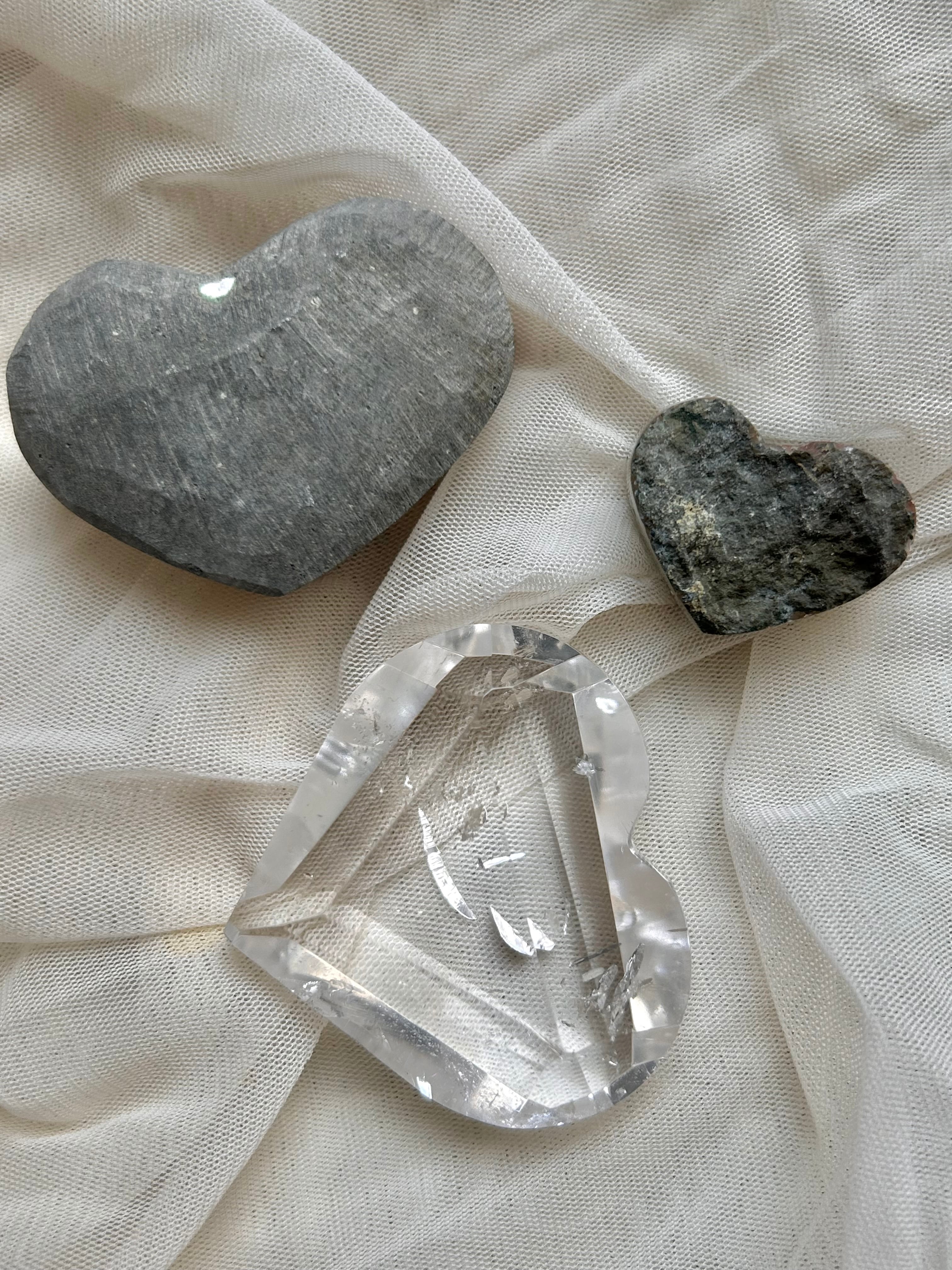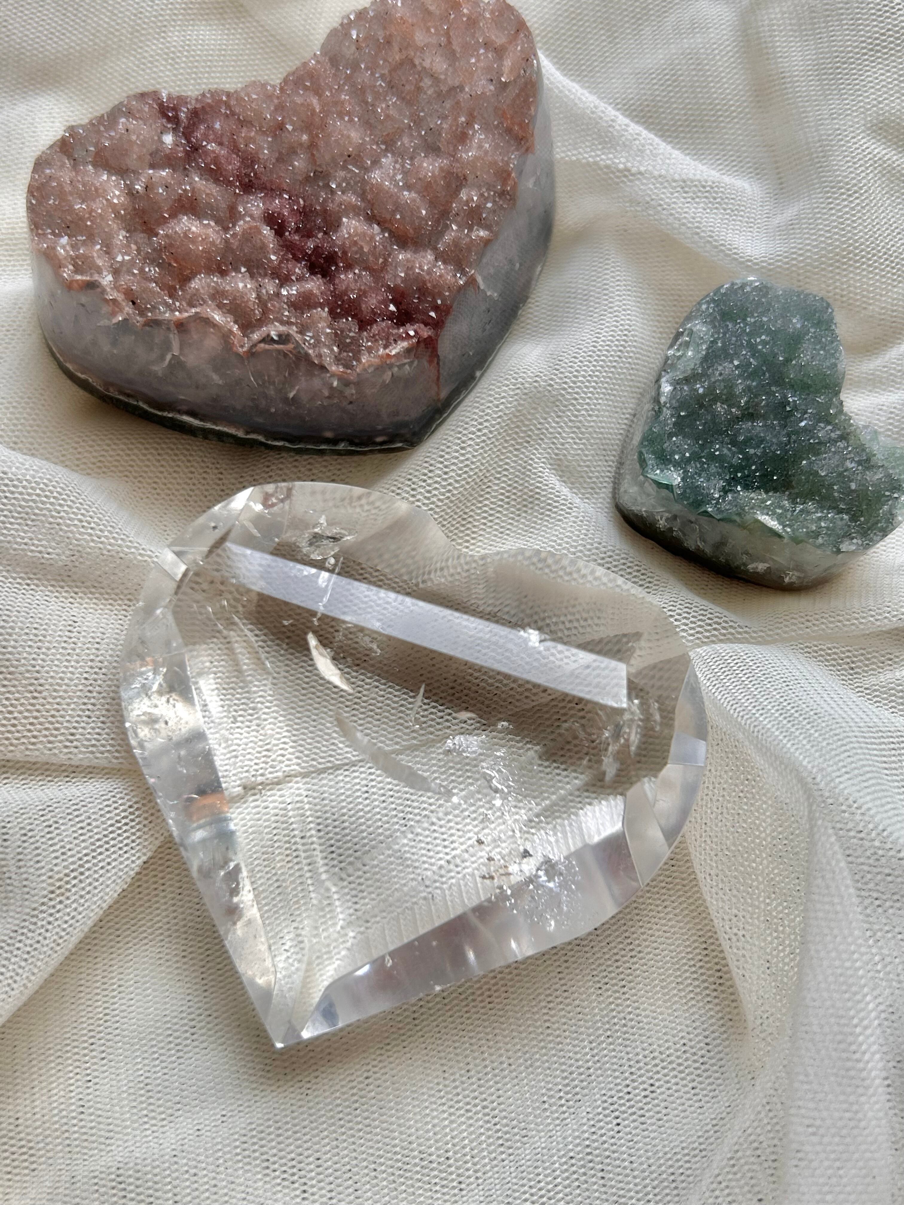 セットに含まれるブラジル産のフェイステッドハートは、近年さらにカッティング技術が進化しており、透明度の高い水晶に、滑らかで精度の高いカッティングが施されています。光を受けた際の反射や立体感は、従来のものと比べても完成度の高さが際立つ美しい仕上がりとなっています。