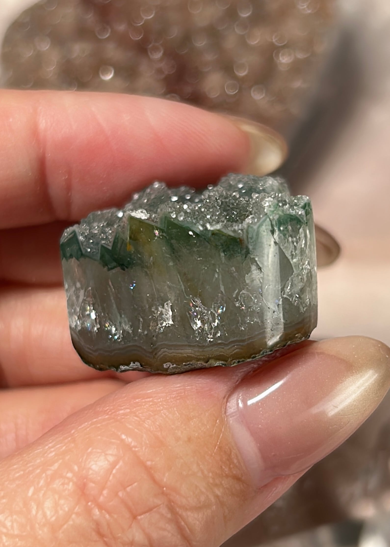 お砂糖をまぶしたように繊細で、きらきらと輝くウルグアイのシュガードゥルージー(レインボーアメジスト)は、登場から数年を経た今もなお人気が高まり続けています。一方で、近年は価格の上昇や海外バイヤーとの競合、特に人気カラーの品薄などが重なり、安定した仕入れが難しくなってきました。そのため、今回のご紹介は久しぶりとなります。ぜひこの機会に、胸の高鳴りを覚えるドゥルージーをコレクションにお迎えください。