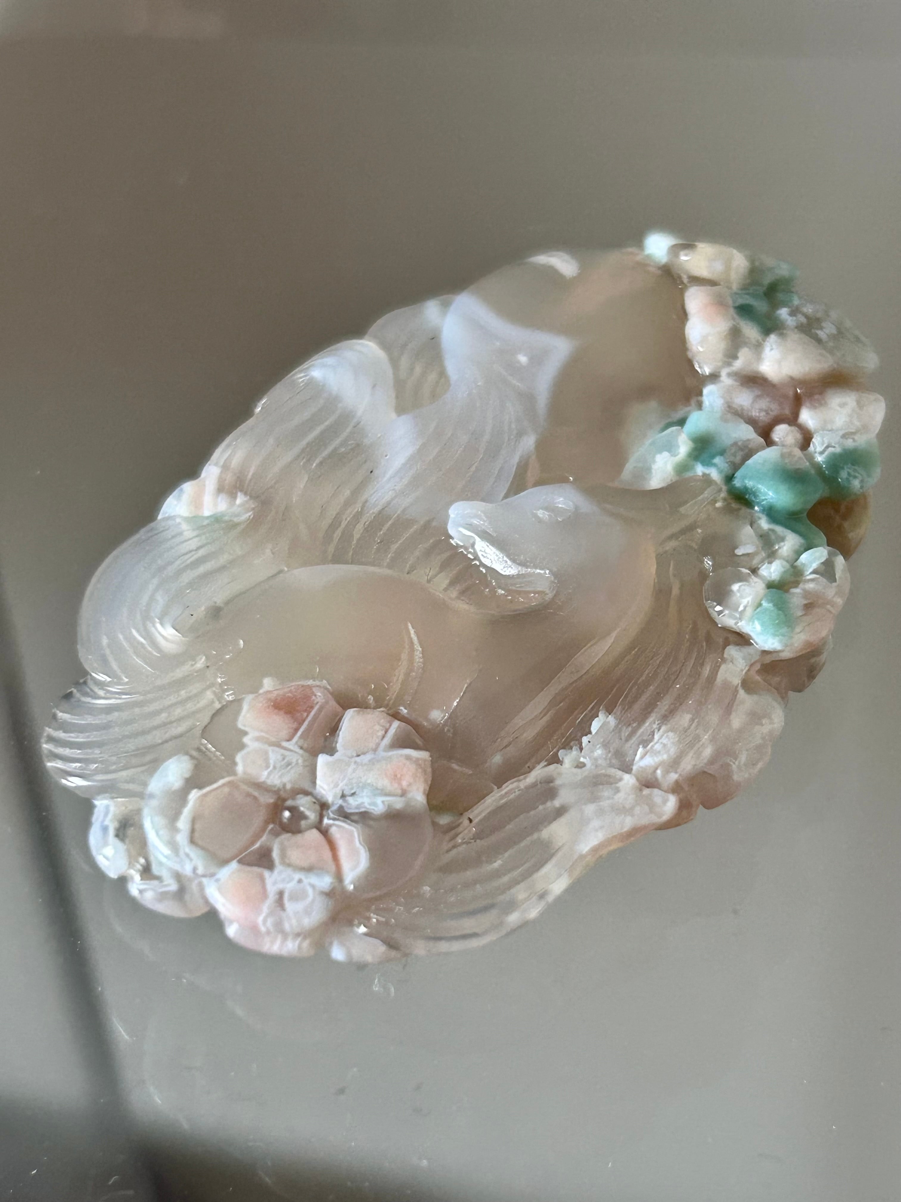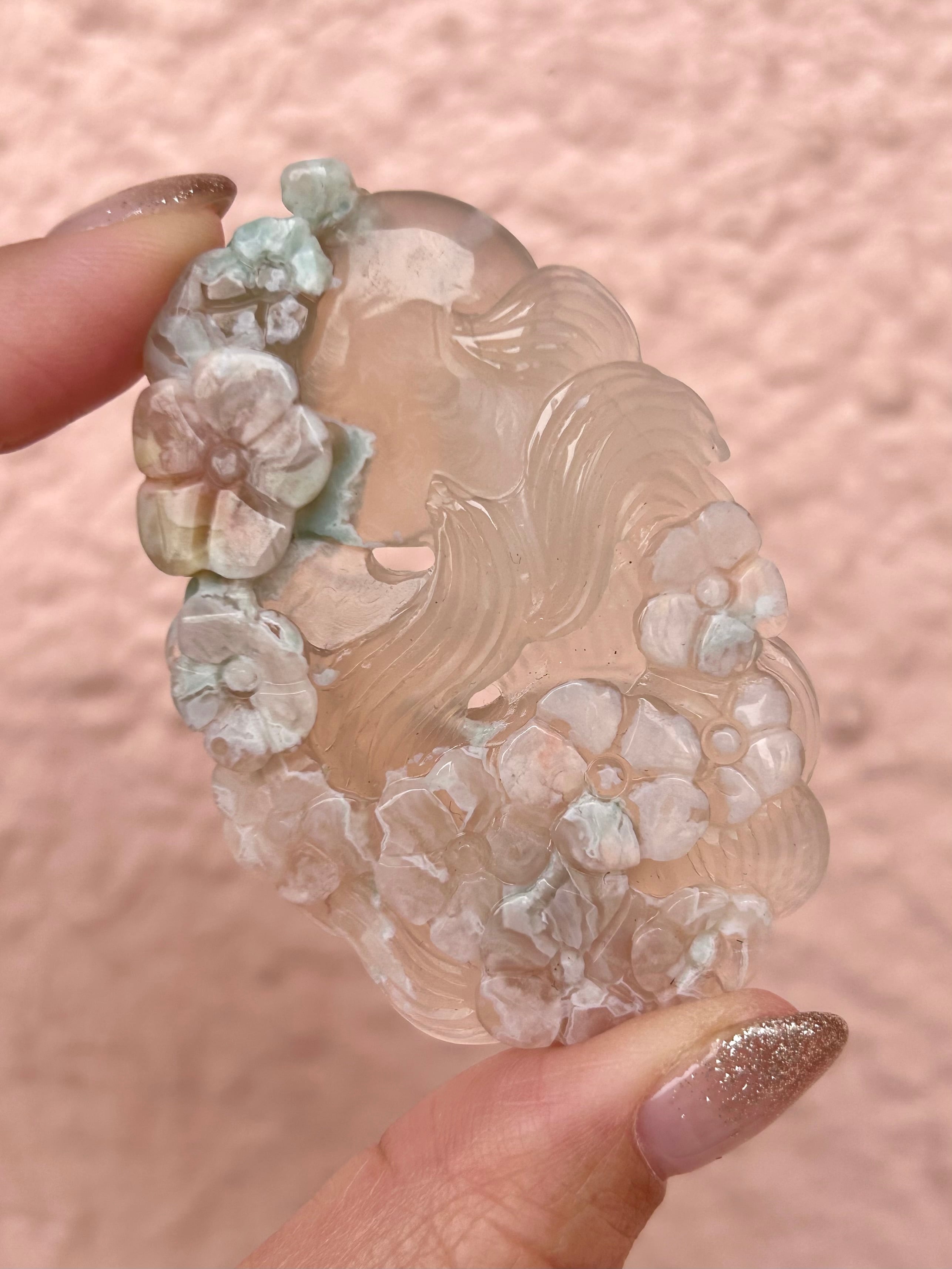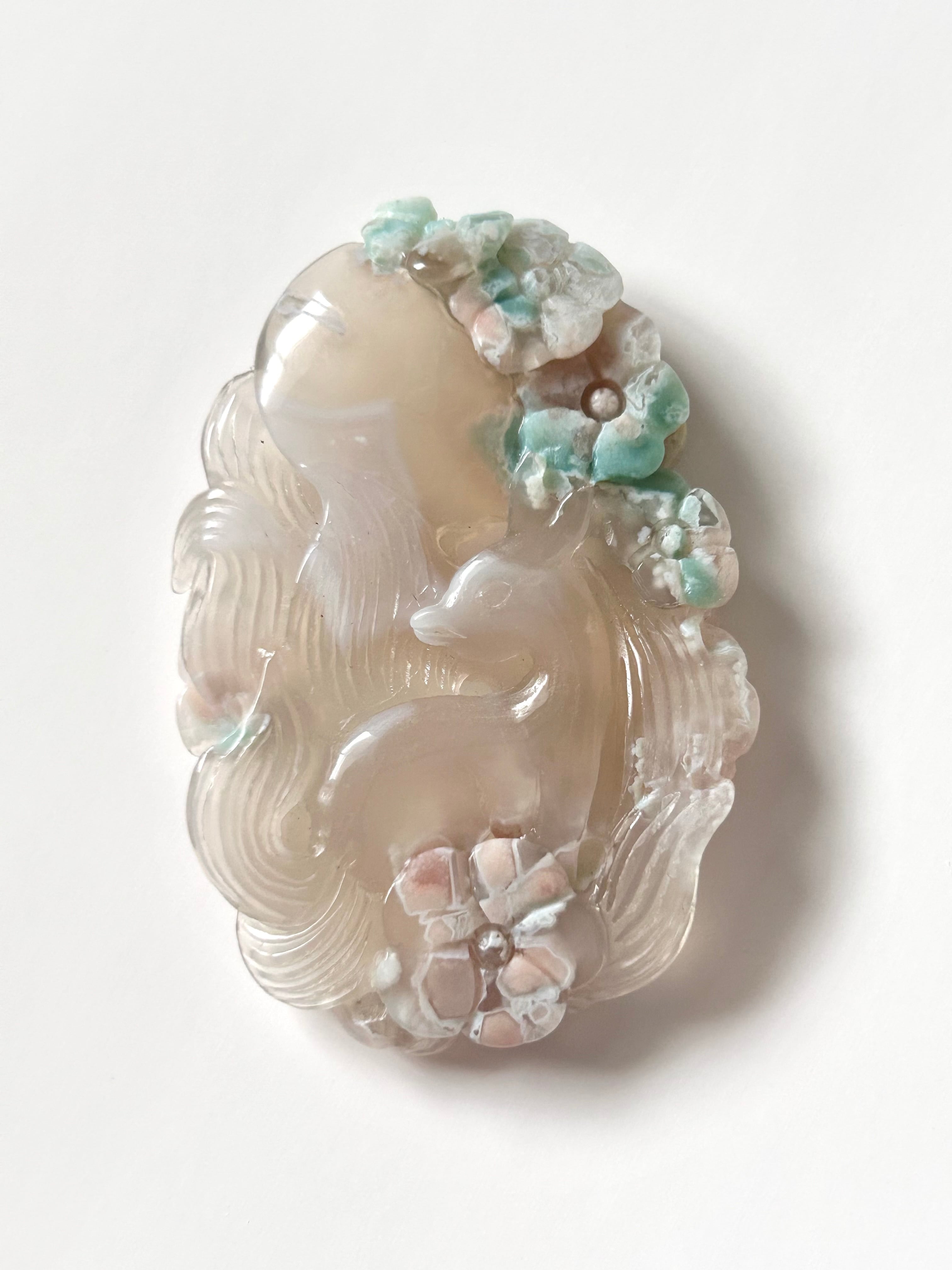 ✴︎ 芸術品!職人さんによるハンドカービング フラワーアゲート 九尾の狐B お守り