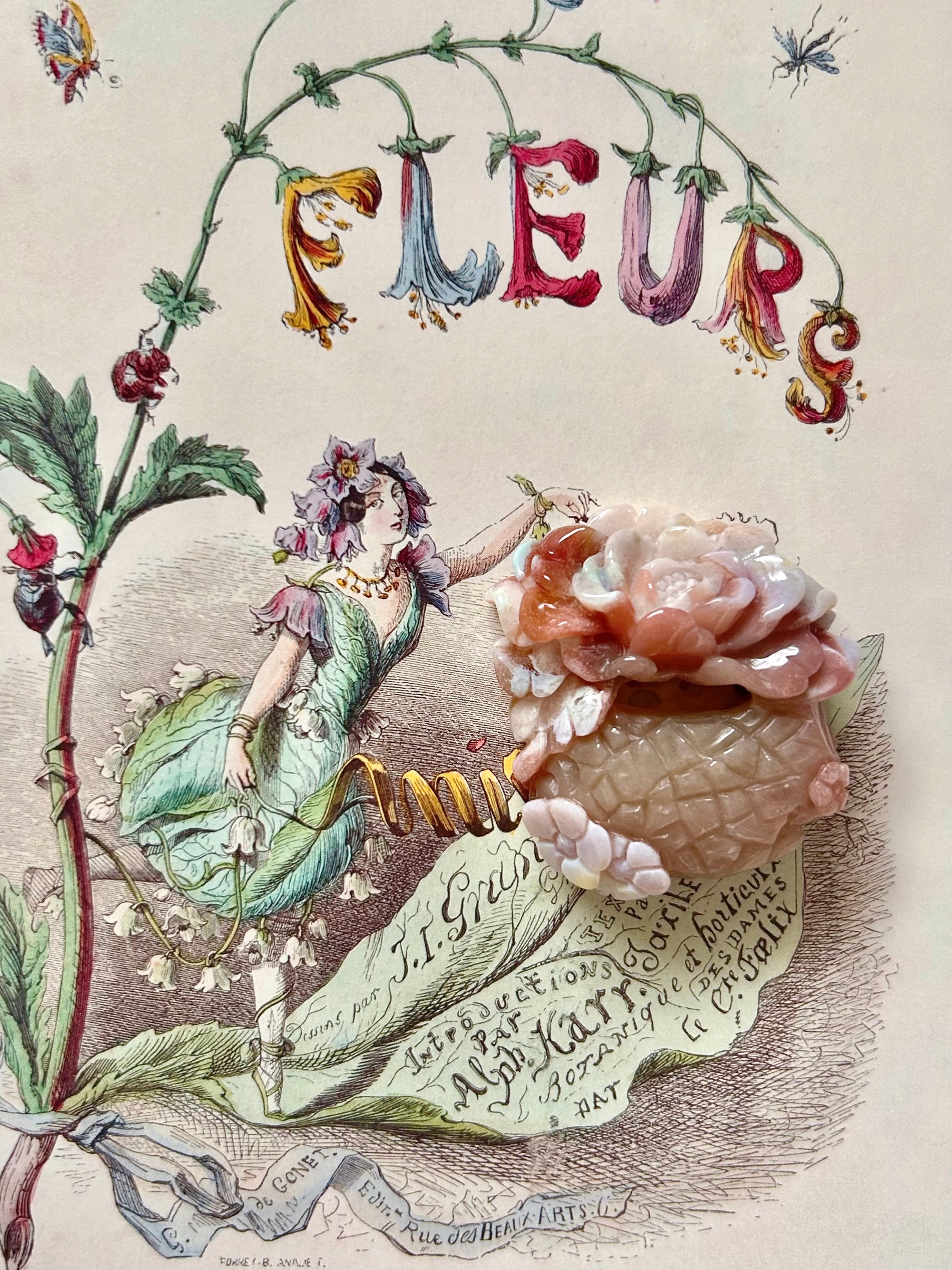 使用されているフラワーアゲートは、このように複数のカラーが美しく混ざり合うタイプ自体が希少。さらに、花かごモチーフのカービングも珍しく、同じ色合い・同じ配置のものに再び出会うことはほぼありません。
