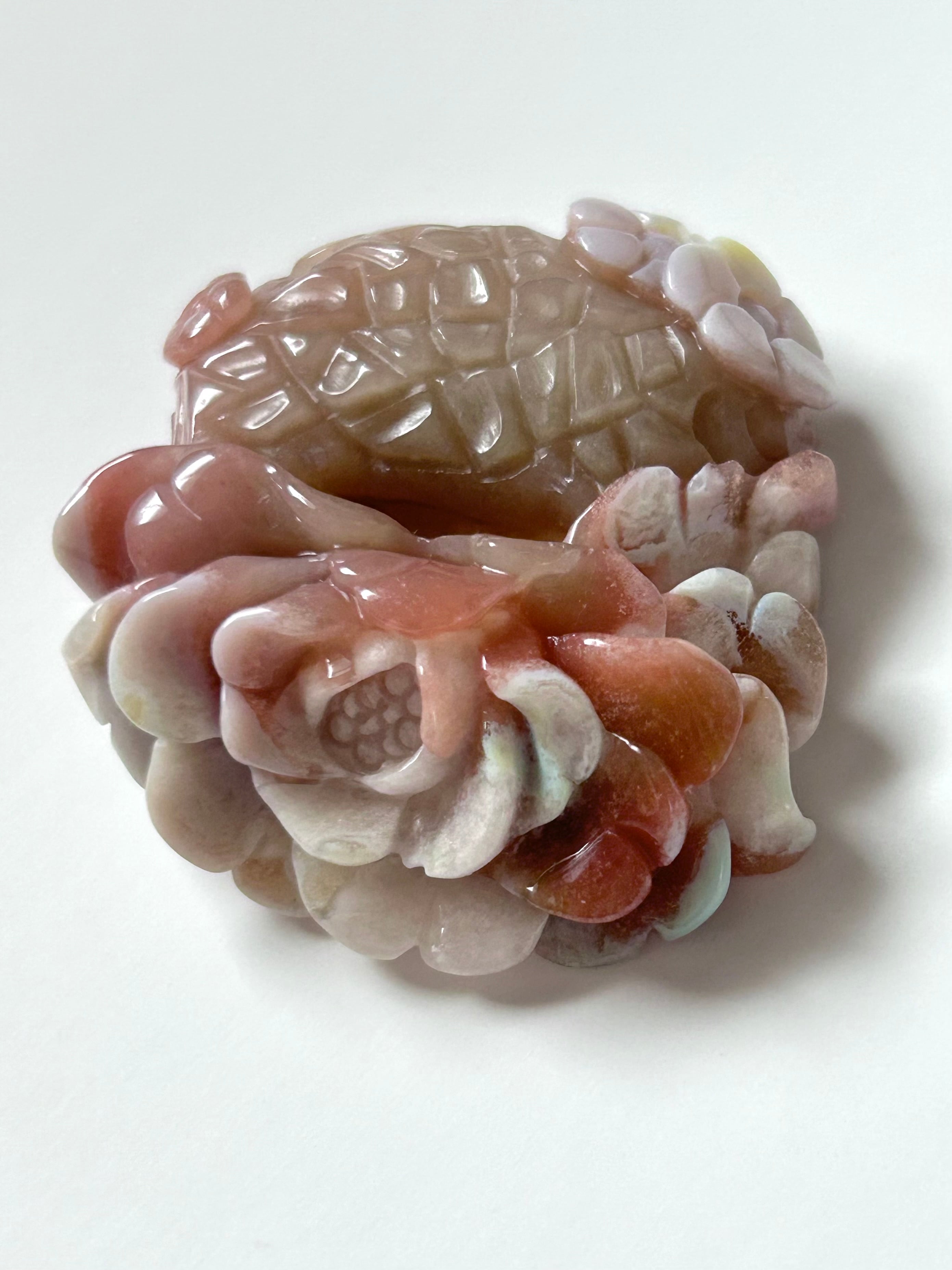 カラフルなフラワーアゲートを用い、職人の手によって丁寧に彫り上げられた一点です。