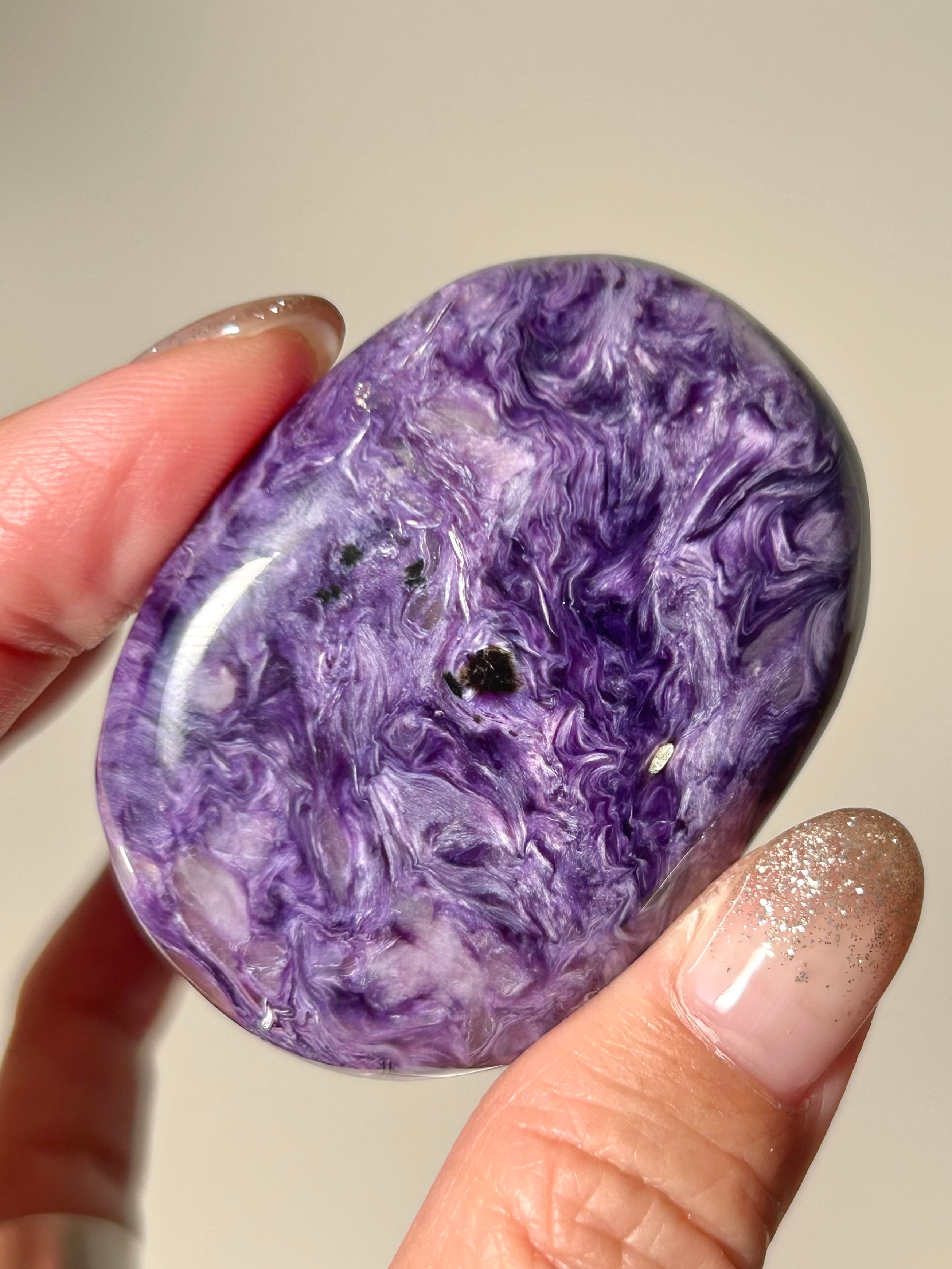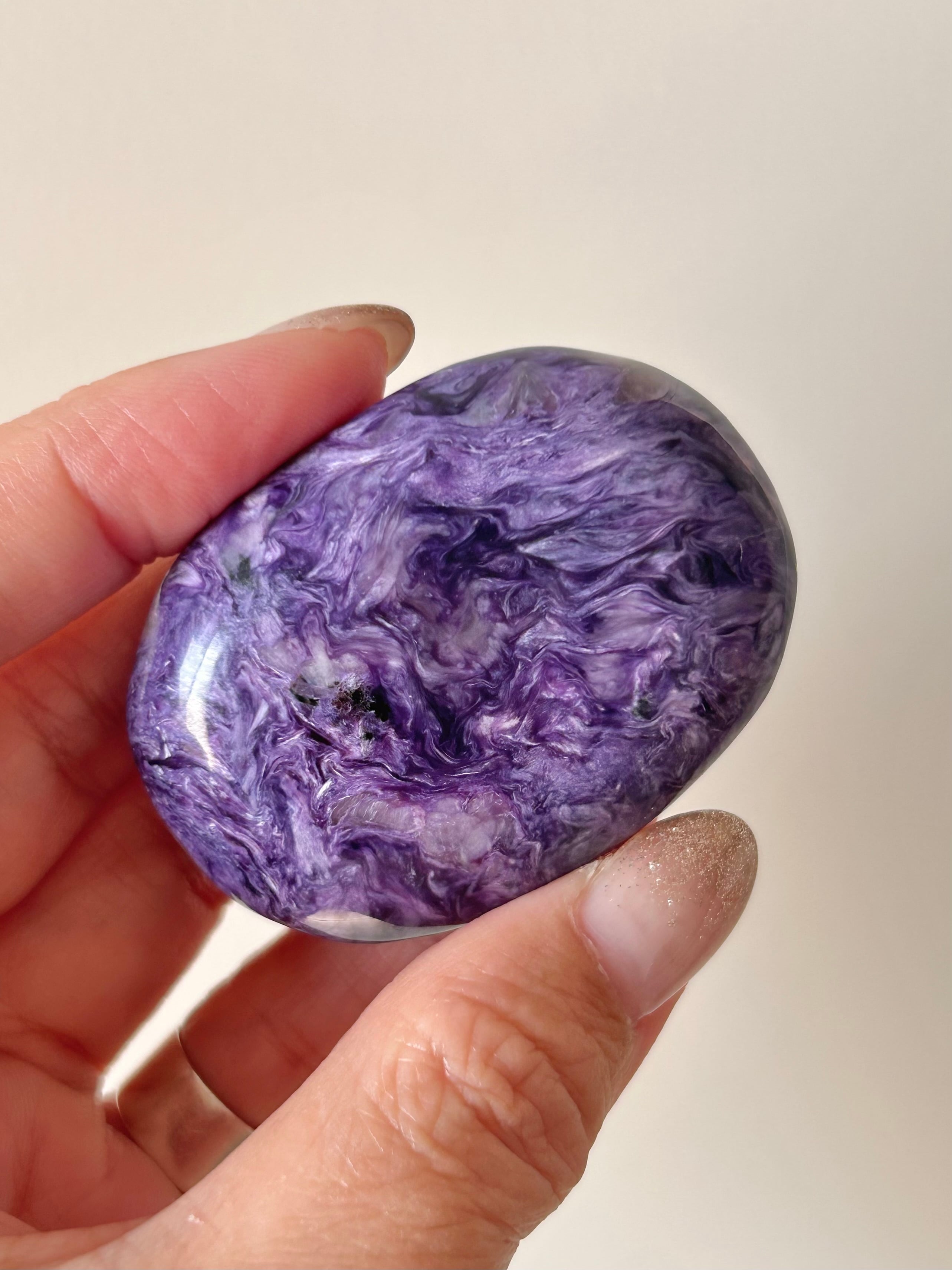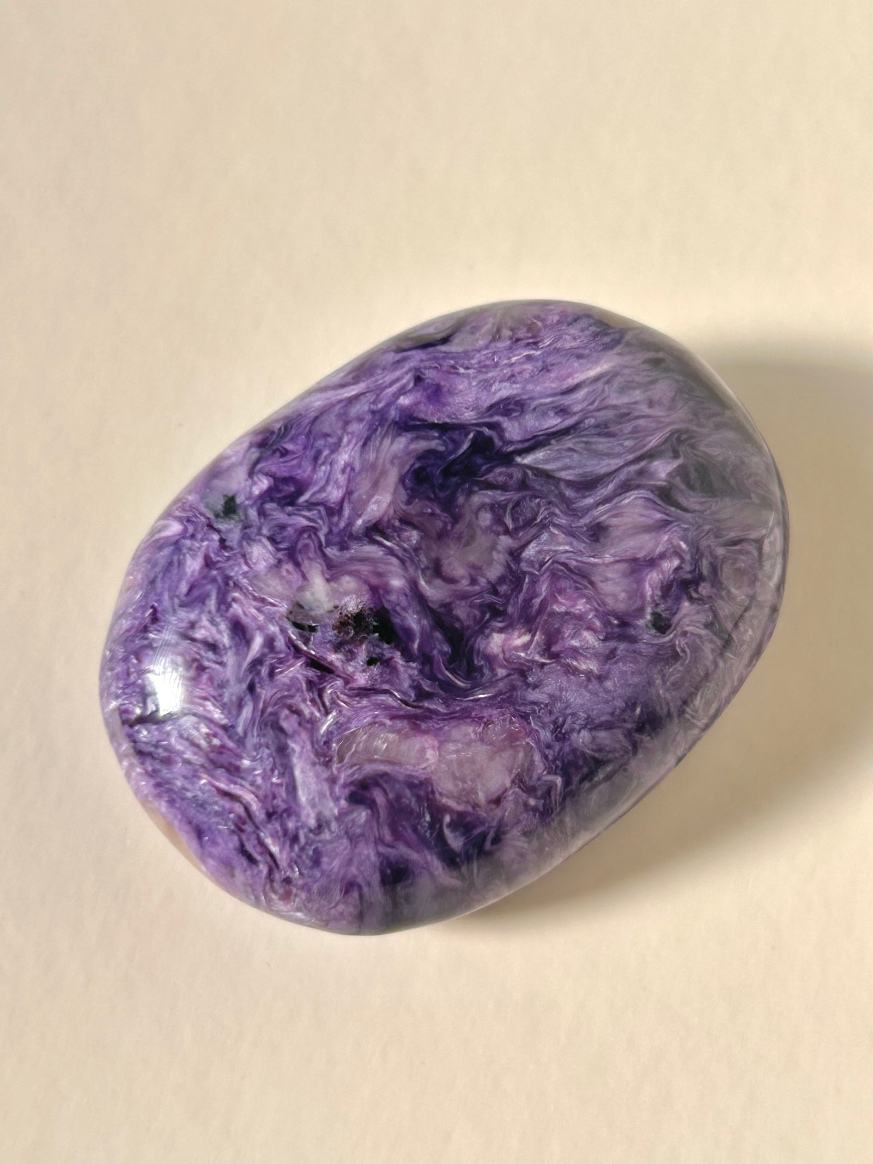 なめらかに磨き上げられたチャロアイトのパームストーン。美しいパープルカラーとマーブル模様が特徴で世界三大ヒーリングストーンの1つと呼ばれており、ヒーリングの力がとても強いとされているストーンです。