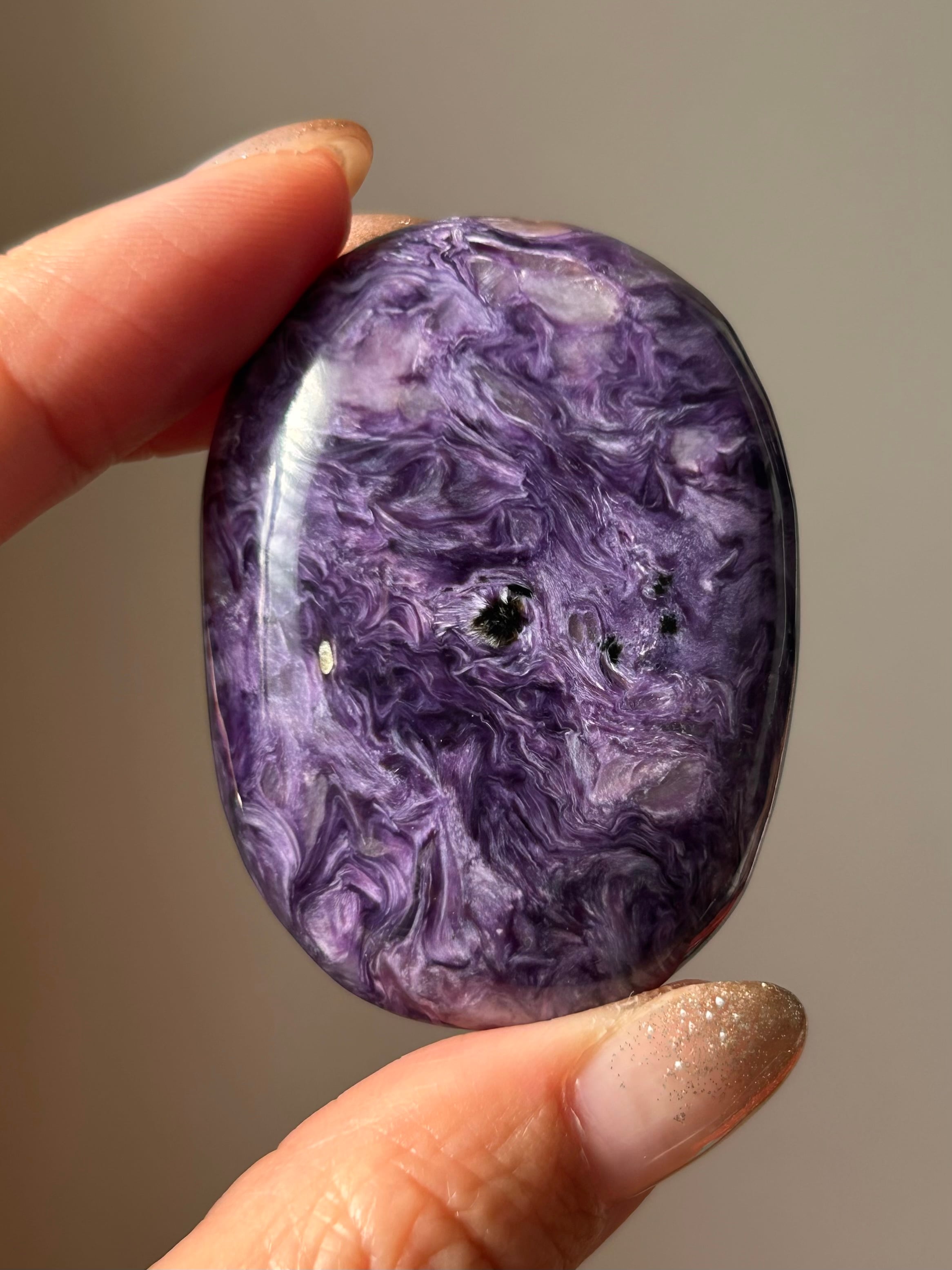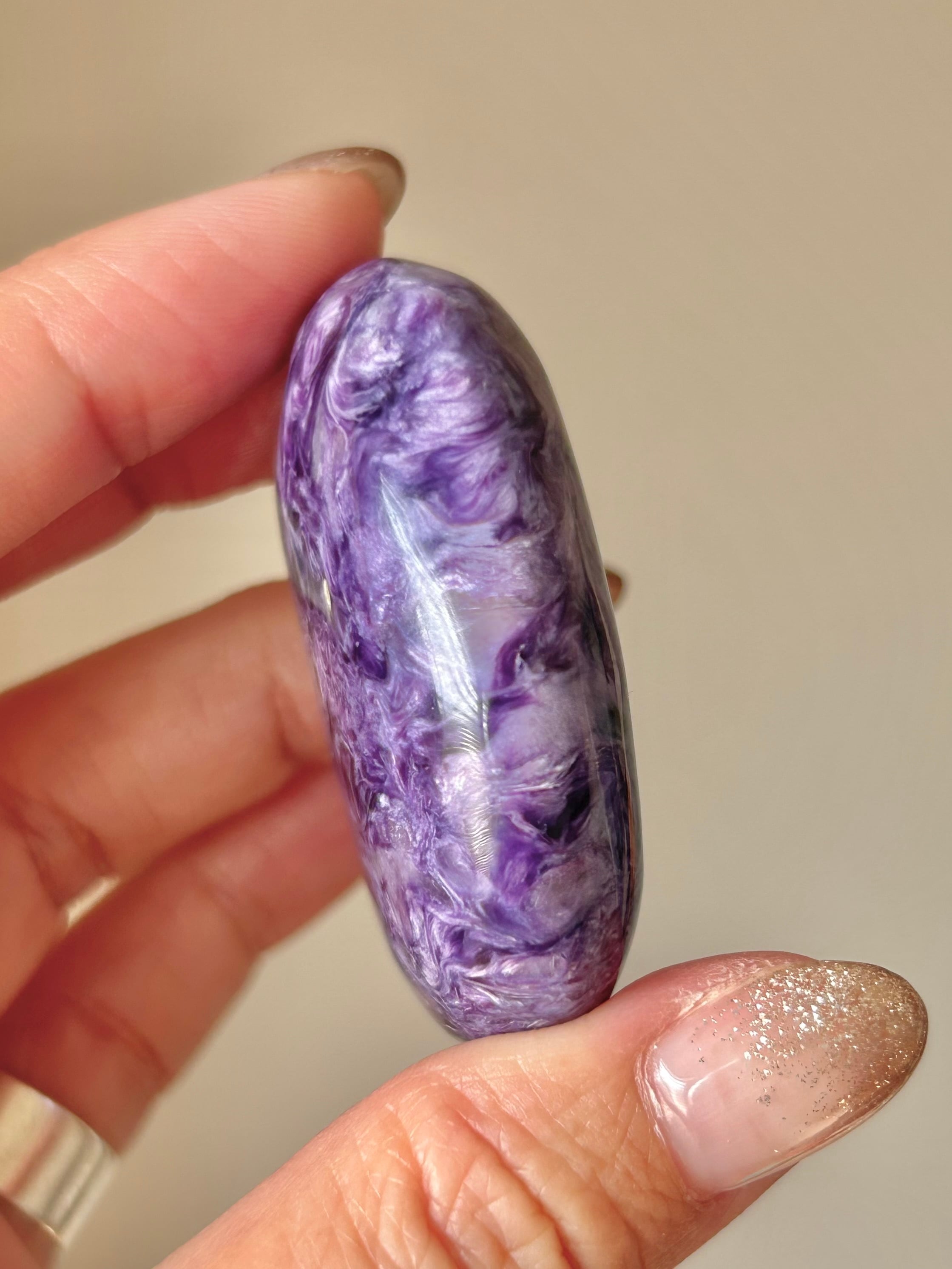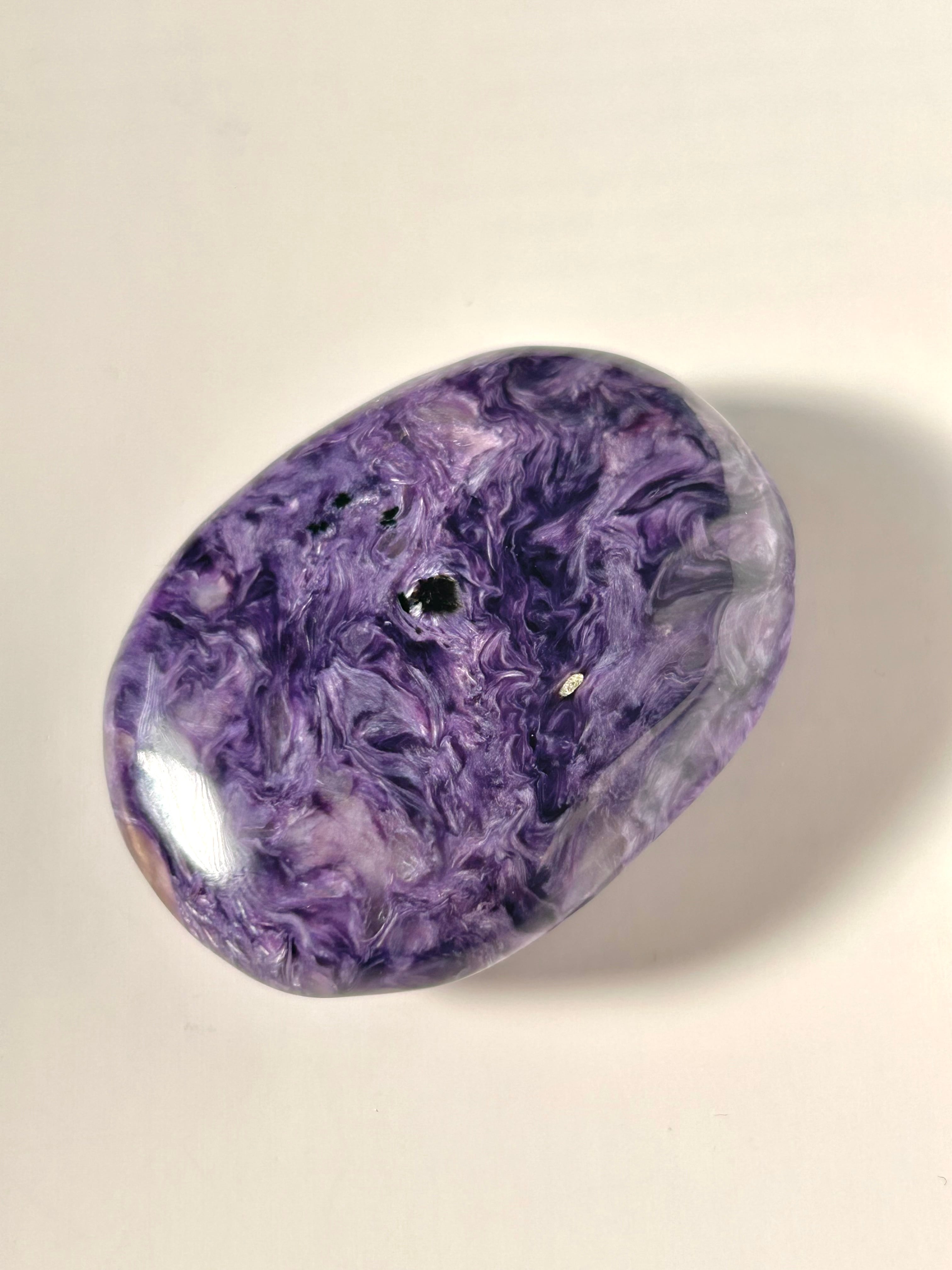 なめらかに磨き上げられたチャロアイトのパームストーン。美しいパープルカラーとマーブル模様が特徴で世界三大ヒーリングストーンの1つと呼ばれており、ヒーリングの力がとても強いとされているストーンです。
