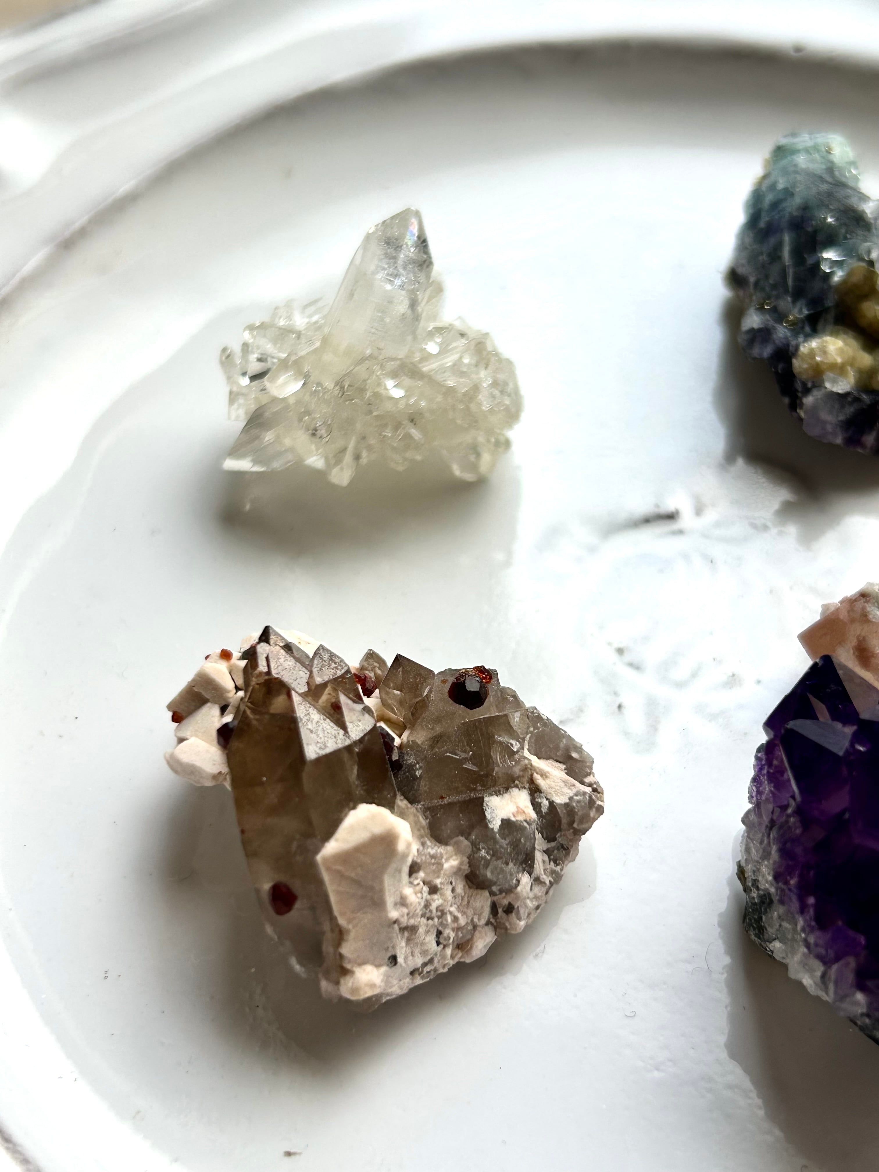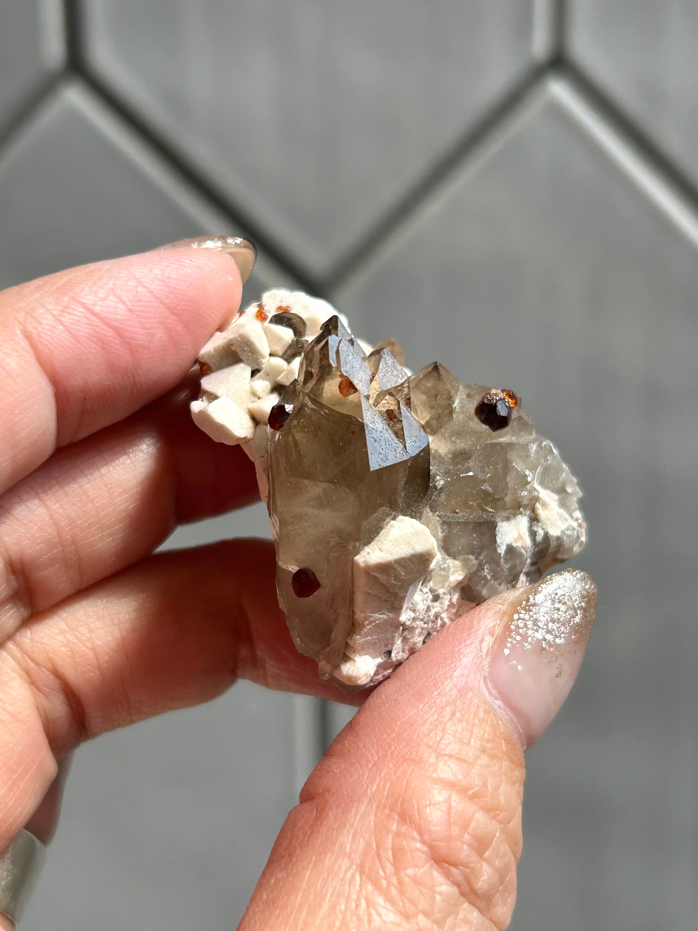 スモーキークォーツにはスペサルティンガーネットが共生。落ち着いたブラウンの中に、深みのあるオレンジレッドが点在し、小さなピースながらも印象的なコントラストを楽しめます。
