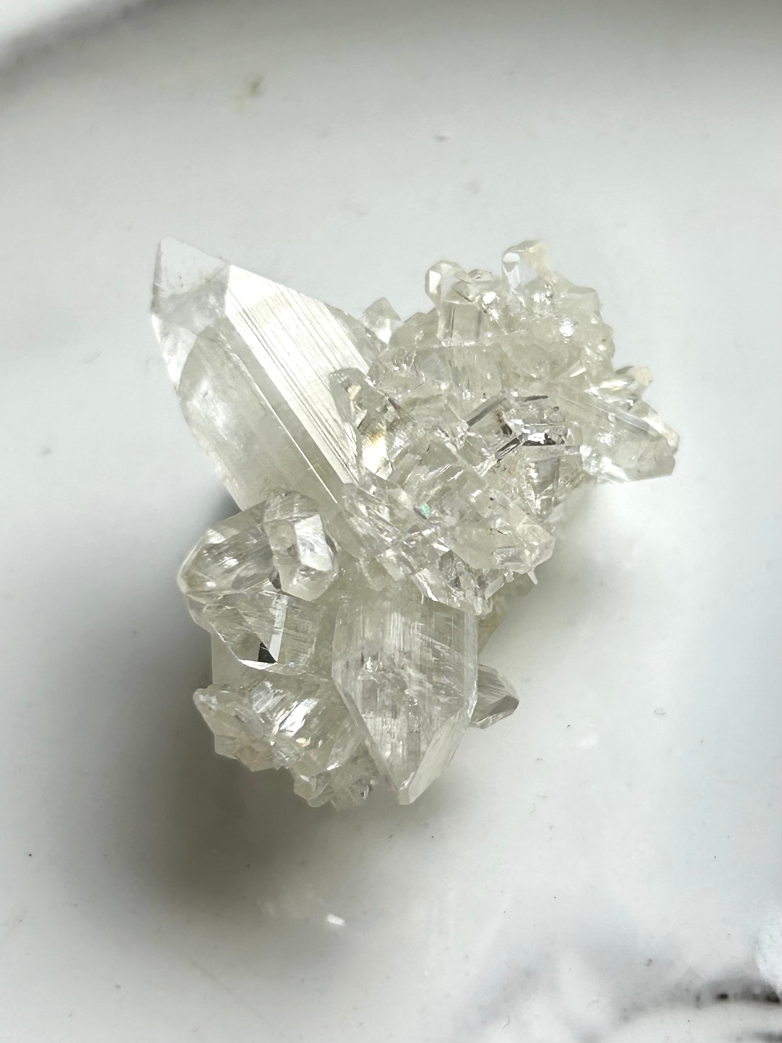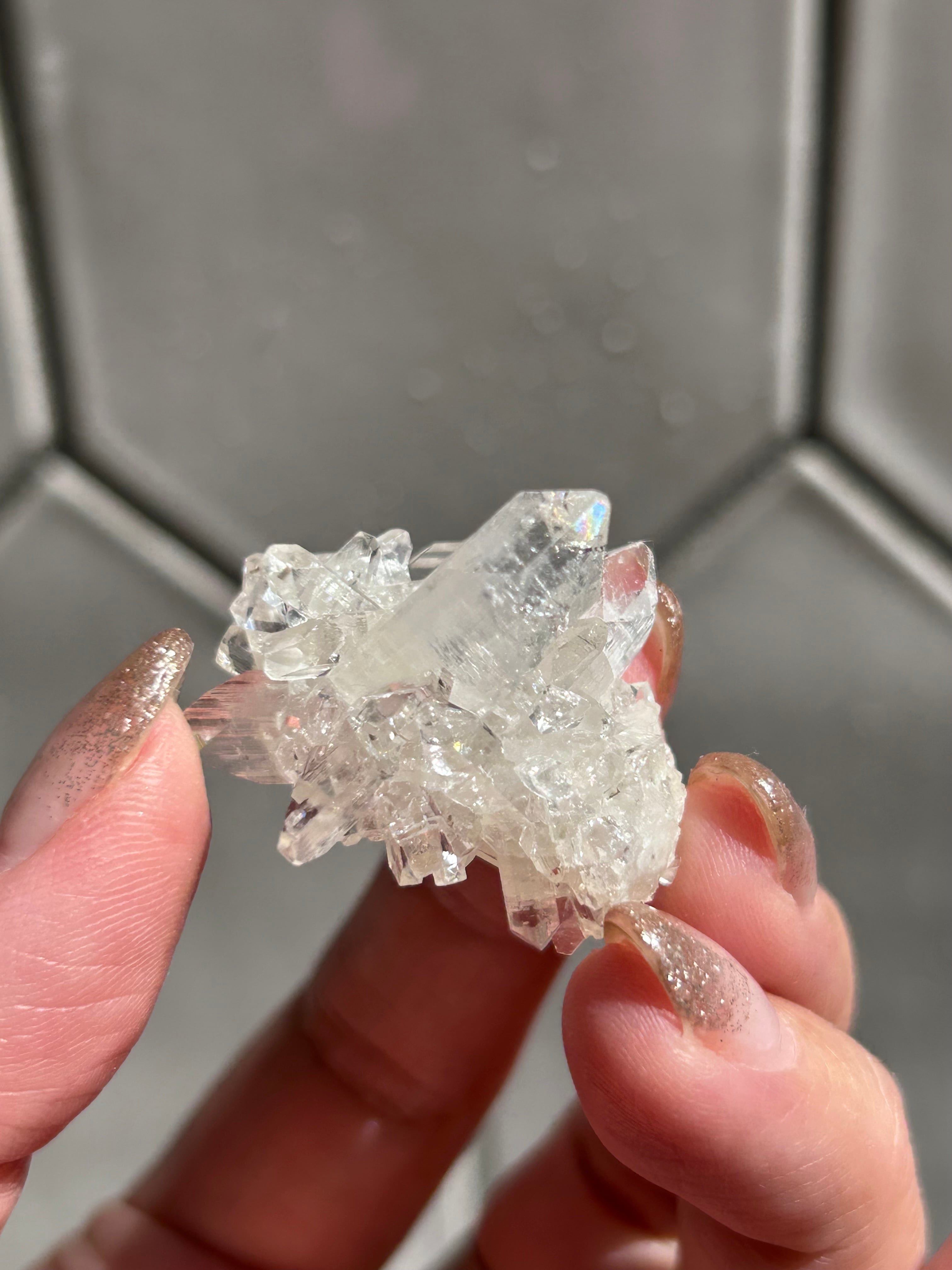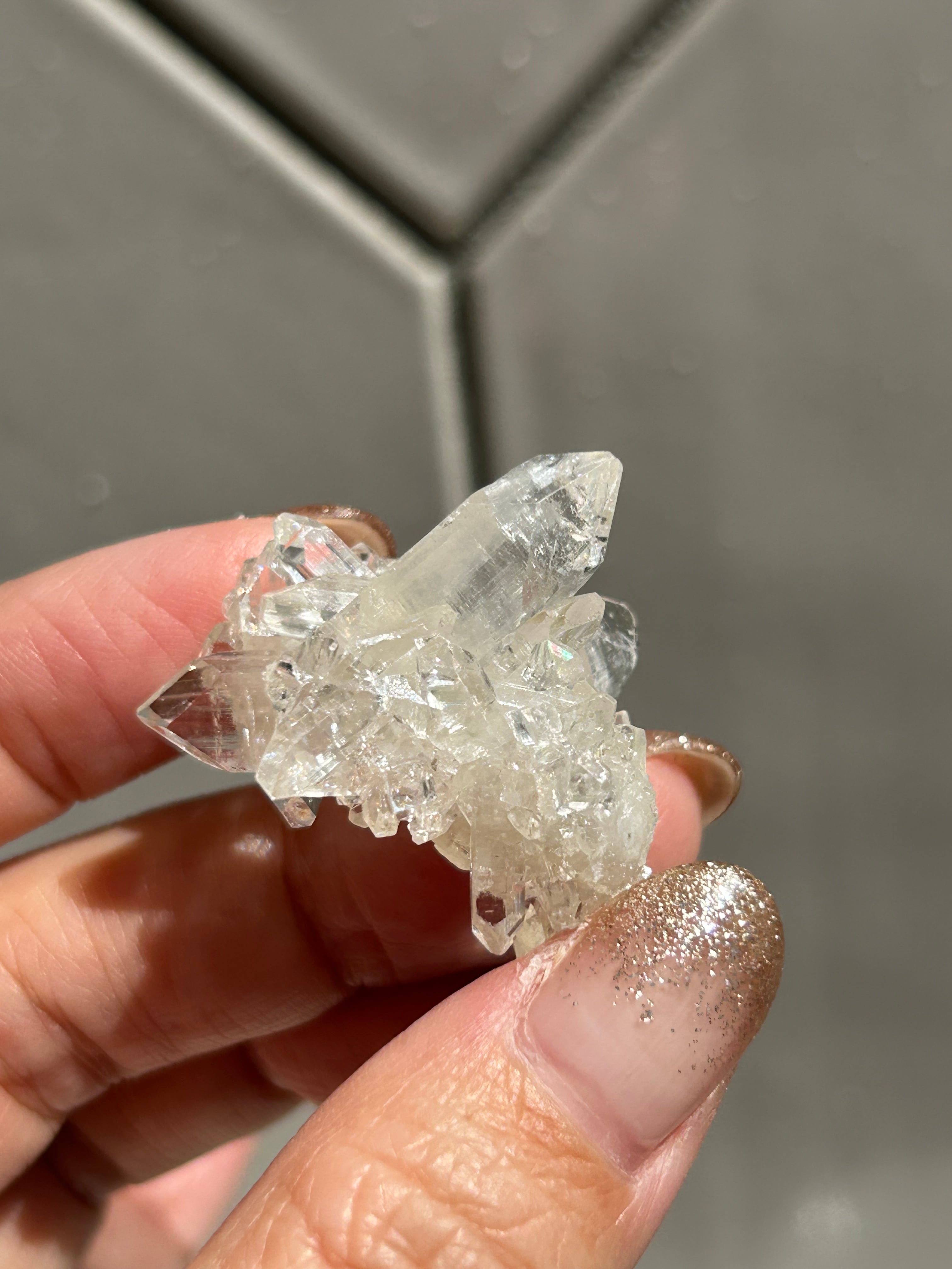 ダイヤモンドアポフィライトは、名前の通りひときわ強い輝き。細かな面が光を受けて、シャープに、そして軽やかに煌めきます。