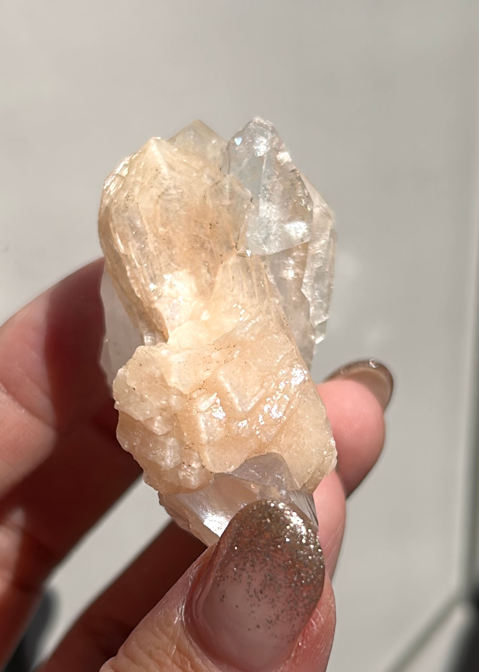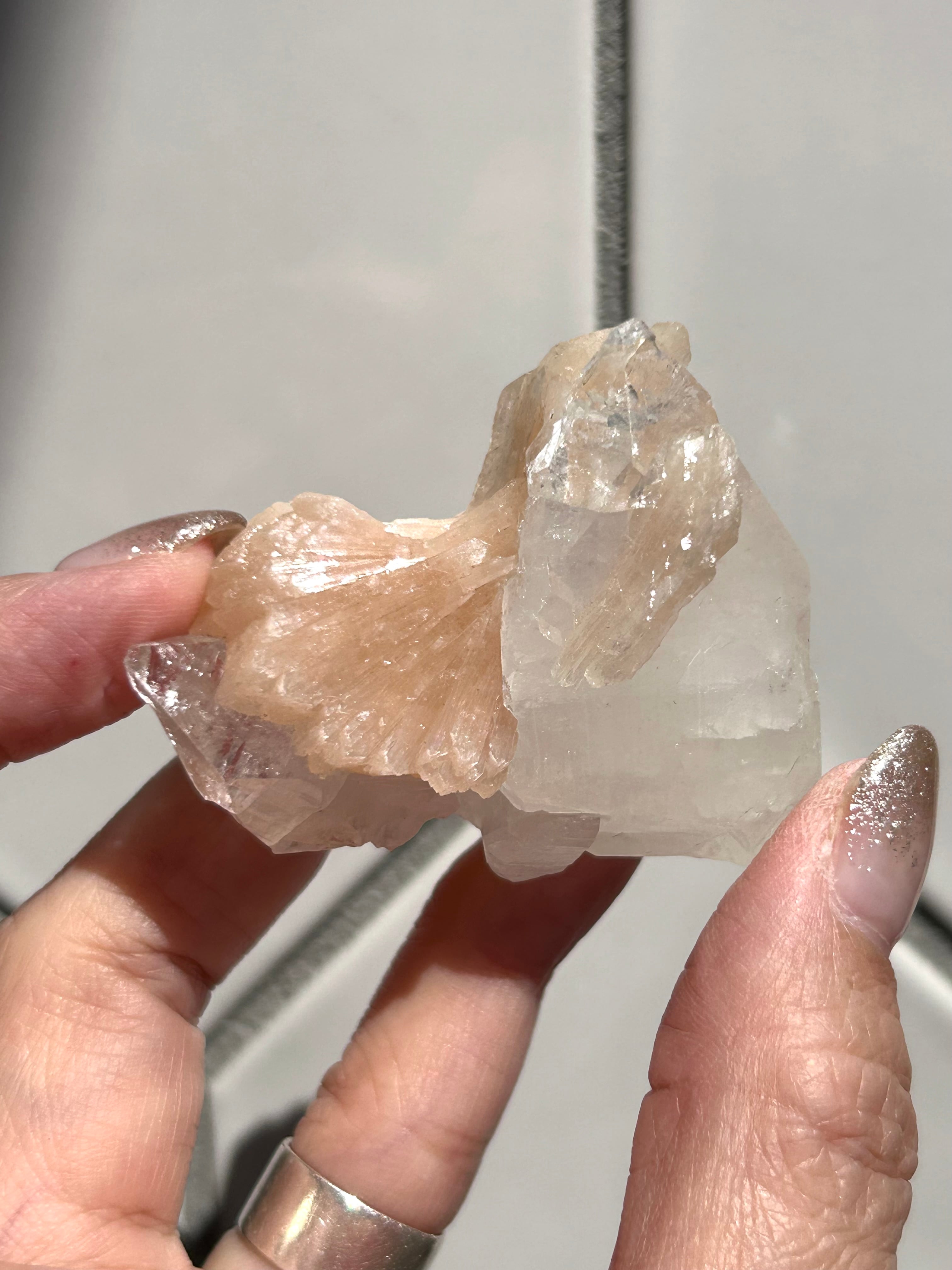 光を浴びてシルバーのような輝きを放つアポフィライトの結晶に、やわらかなピーチカラーが重なるこの美しい組み合わせ。