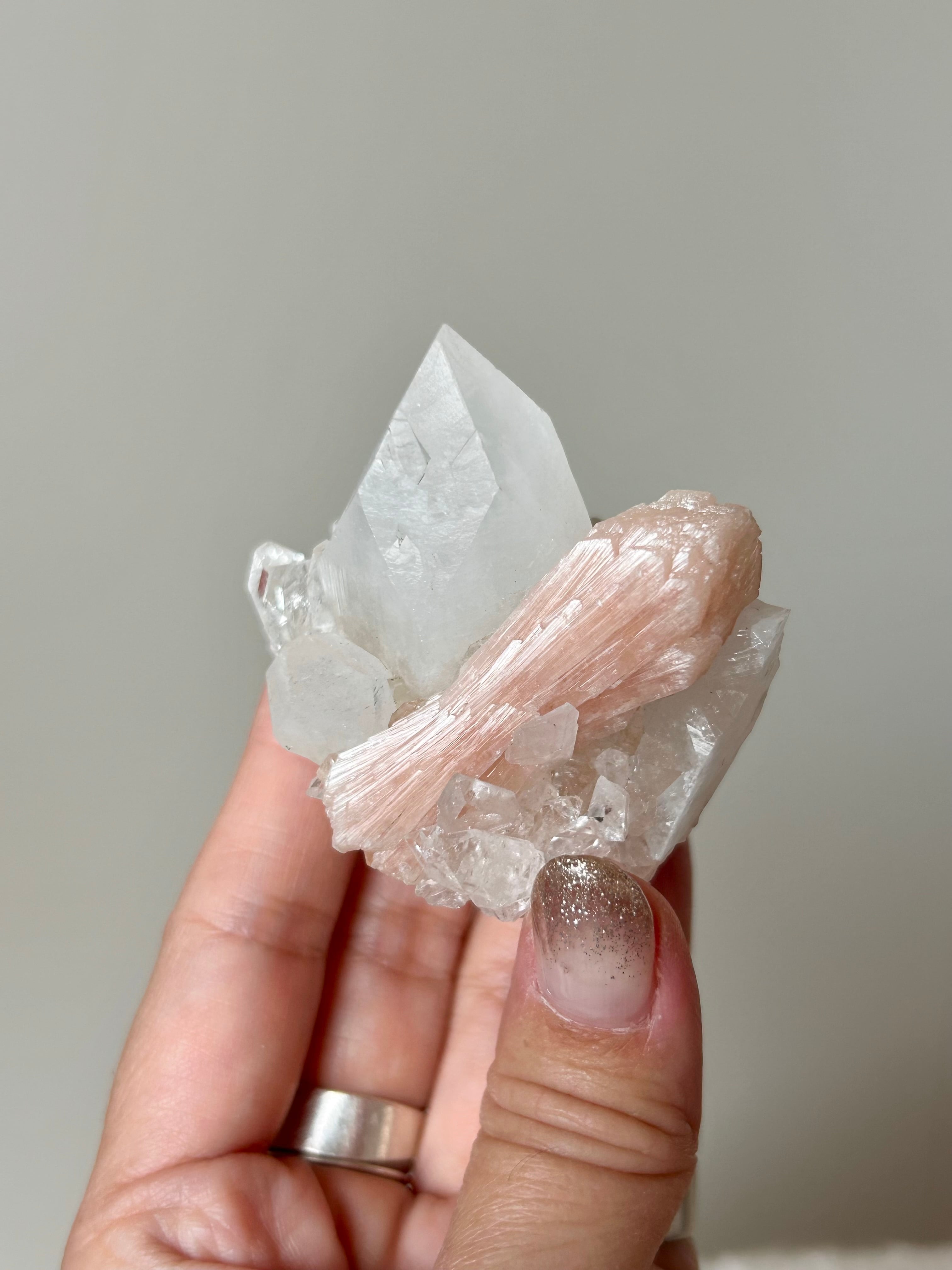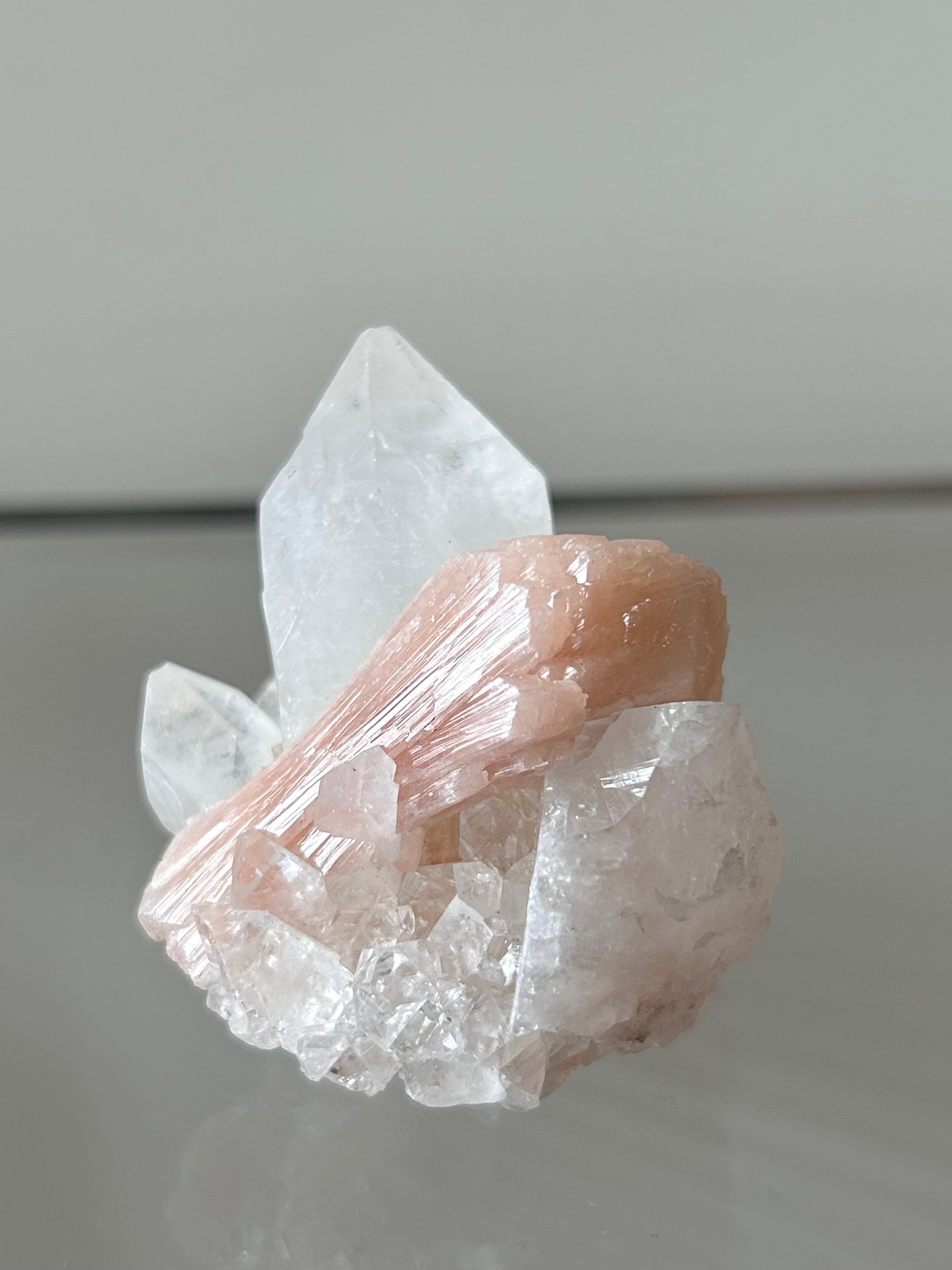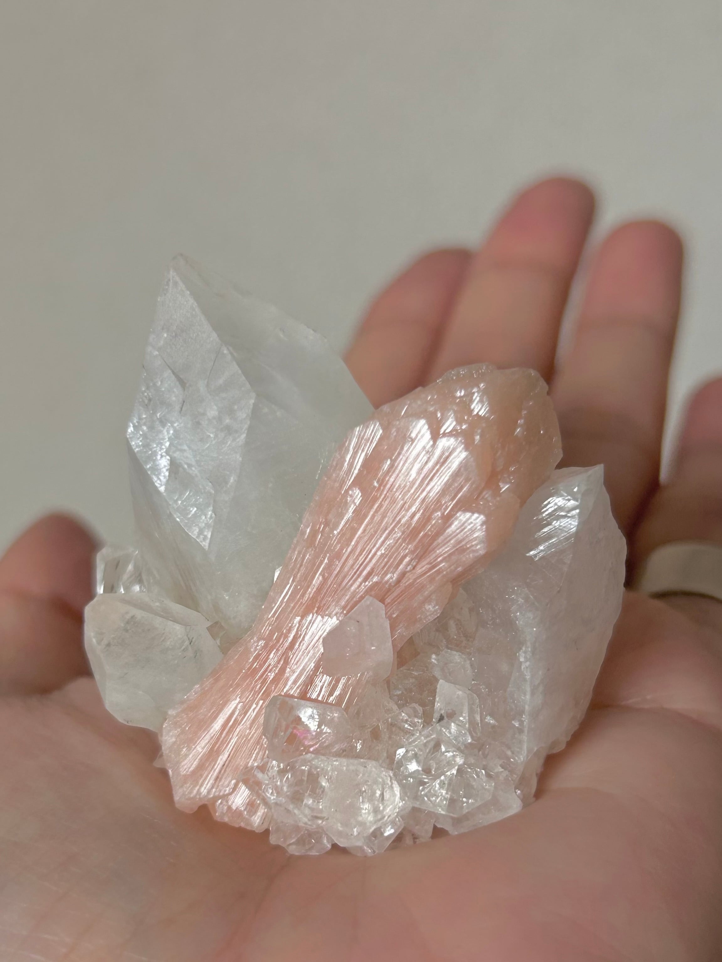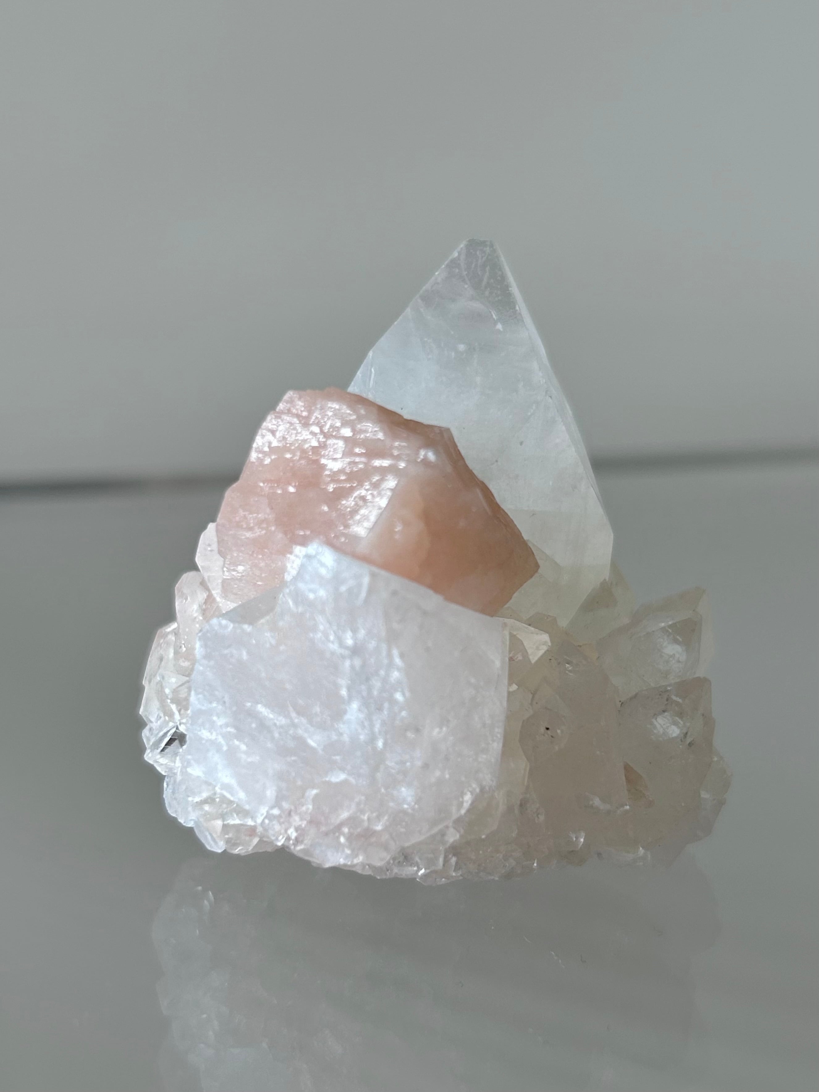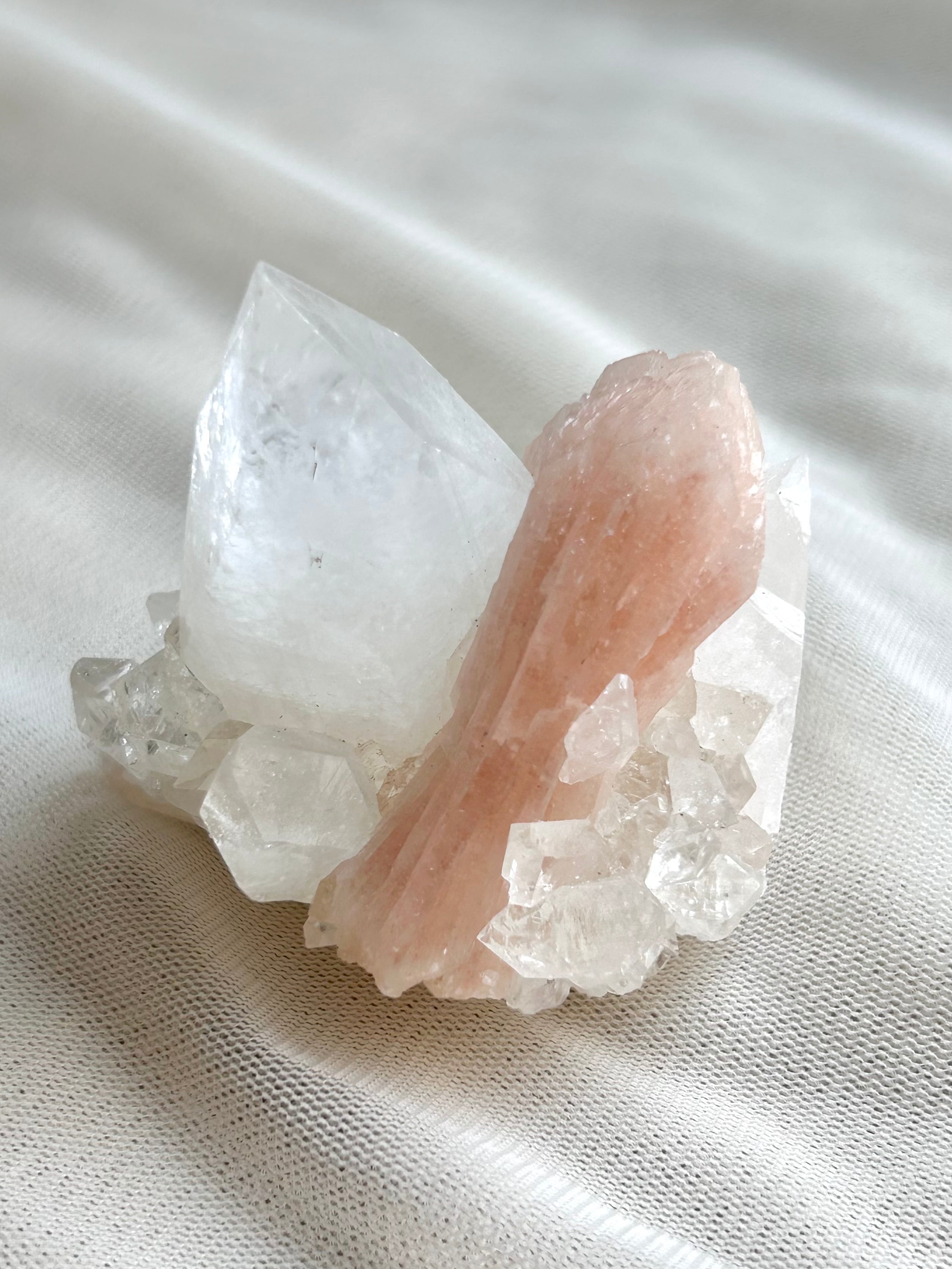 光を浴びてシルバーのような輝きを放つアポフィライトの結晶に、やわらかなピーチカラーが重なるこの美しい組み合わせ。