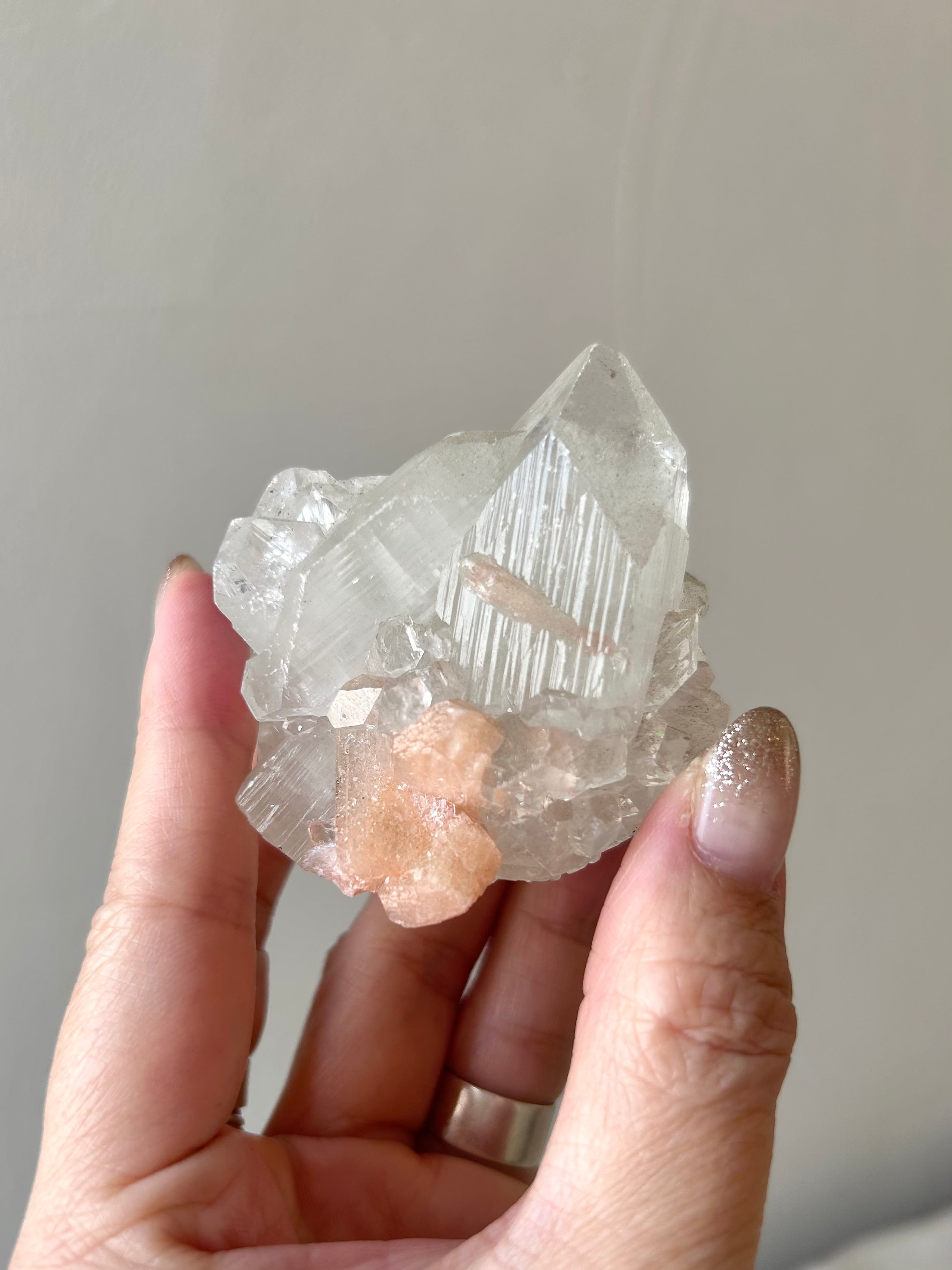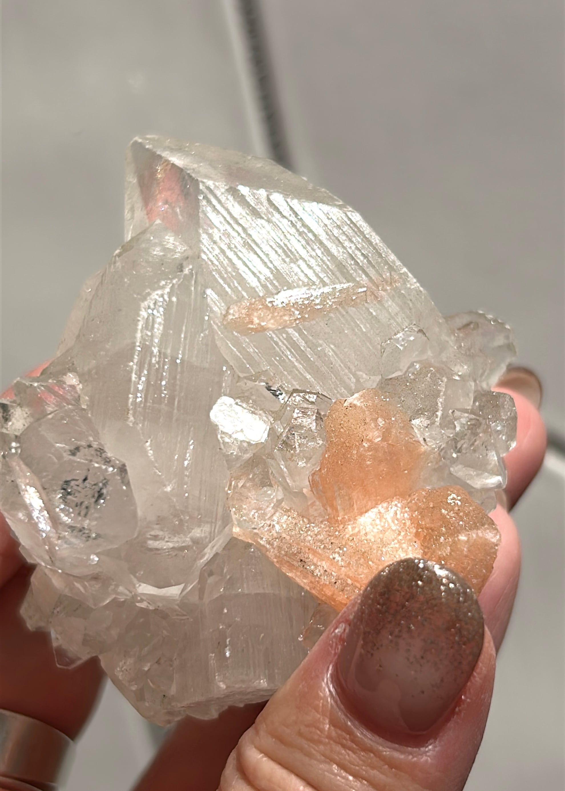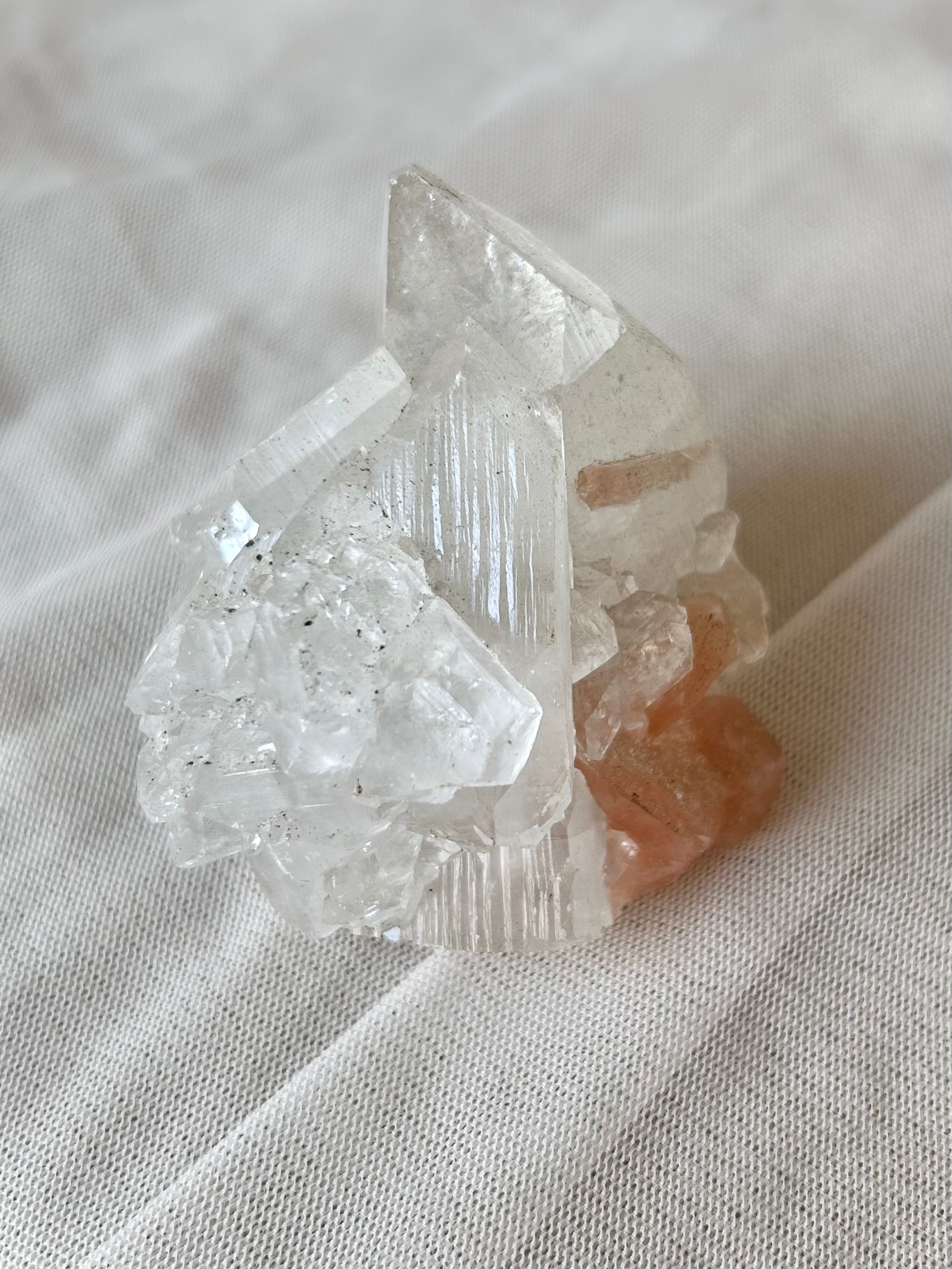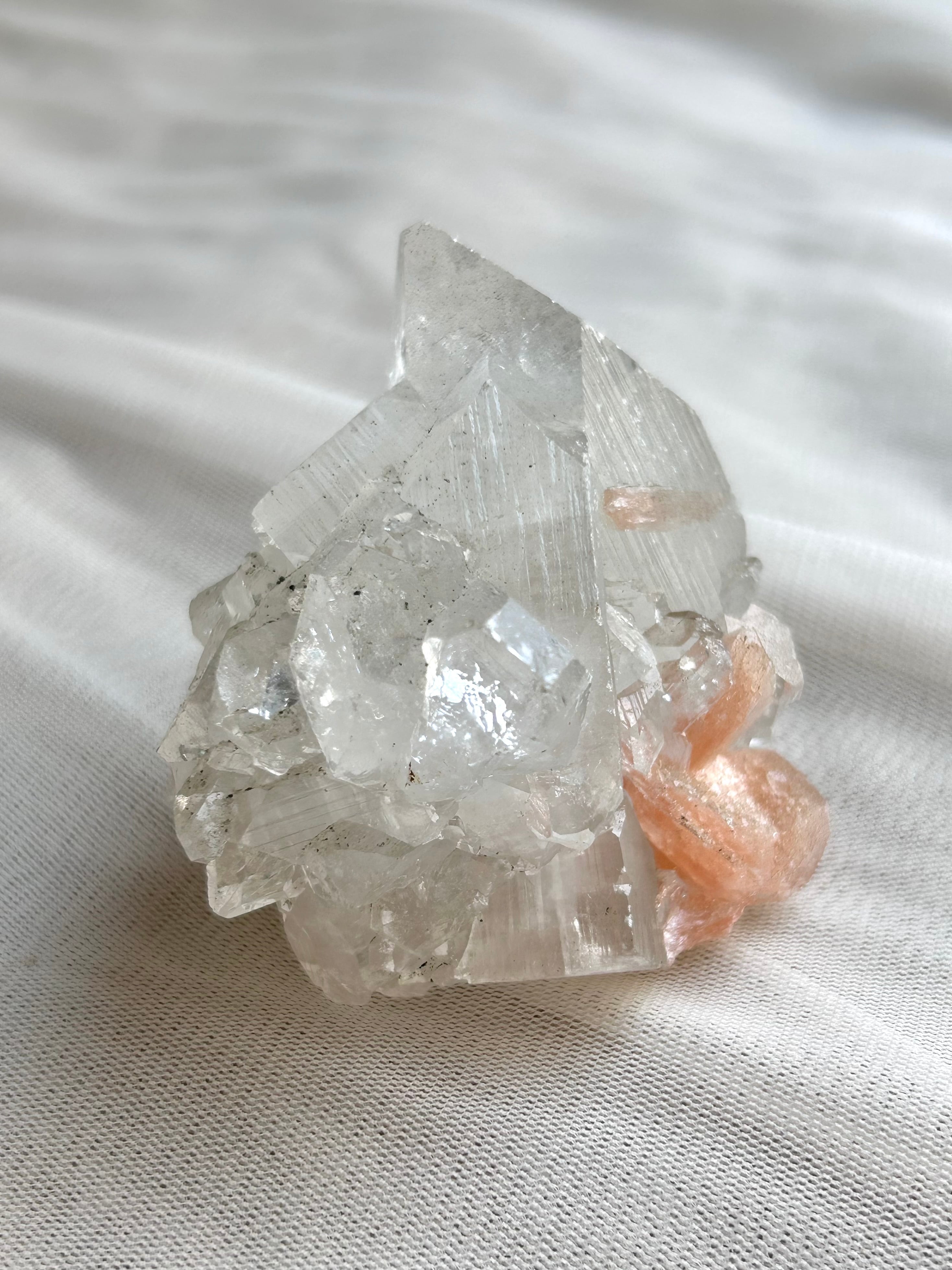 光を浴びてシルバーのような輝きを放つアポフィライトの結晶に、やわらかなピーチカラーが重なるこの美しい組み合わせ。