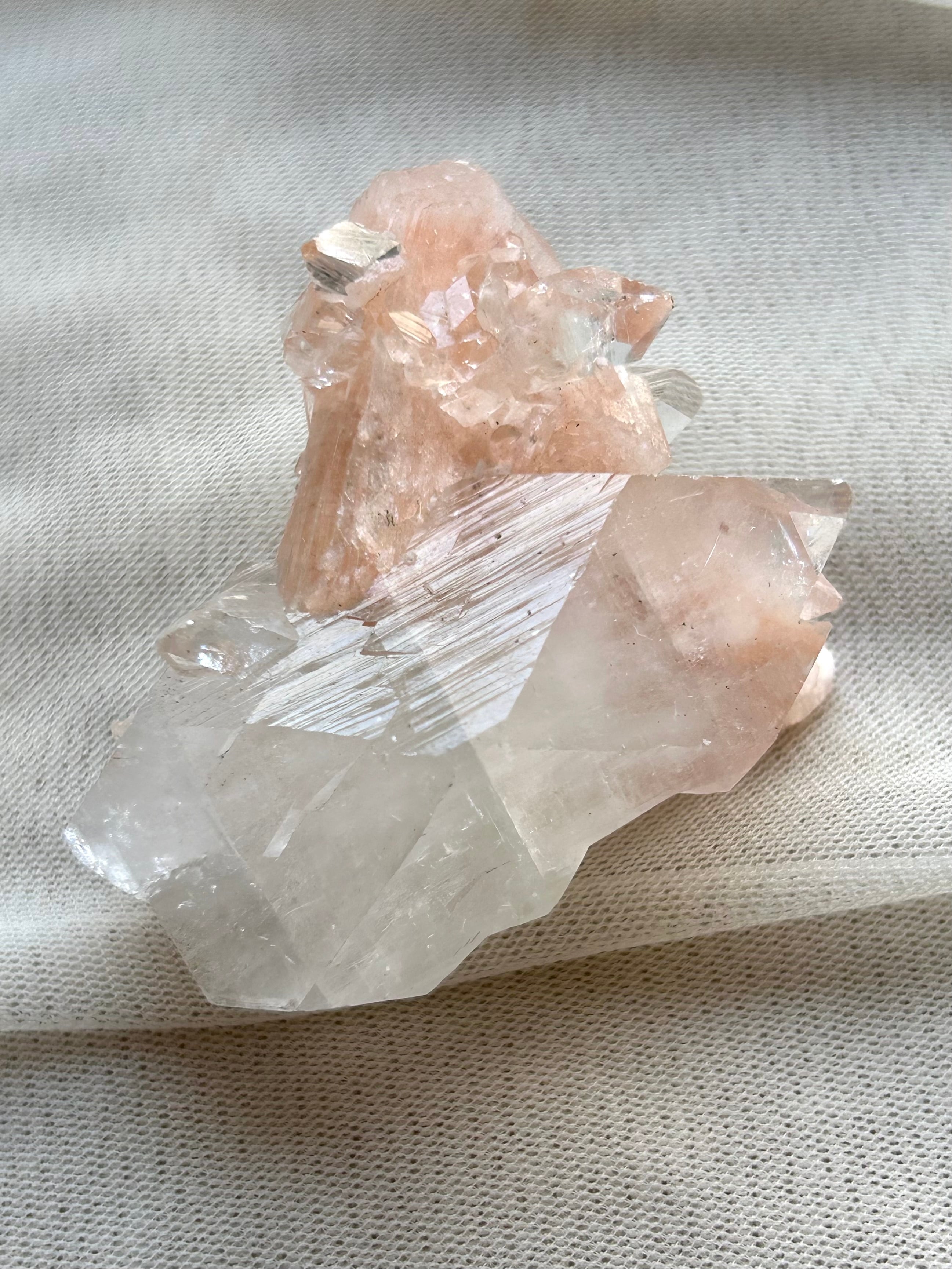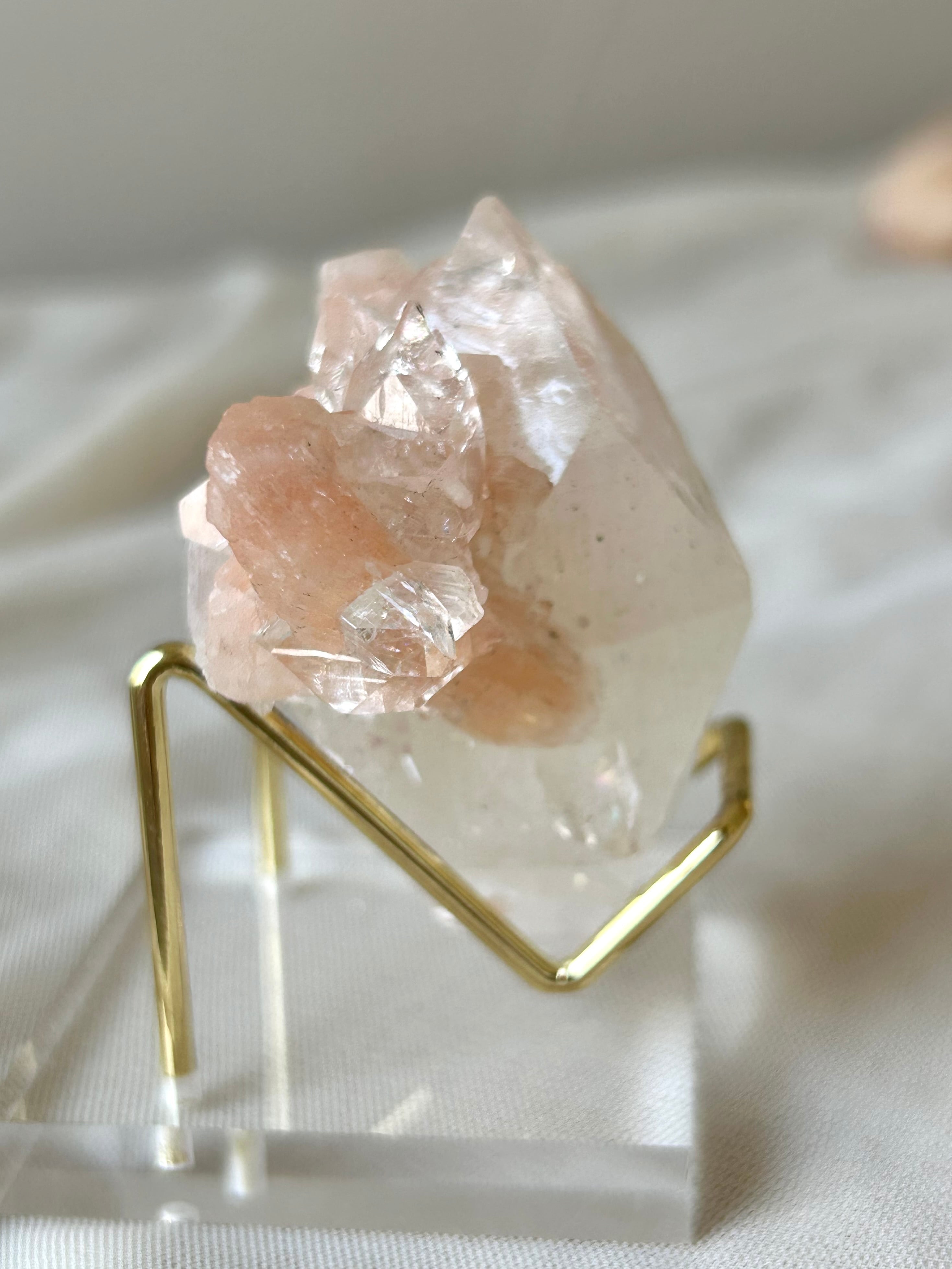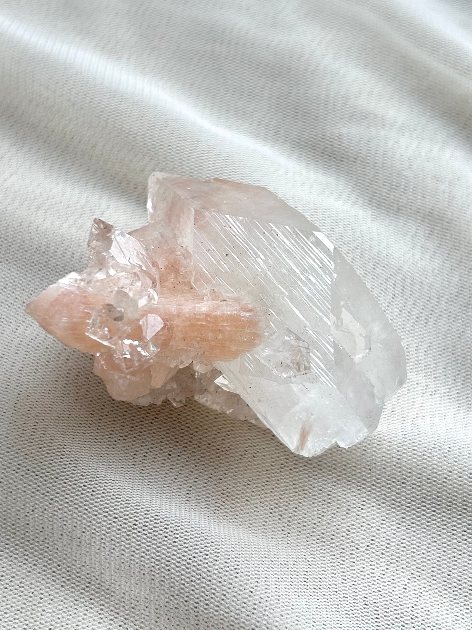光を浴びてシルバーのような輝きを放つアポフィライトの結晶に、やわらかなピーチカラーが重なるこの美しい組み合わせ。