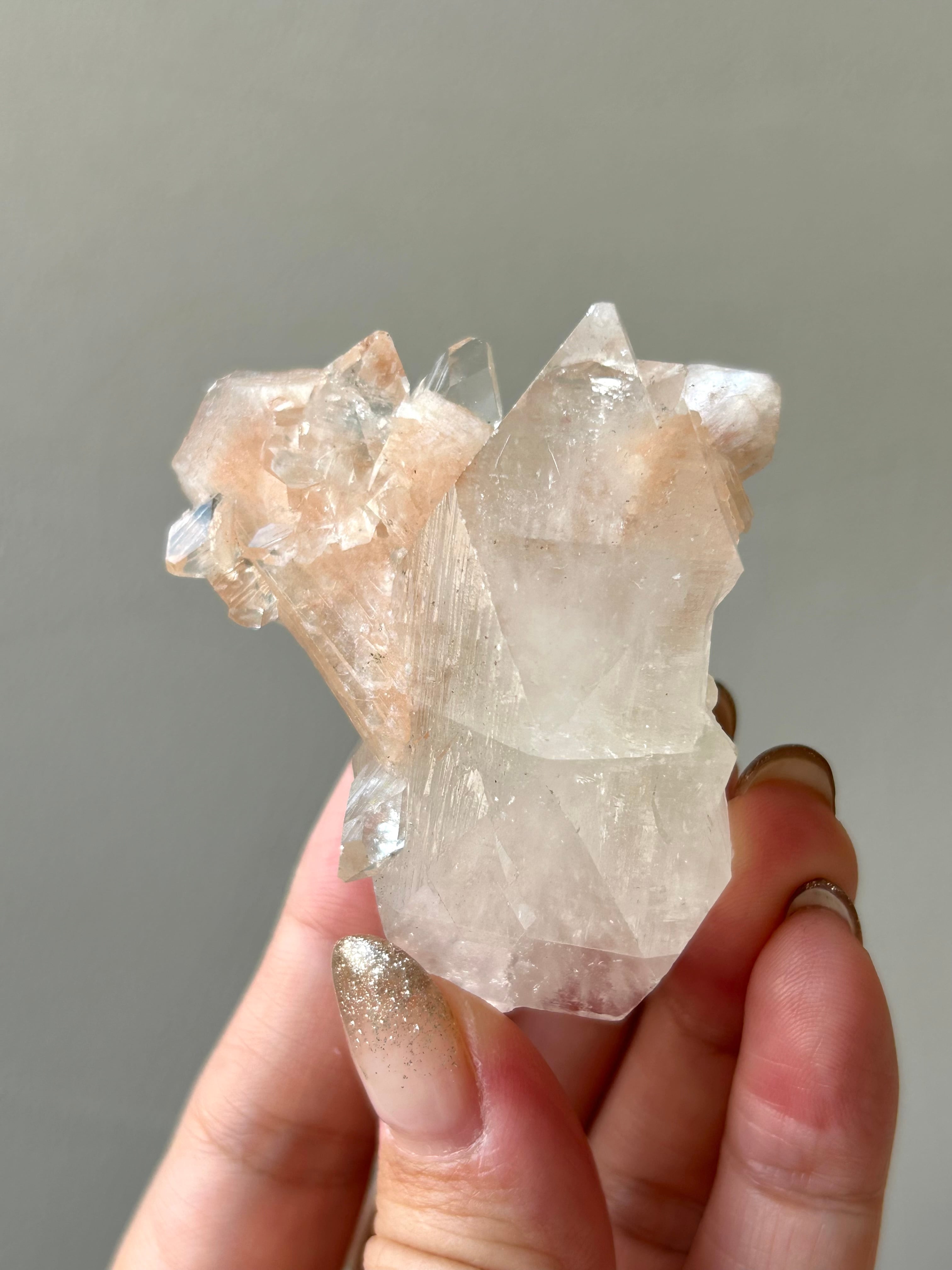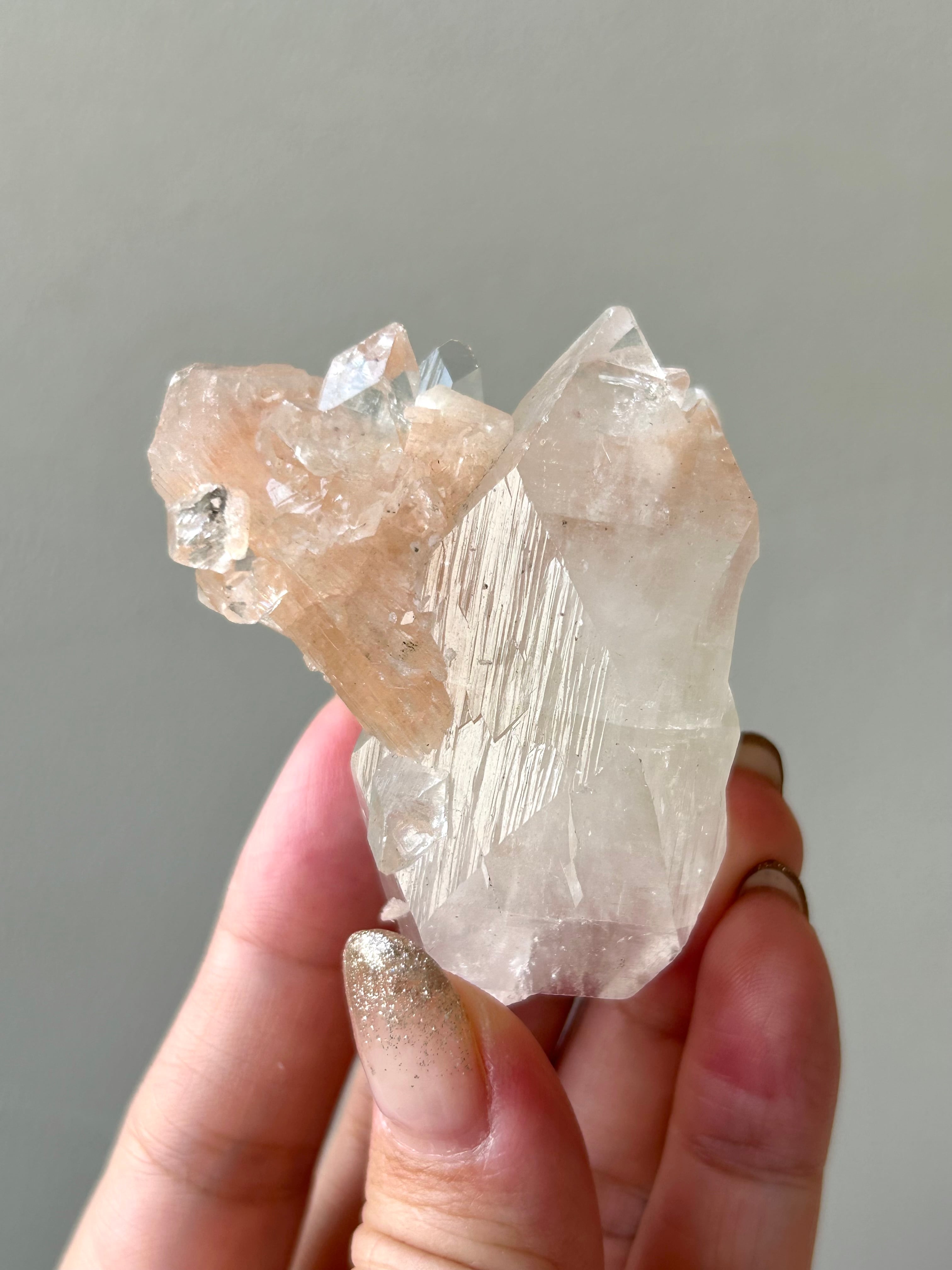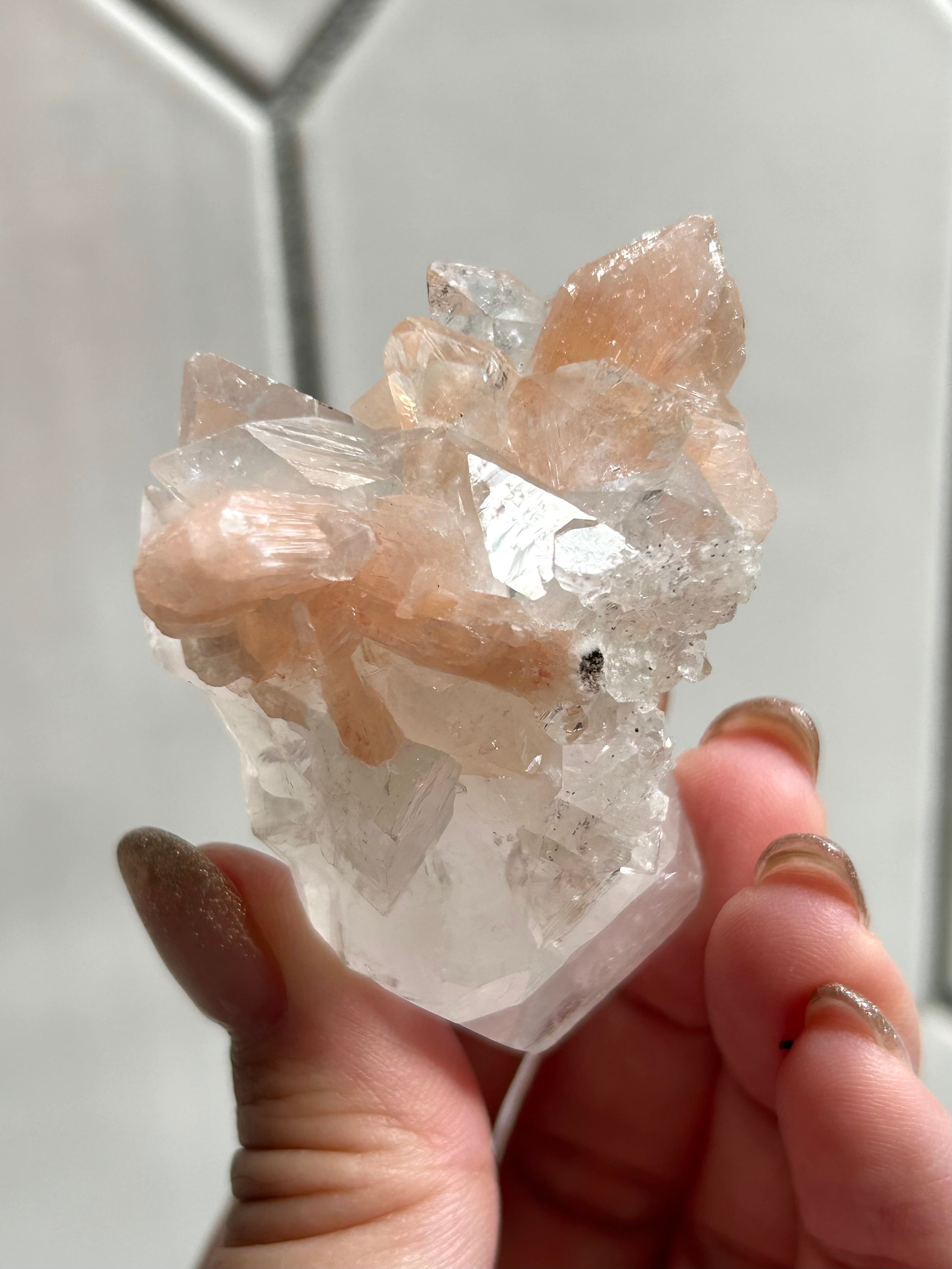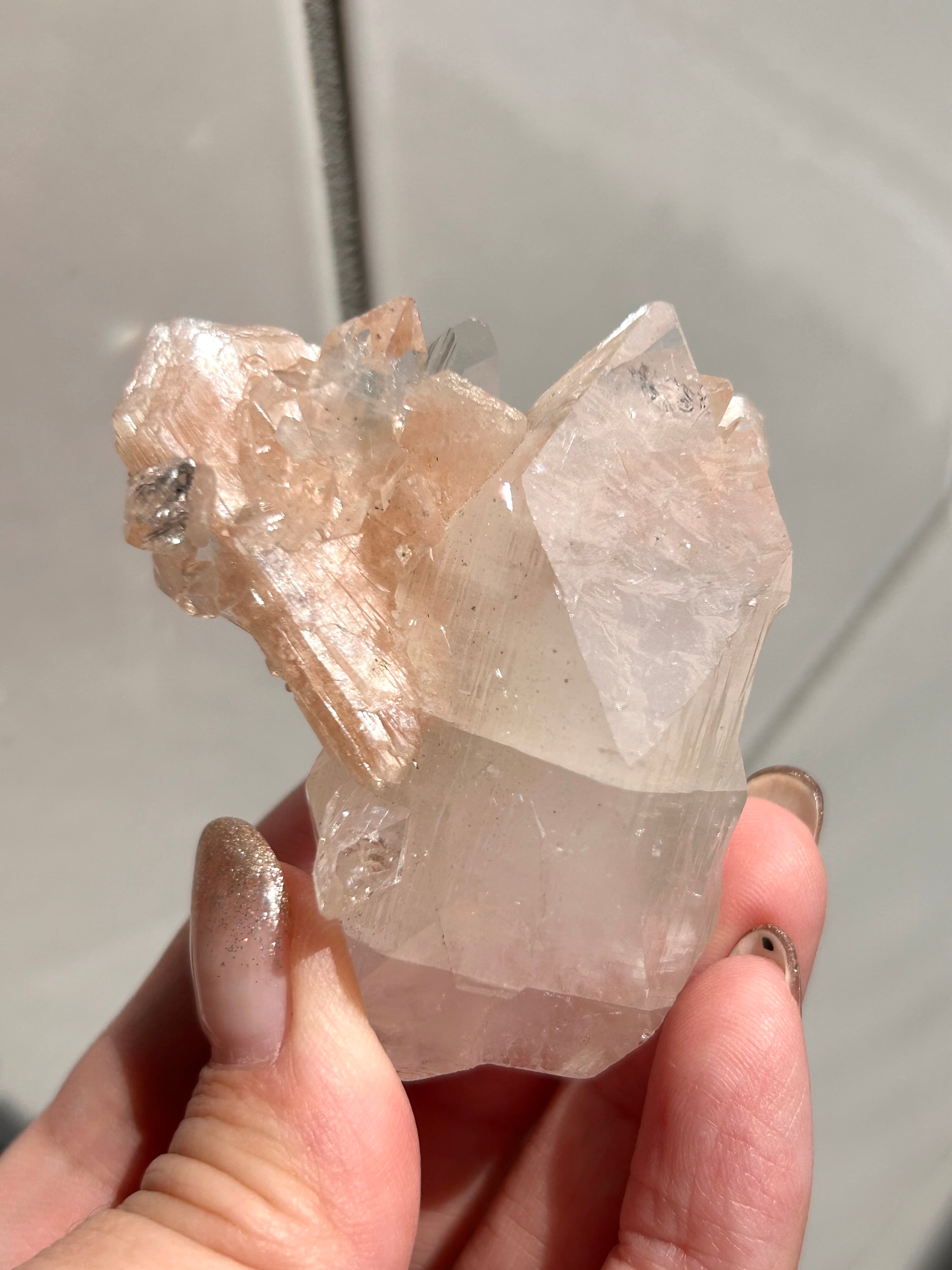 光を浴びてシルバーのような輝きを放つアポフィライトの結晶に、やわらかなピーチカラーが重なるこの美しい組み合わせ。