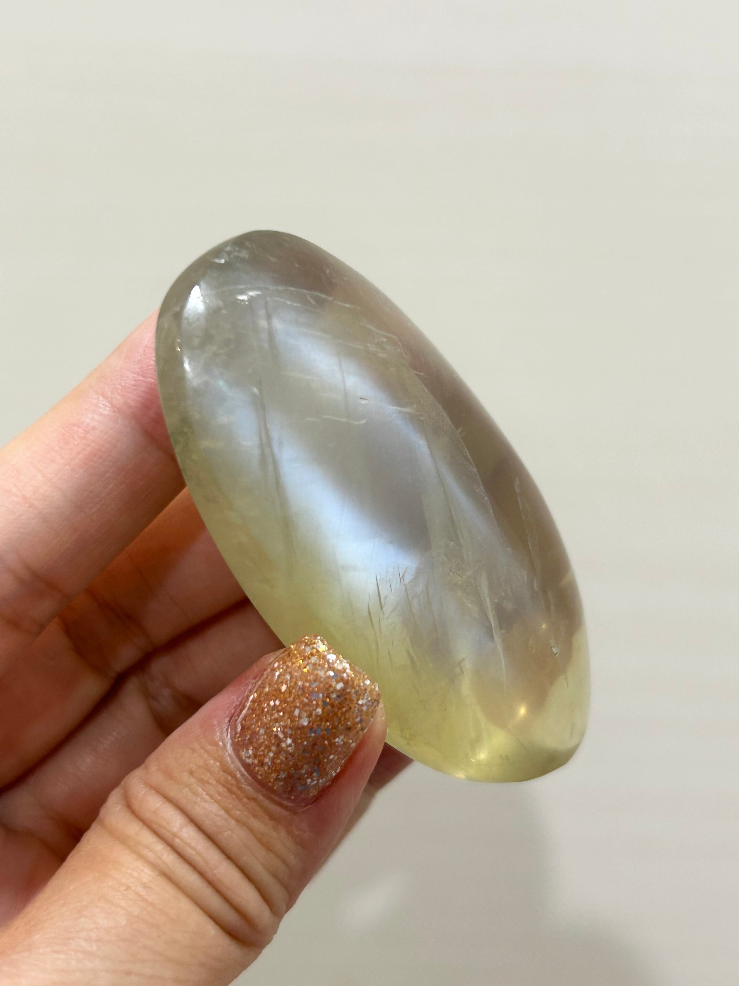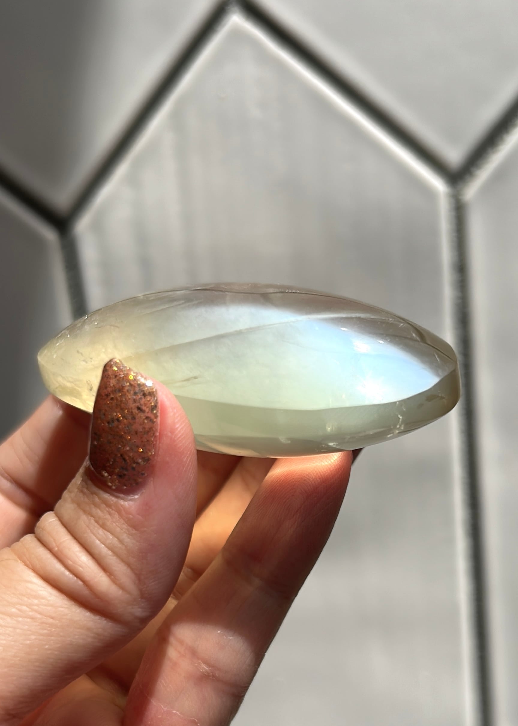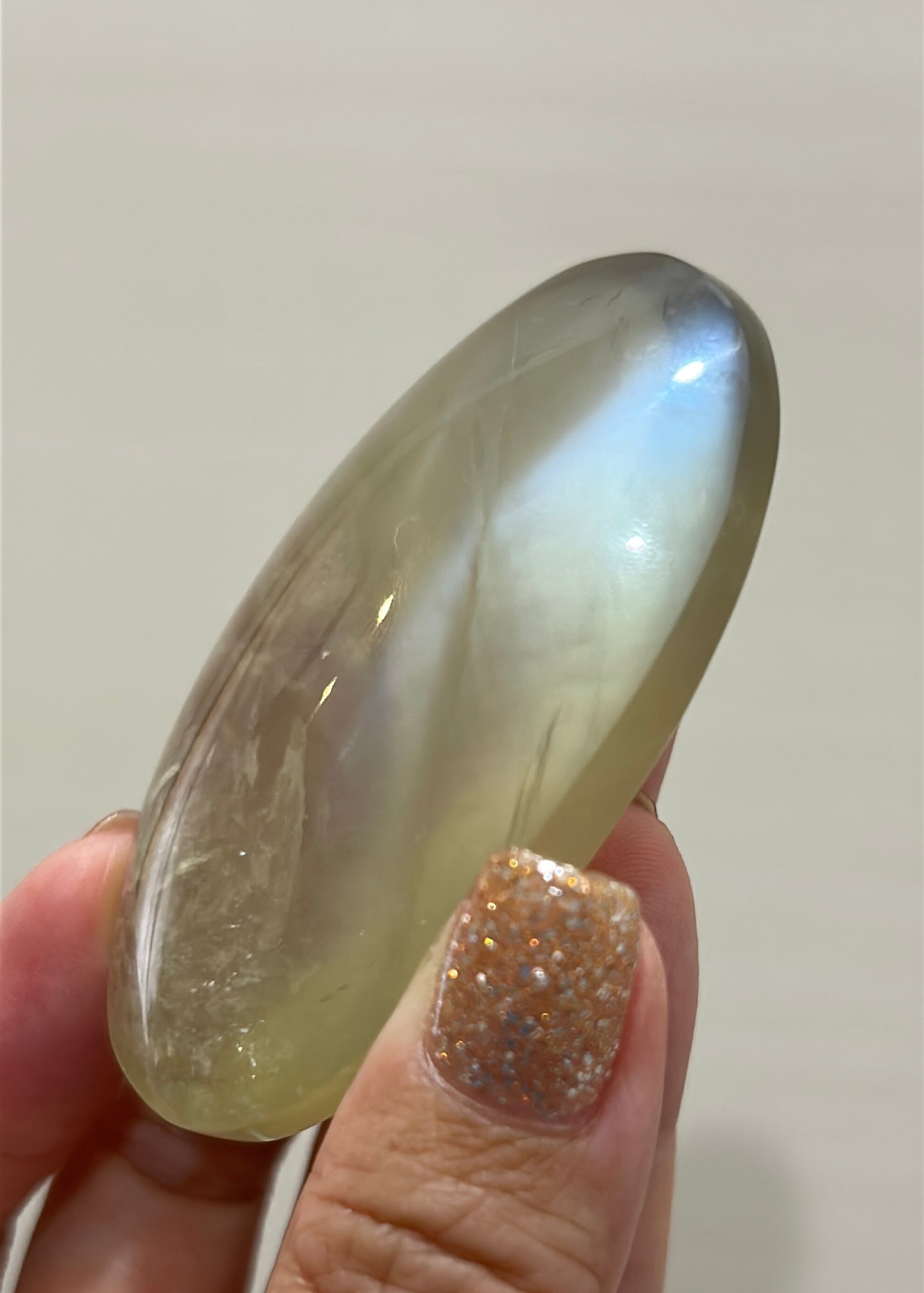 角度を変えるたびに、ほのかに青く白い光が静かに揺らめくロマンティックで神秘的な雰囲気を纏ったクリアなグリーンムーンストーン!その世界観がもう当店のセレクトにハマりすぎて、沢山仕入れたかったのですが当店では4個のみの入荷となりました…泣