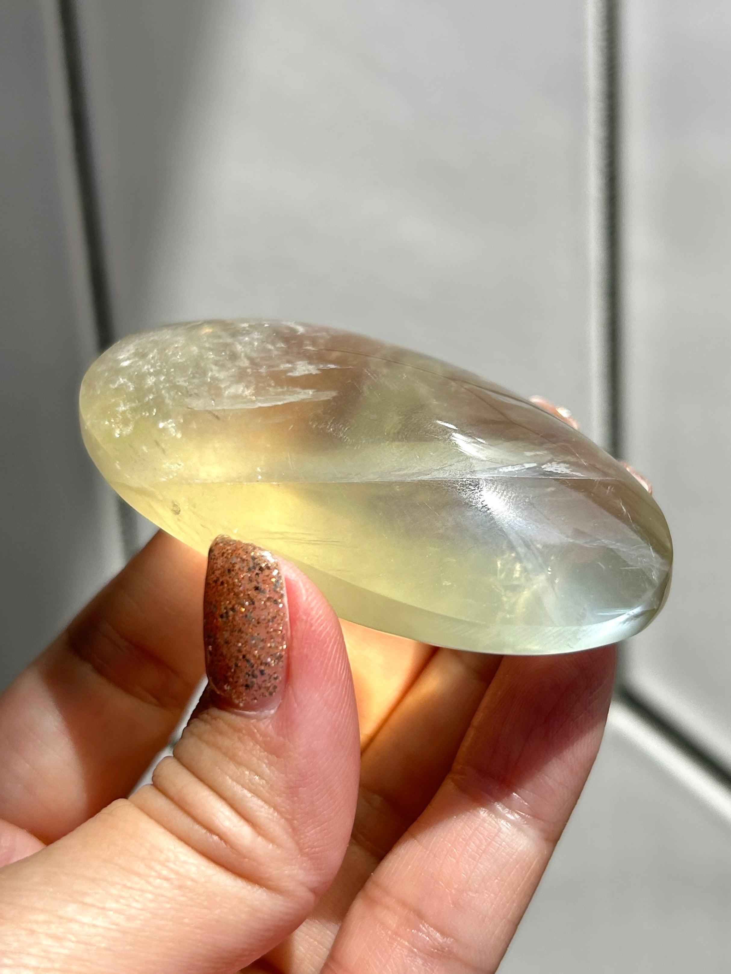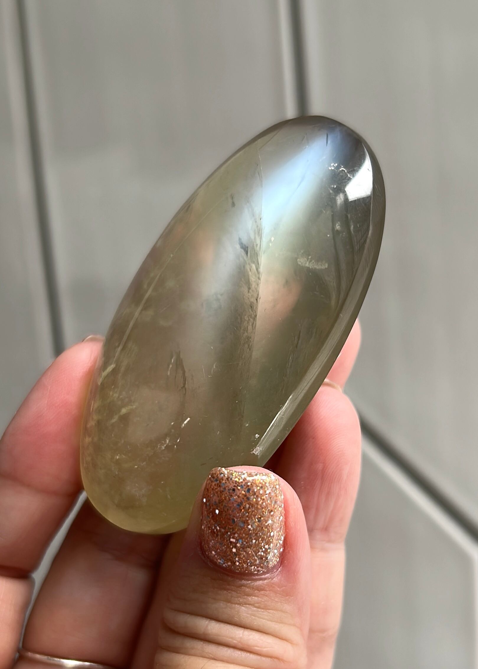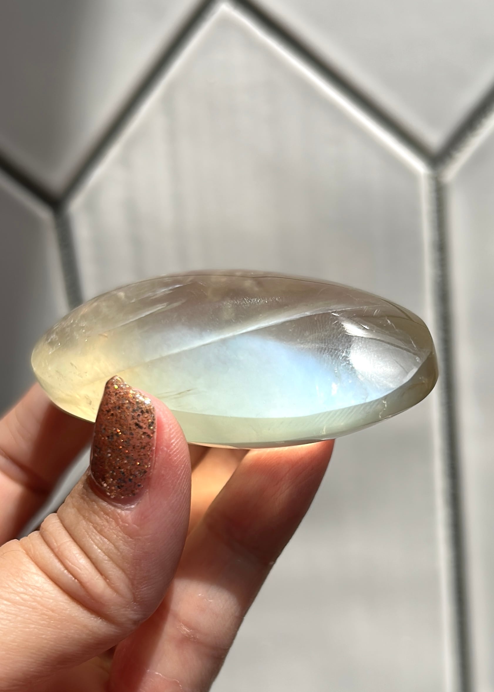 角度を変えるたびに、ほのかに青く白い光が静かに揺らめくロマンティックで神秘的な雰囲気を纏ったクリアなグリーンムーンストーン!その世界観がもう当店のセレクトにハマりすぎて、沢山仕入れたかったのですが当店では4個のみの入荷となりました…泣