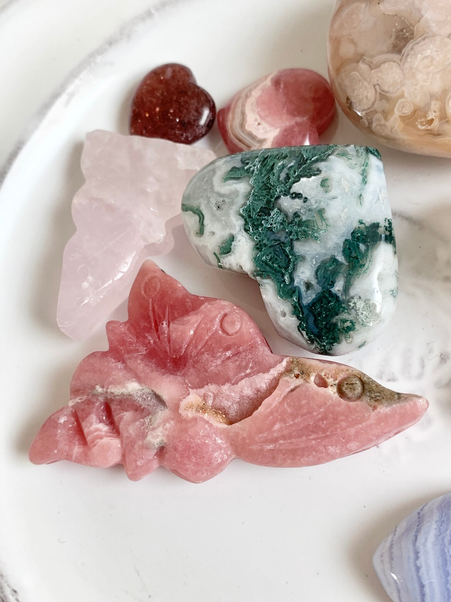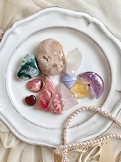 愛の石ロードクロサイトの薔薇色フェアリー、幻想的なアメジストムーンやフラワーアゲート、森をイメージさせるモスアゲートなどおとぎの国から飛び出してきたような石達をセットにドリーミーな世界観をお楽しみください♪