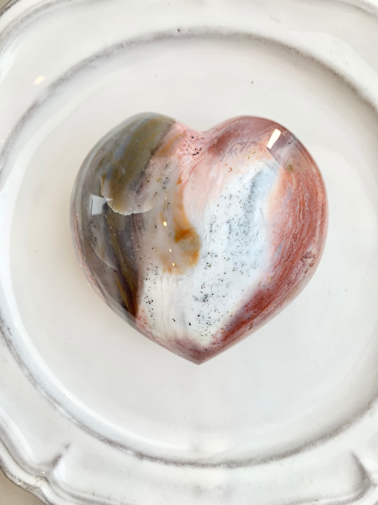 オーシャンジャスパー・ビッグハートのご紹介です♪ ボリューミーなオーシャンジャスパーハートポリッシュ、②のピースは山吹色やグレーピンク、赤味の強いオレンジなどが層になった美しいピースです。グレーとホワイトの層の部分には微細なラメがちらちらと舞っています。