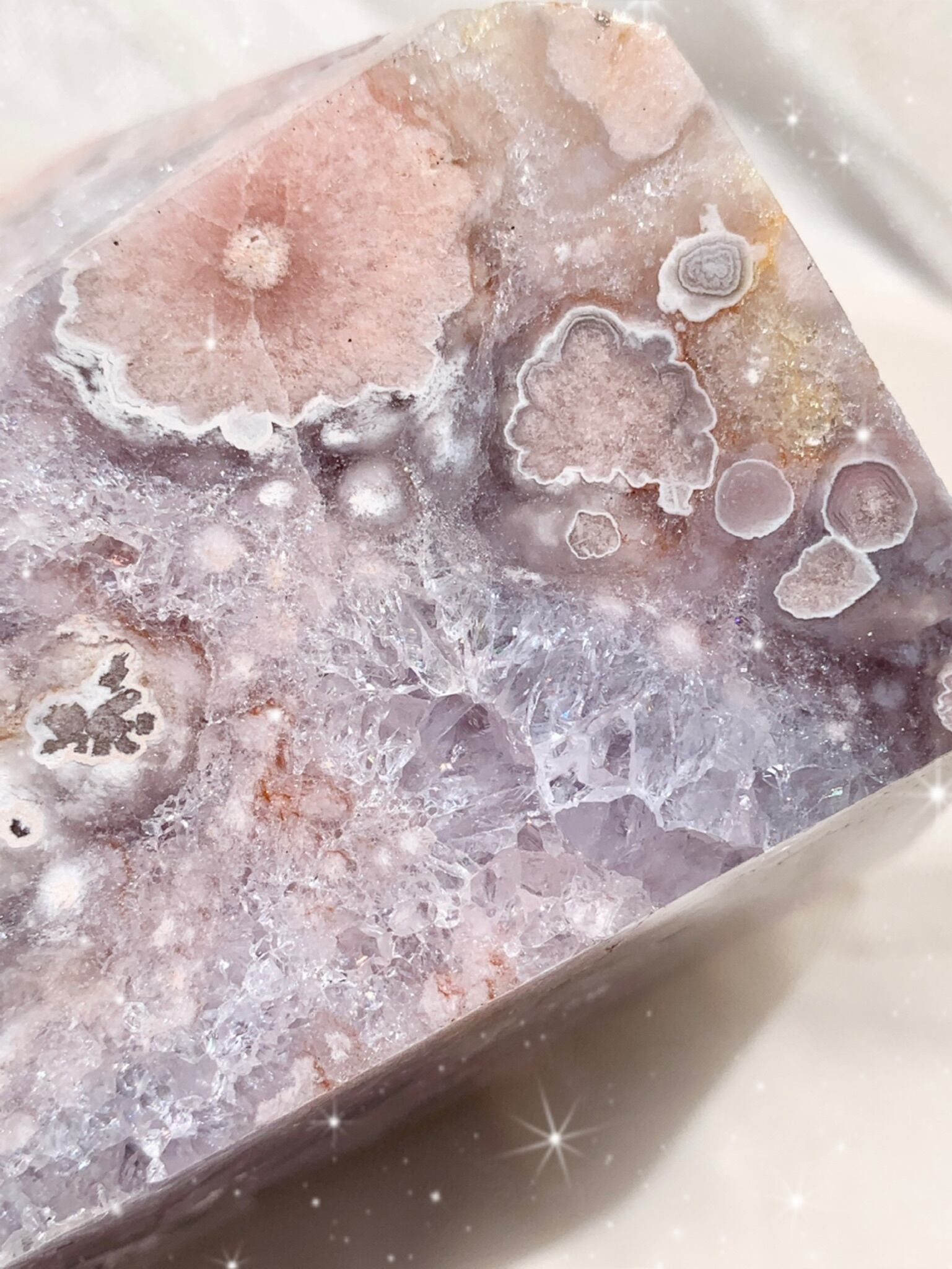美しいフラワー結晶が沢山!!ビッグサイズのハイクォリティ アメシスト×フラワーアゲートのタワーのご紹介です♪ なんてドリーミィーな世界観のタワーなんでしょう!とにかくもう美しい、この言葉に尽きる素晴らしいピースです。光を受けてキラキラと沢山に輝き、アメジストベースにサーモンピンクのお花を纏ったその姿はまるで妖精の国の塔のよう。ドリーミーな魅力溢れる本当に美しいタワーです。