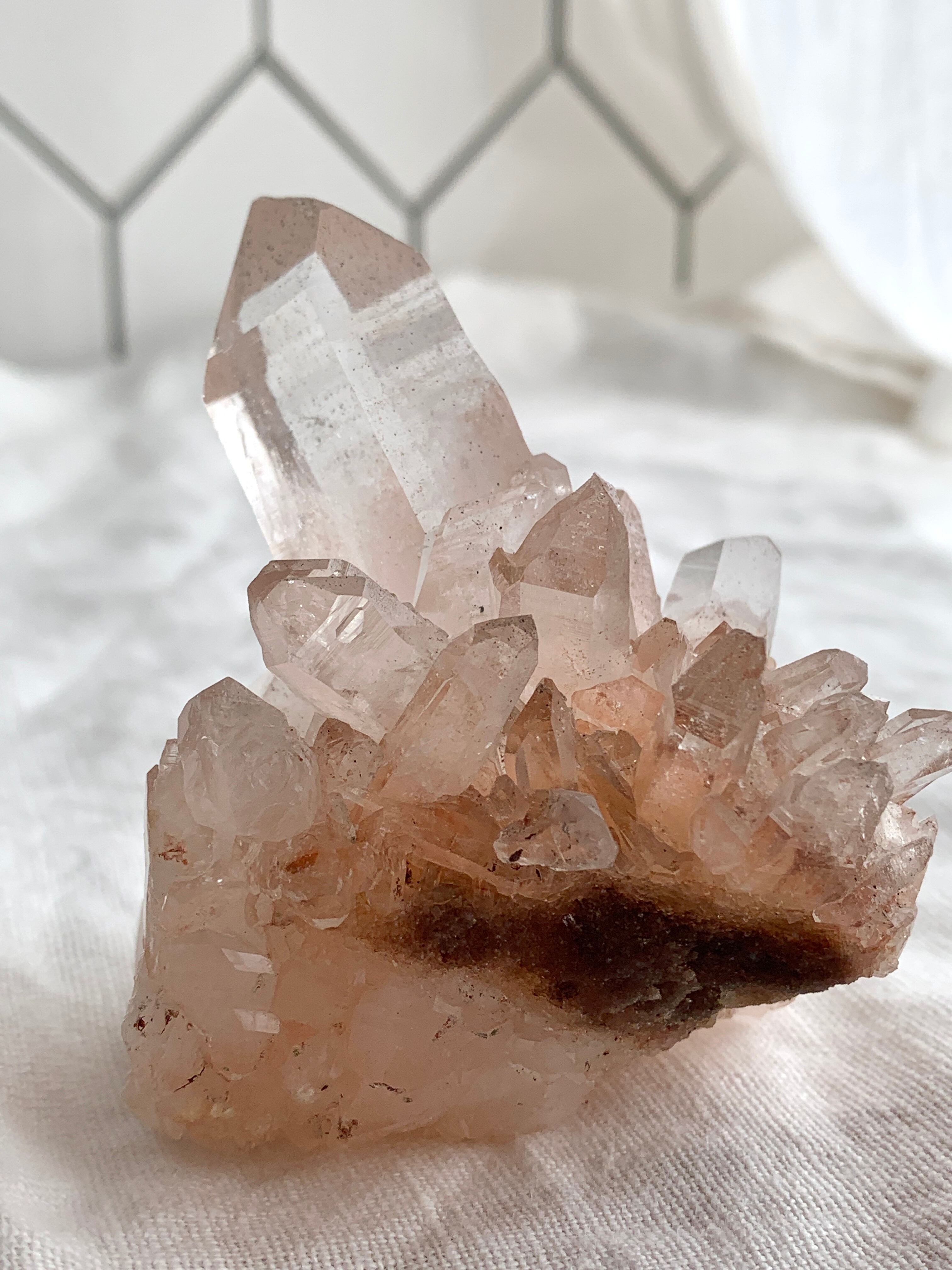 ヒマラヤ山脈で産出される水晶の中でもマニカラン水晶はエネルギーが強いと言われ、酸化鉄を含んだ土の影響で淡いピンクやオレンジがかった優しい色合いをしているのもあり人気の水晶です。