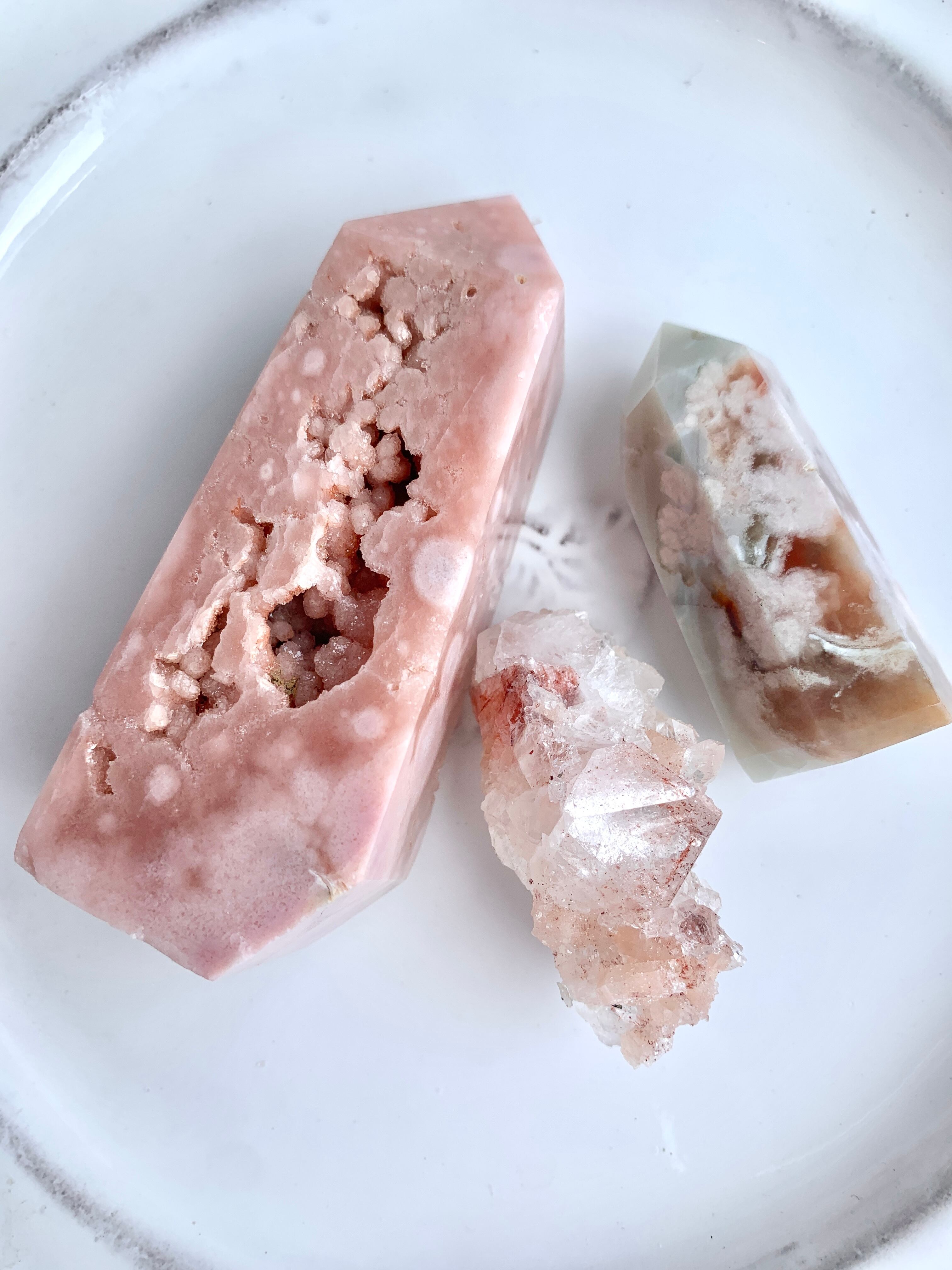 キラッキラのドゥルージーの煌めきが眩しいピンクカラーのフラワーアゲートタワーと大人気グリーンフラワーアゲートのミニポイント、希少なミニドゥルージーアポフィライトの3点をセットにした『手のひらの宝物セット』どのピースも大変美しいよくばりなセット♪