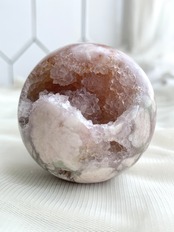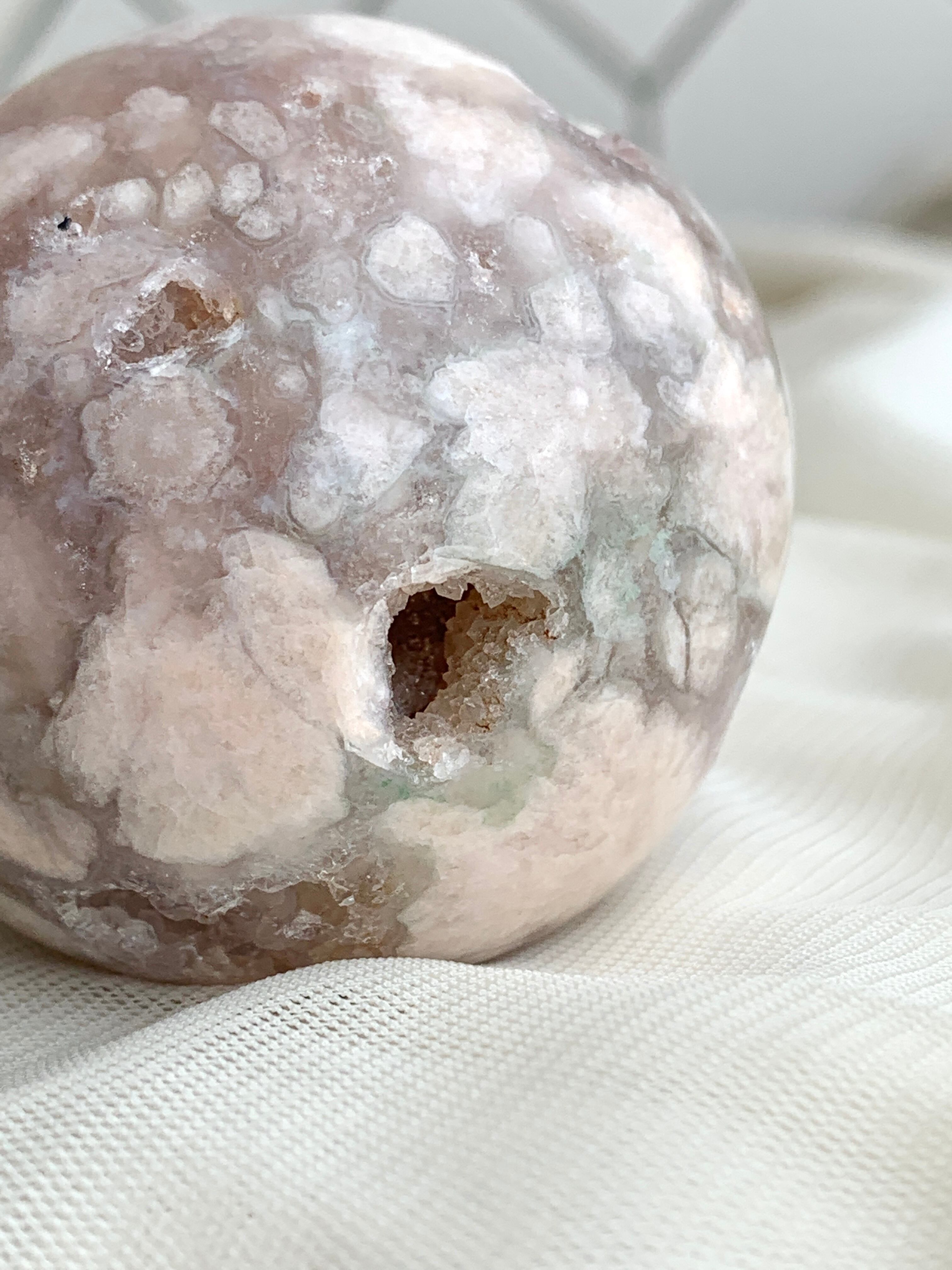 とっても可愛いらしい形状のスフィアですが、ドゥルージー部分が少しマットがかっているので、キラキラ感は控えめ…ですがこんぺいとうのような結晶や愛らしいフラワーアゲートの模様が沢山詰まった可愛いスフィアです♪