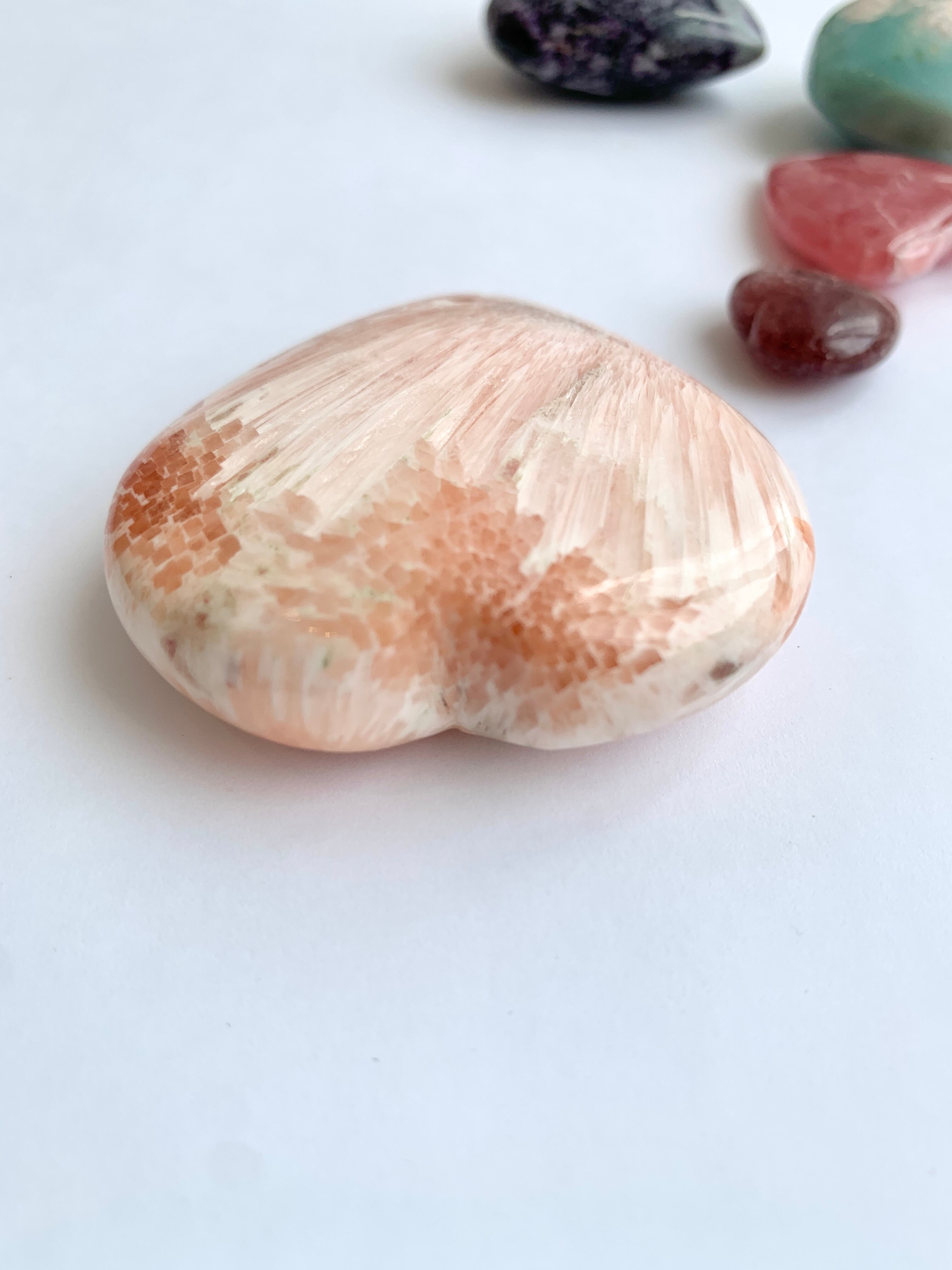 インド産のピンクスコレサイトはシルクのように艶やかに光る部分とジューシーなオレンジカラーのコントラストがとても美しい大きめハート♪