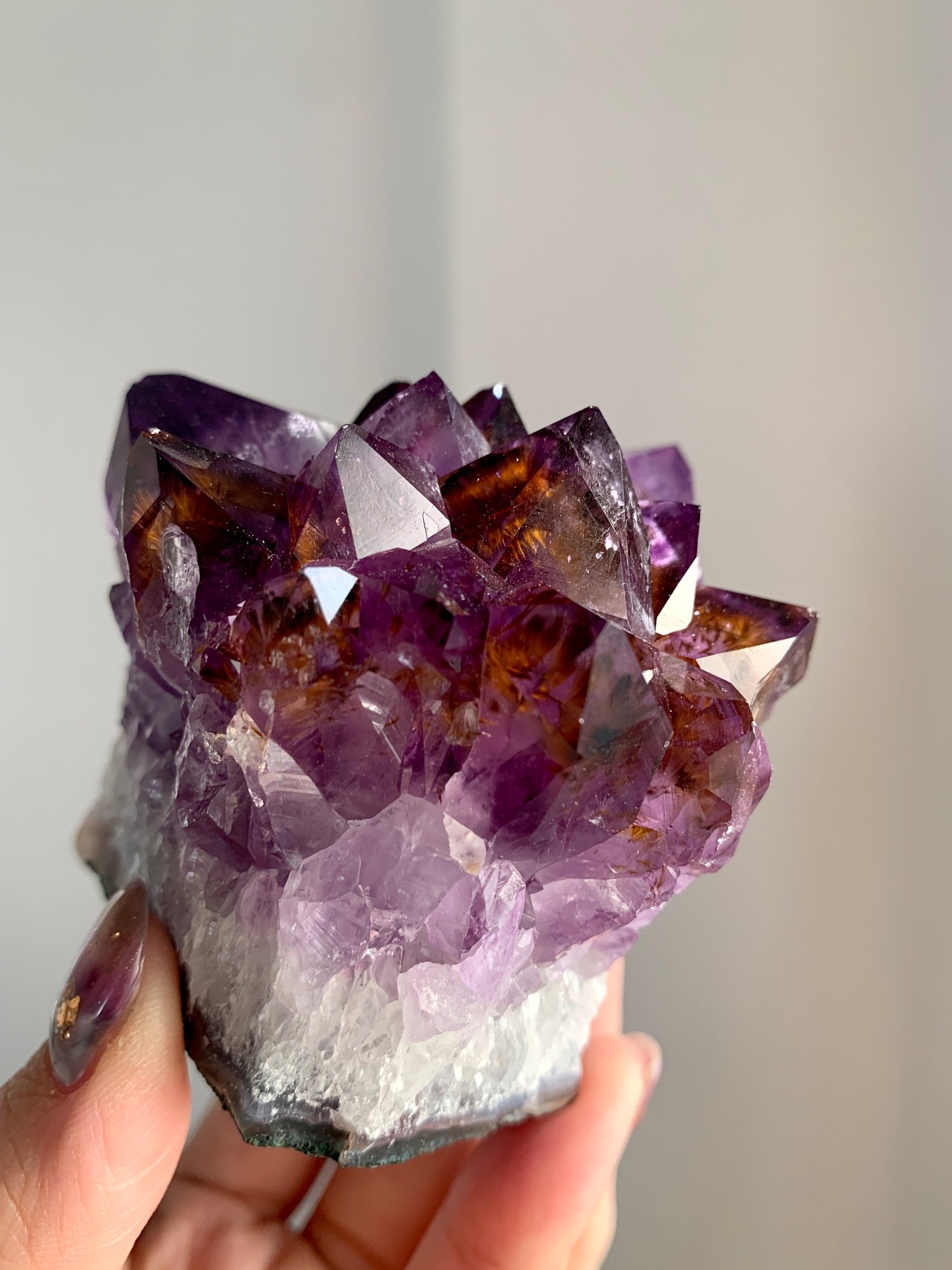 太陽光に透かせてみたりデスクライトに照らしてじーっくりと眺めてみましたら、ただただ美しい見惚れたまま静かに時間が過ぎてゆく、なんて贅沢な自分時間。。。アメジストの澄んだパープルにの中に鮮やかなゲーサイトのオレンジが浮かび上がる姿は魔法にかかったようでもあります。