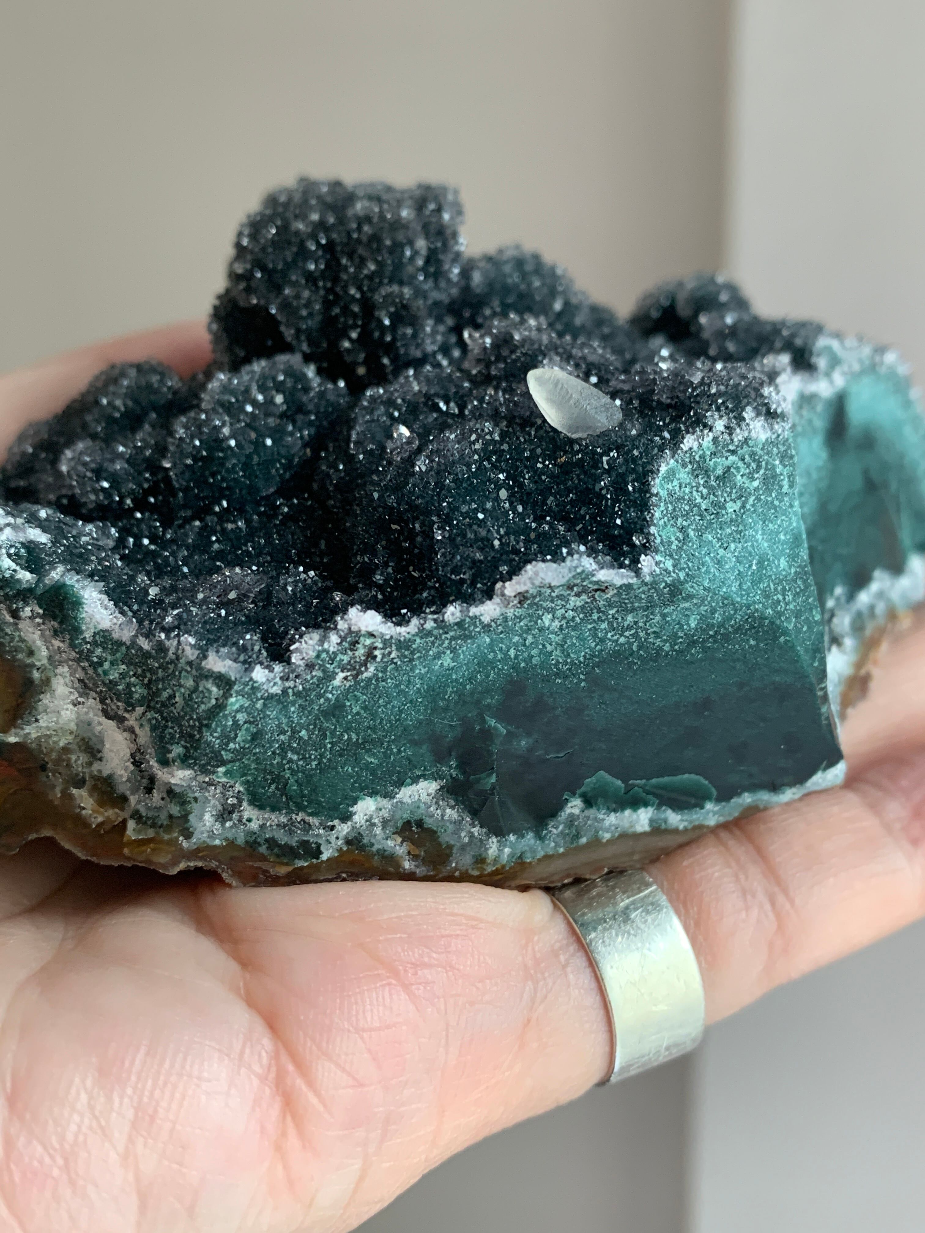 ドゥルージーのなかでも人気が高いグリーンカラーですが、さらに珍しいのが母石部分、瑪瑙ではなく何らかの鉱物によってマットなグリーングラデーションの層になっているのです。マラカイトにとても似ていますね(別物ですが)