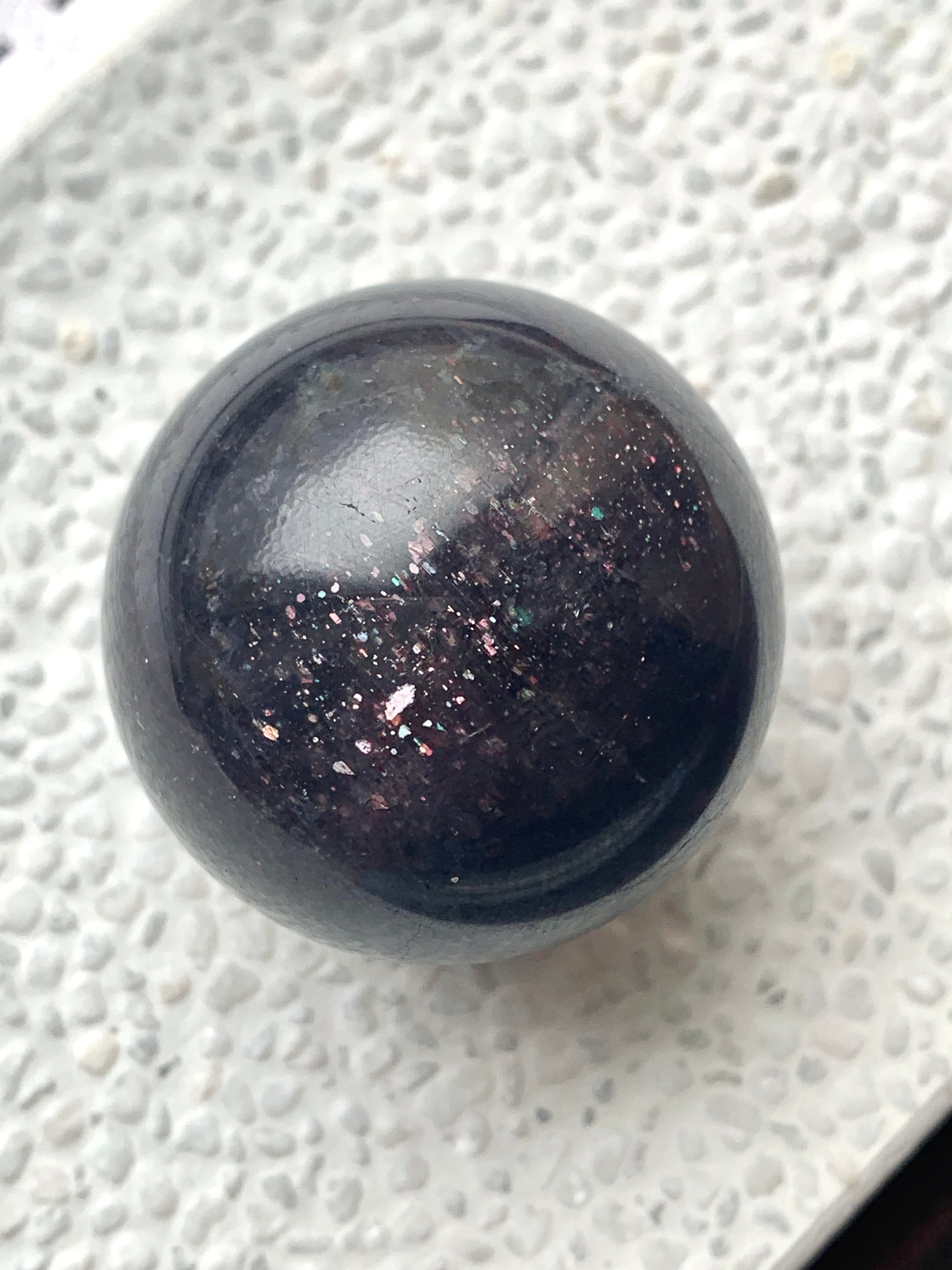 Bのスフィアは石の色ムラが少ない全体的に深いネイビーカラーのものを選んで仕入れたハイクオリティ・ピースになります。深みのあるネイビーベースにキラキラなアベンチュレッセンス効果で宇宙感が強いアイオライトです。