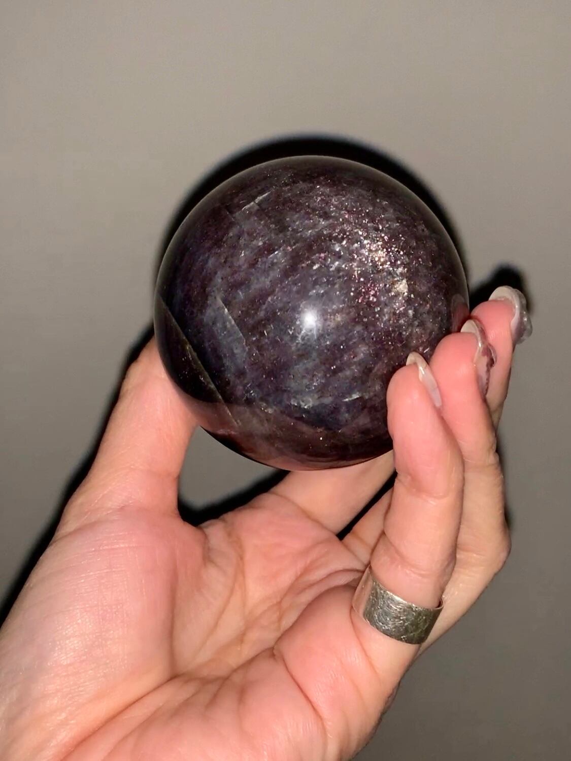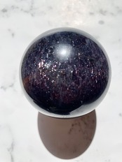 レピドクロサイトがギュギュっと沢山内包されていて、アベンチュレッセンス効果が素晴らしいハイクォリティ・スフィア、その輝きは動画の方が十分にお伝えできるかと思いますので、ぜひご覧になって下さいね。(動画は夜間に電気を消した状態の暗いお部屋で携帯ライトをつけながらの撮影したもの、日中の窓際、デスクライトの下などで撮影しております。)