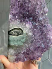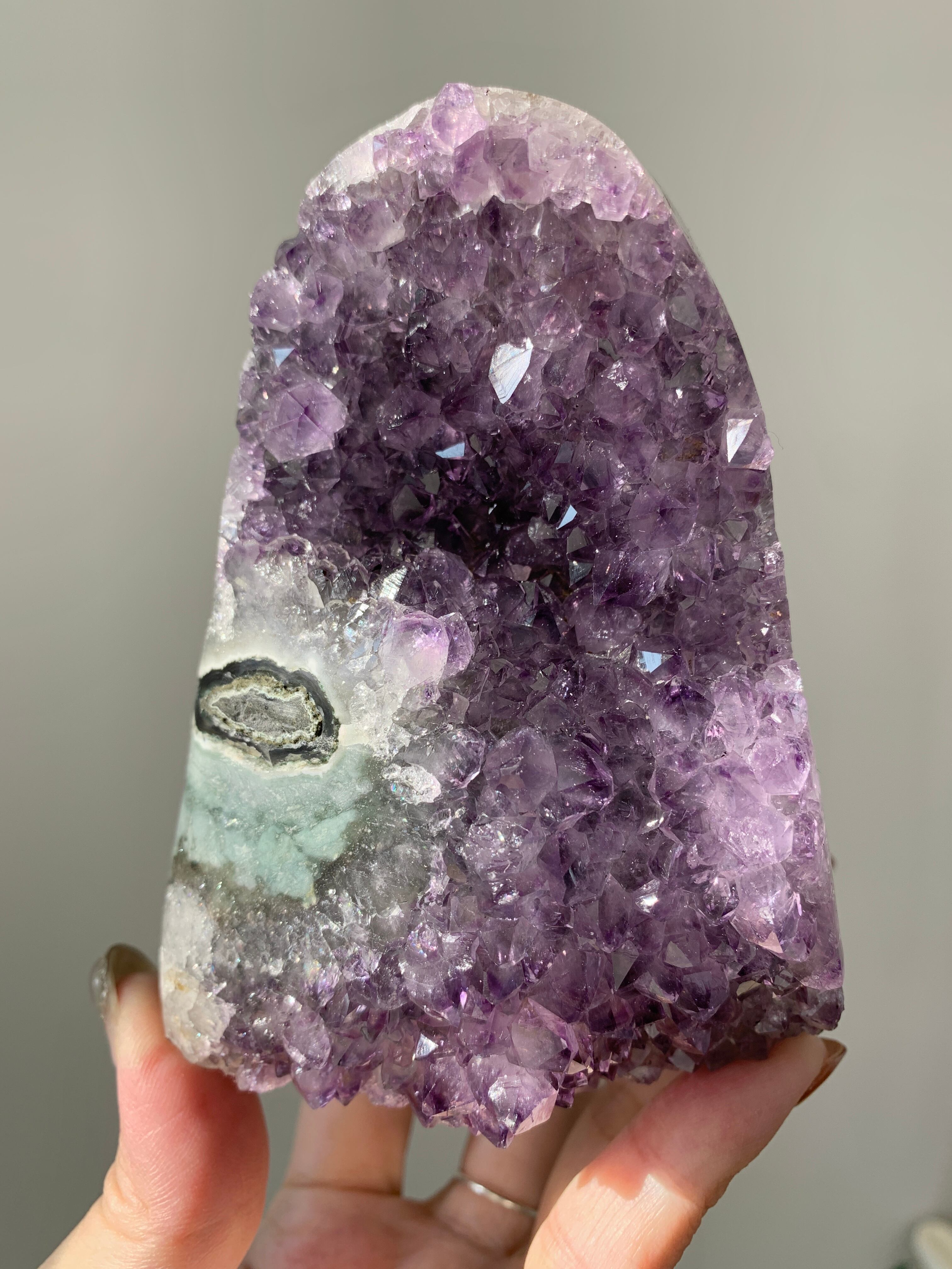 ウルグアイ産らしい(中でも特にこの販売元さんが取り扱っているアメジストは結晶がほんと艶々なんです)艶ピカの結晶にセージグリーンのスタラクタイト・アイ(ウルグアイの業者さん呼び 笑)が正面から見える素敵なピース!