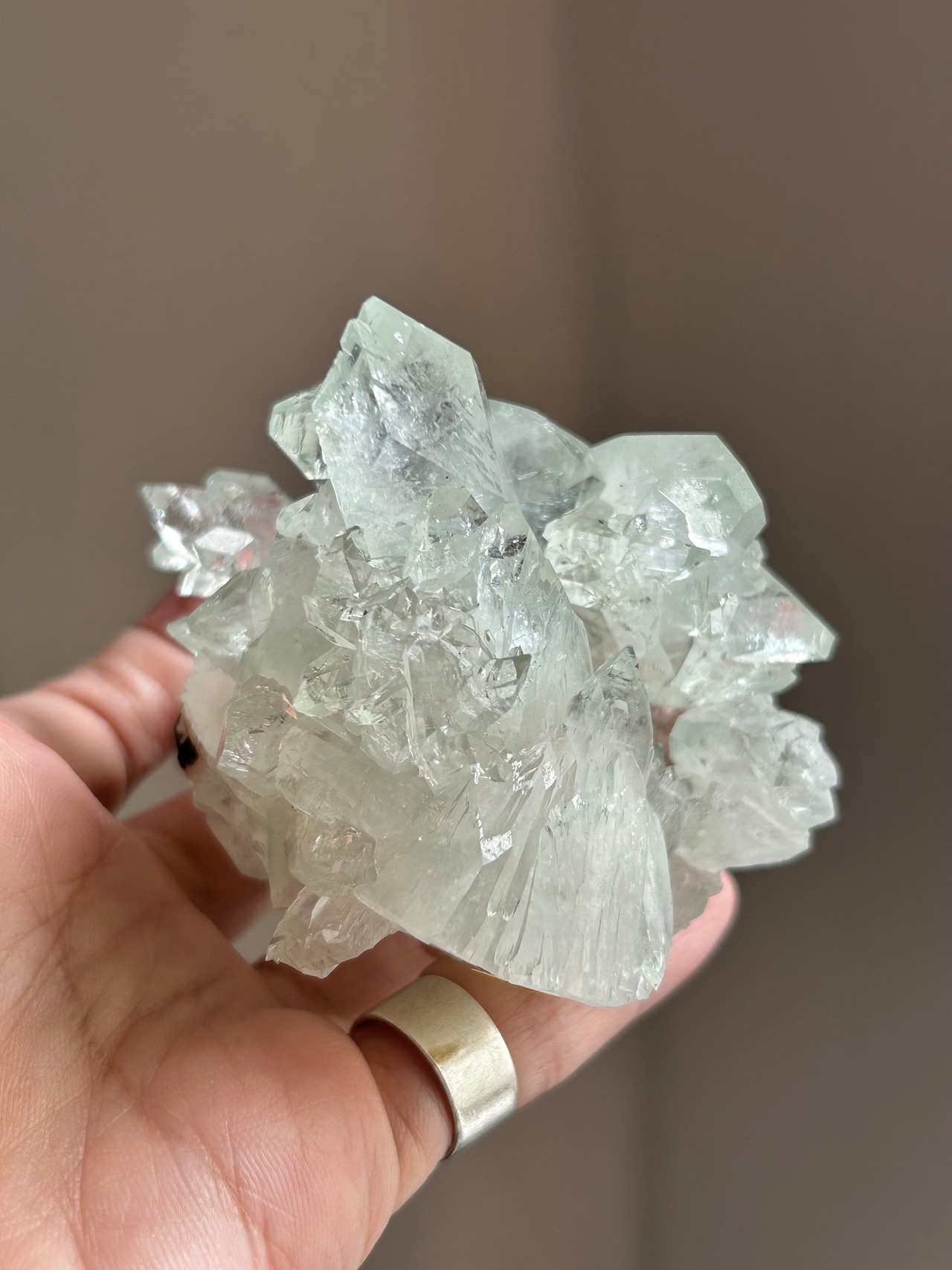 瑞々しい淡いミントグリーンカラーのアポフィライトのご紹介です。艶やかでジュエリーのように煌めく結晶はほんのり淡いミントグリーンカラーをしており、爽やかな透明感と鏡面のように輝き光を反射する大変美しいアポフィライトです。