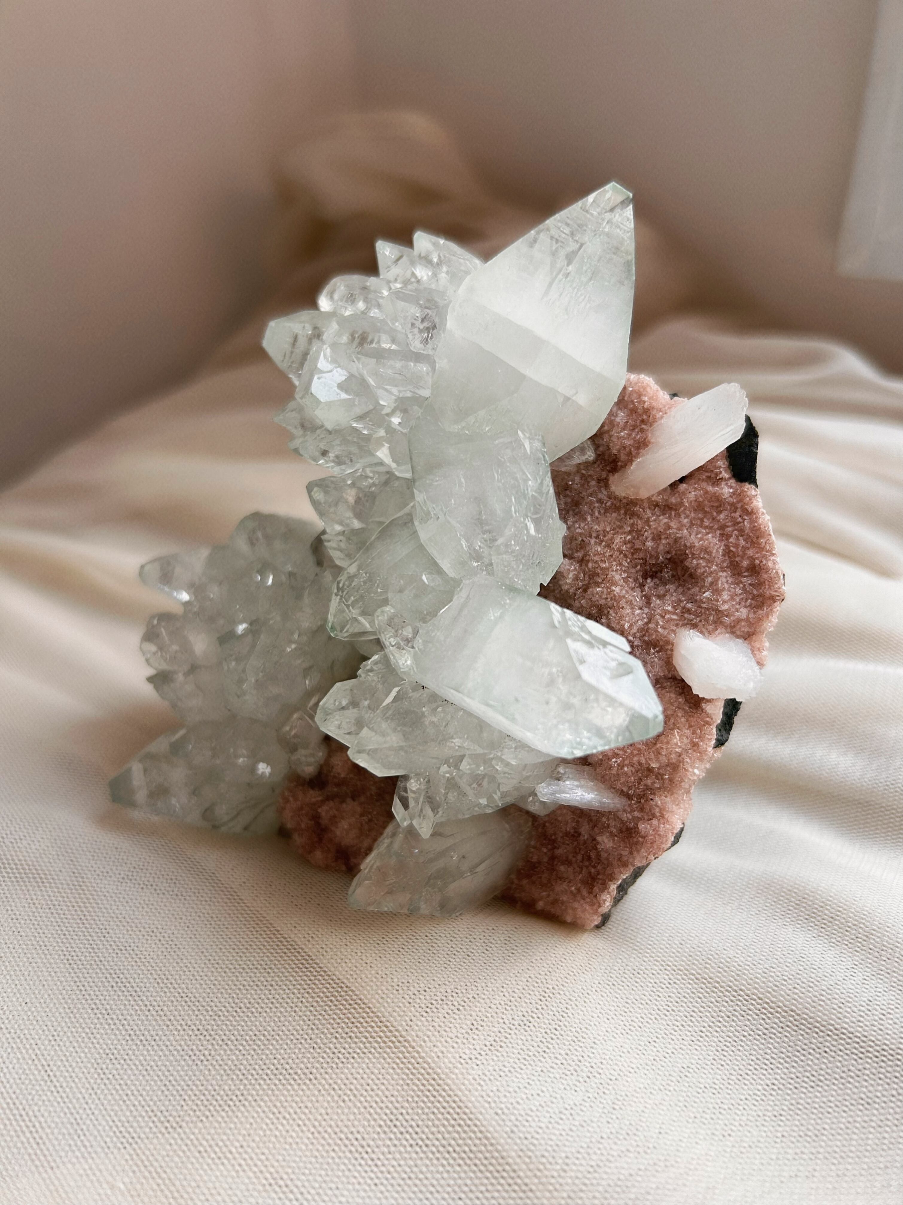 瑞々しい淡いミントカラーのアポフィライトのご紹介です。シルバーの光を自ら放つように煌めく結晶はほんのり淡いミントグリーンカラーをしており、爽やかで涼やかさを感じる存在感ある結晶が鏡面のように輝き光を反射する大変美しいアポフィライトです。母石はマイクロヒューランダイトでくすんだベージュピンクカラー。母石部分のきらきらベージュピンクが美しいアポフィライトのカラーをさらに際立たせています。