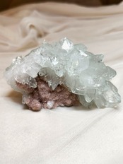 瑞々しい淡いミントカラーのアポフィライトのご紹介です。シルバーの光を自ら放つように煌めく結晶はほんのり淡いミントグリーンカラーをしており、爽やかで涼やかさを感じる存在感ある結晶が鏡面のように輝き光を反射する大変美しいアポフィライトです。母石はマイクロヒューランダイトでくすんだベージュピンクカラー。母石部分のきらきらベージュピンクが美しいアポフィライトのカラーをさらに際立たせています。