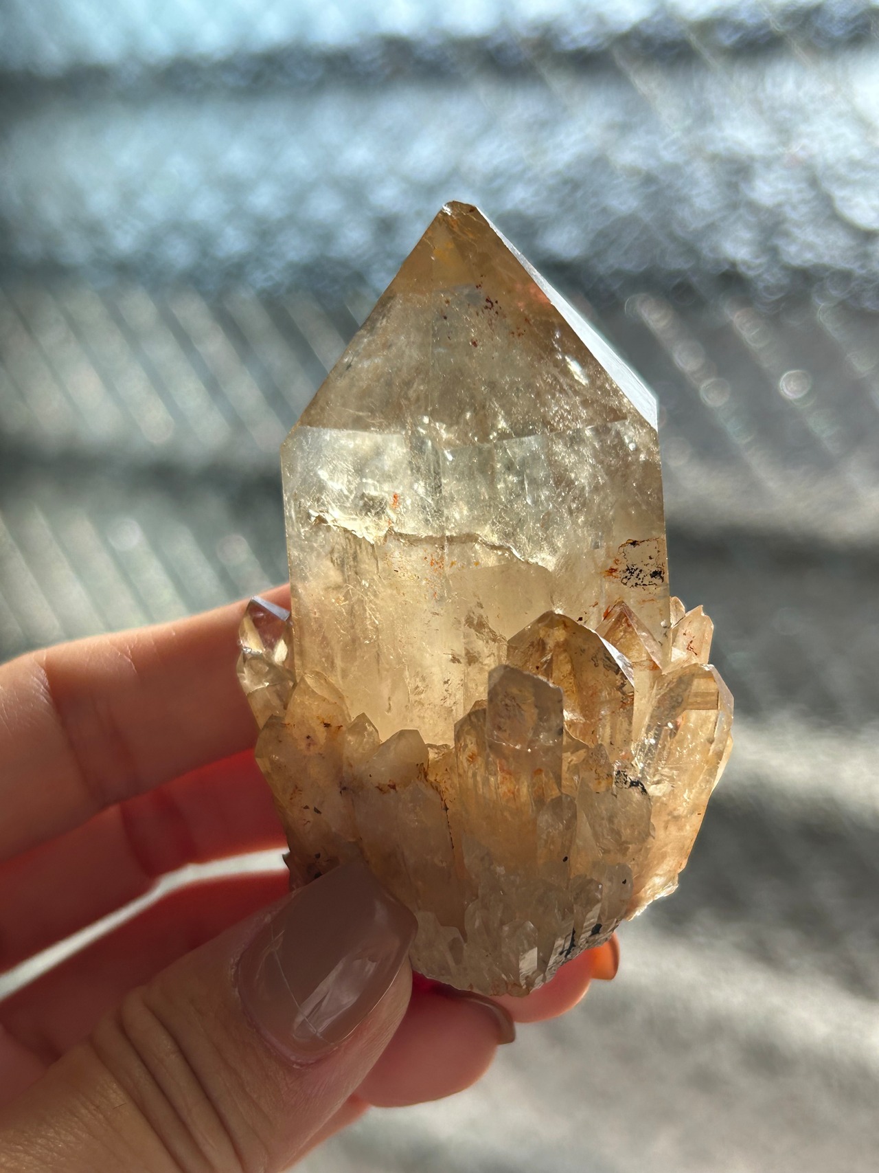 透明感があるスモーキーシトリンカラーが大変美しいクンダリーニクォーツ。太陽の光にかざすと黄金の蜜のように艶めく結晶が素晴らしく、手のひらにしっくりと馴染む大きさや触り心地も魅力の一つです。