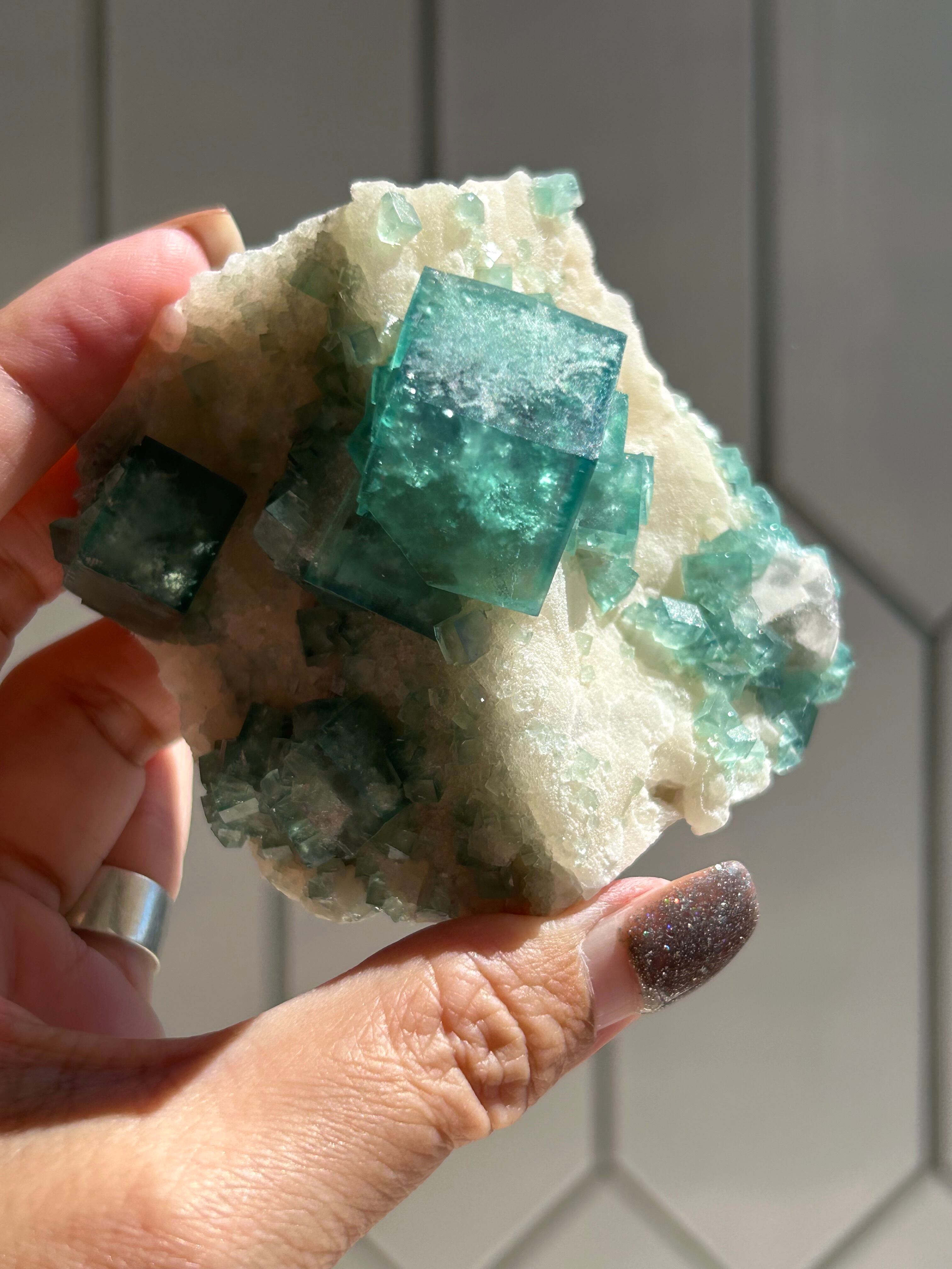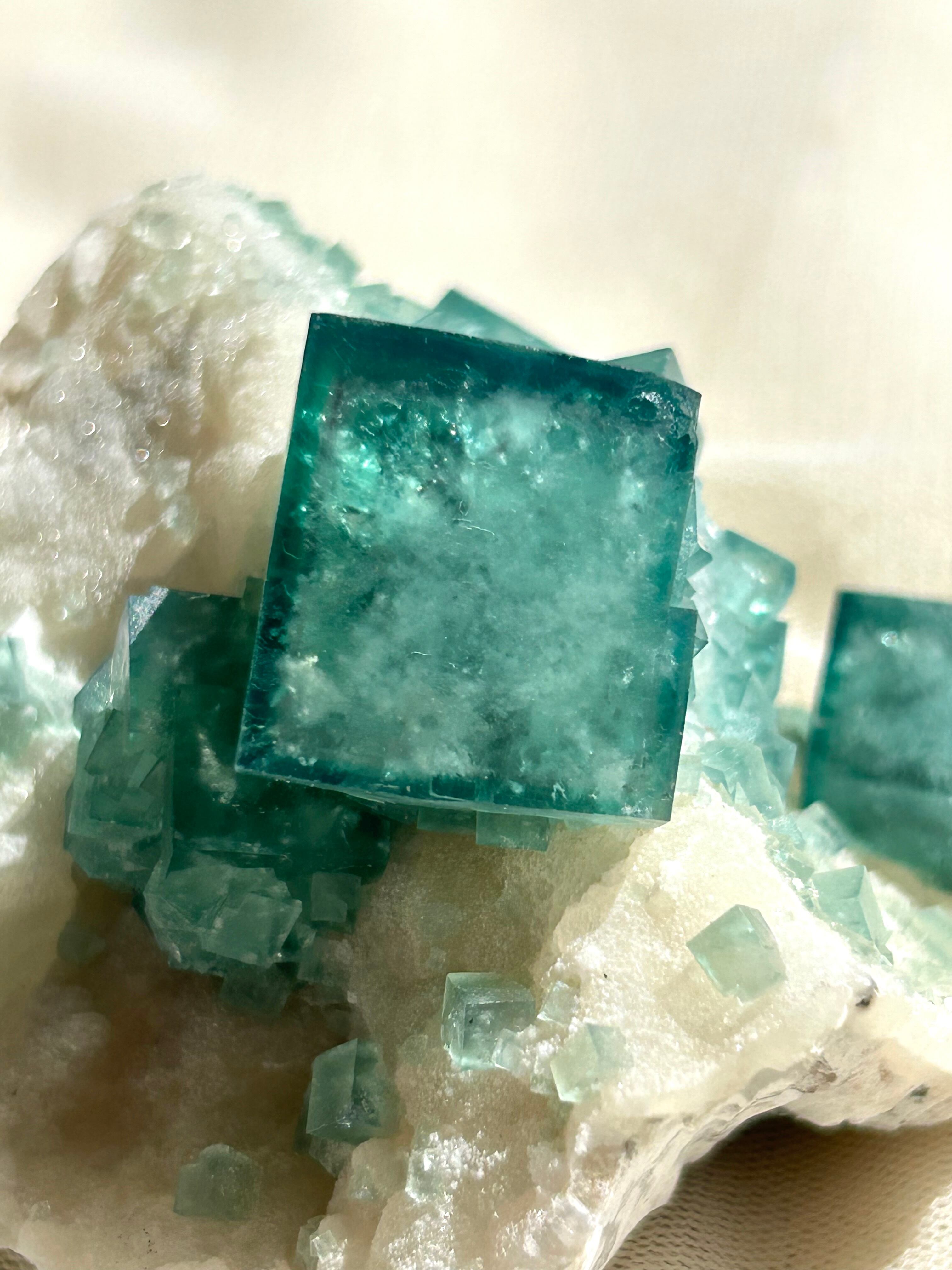 ゴロゴロっと母石に転がるキューブ結晶、母石がホワイトカラーなので美しいエメラルドグリーンがさらに際立ち、メインのキューブには太陽光が当たると水面のような煌めきが浮かび上がります。