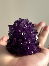 ハイグレードのアメジストならではの透明感と深みのある紫色と艶やかな結晶、スタラクタイトらしい整った完璧なフォルム!フルコンプリートピースはなかなかレアでございます^_^ 華やかな赤みのあるパープルカラーで照りが強く、ライトの下でも太陽光の下でも素晴らしい煌めきを見せてくれます。とにかく美しい!!!